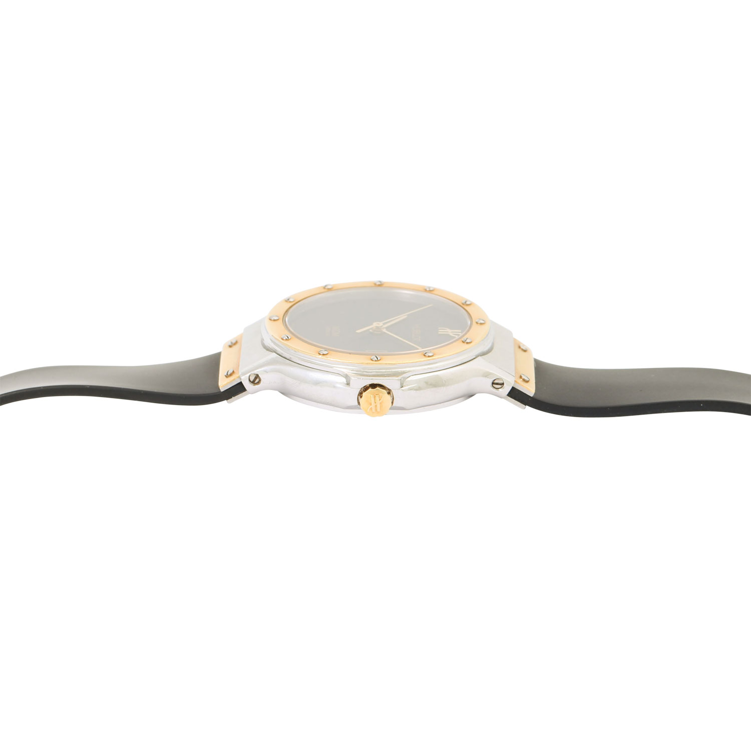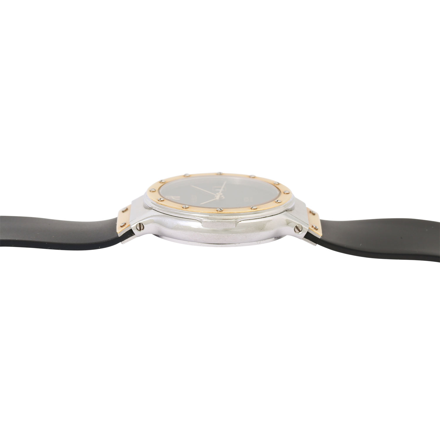 Edelstahl/Gelbgold. Kautschuckband mit Faltschließe. Seriennr. 268506. Quartzwerk Kal. ETA 956.112 mit neuer Batterie in funktionstüchtigem Zustand. Schwarzes Zifferblatt mit Datumsfenster. Die Uhr ist in gutem Zustand mit nur leichten Tragespuren am Gehäuse. Original Box mit Umkarton, Garantiezertifikat und Anleitung anbei. Durchmesser ca. 28 mm ohne Krone. Passend bis zu ca. 15,5 cm Handgelenkumfang.