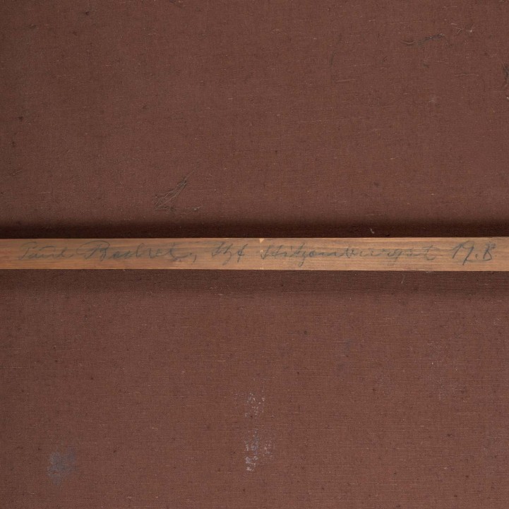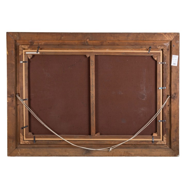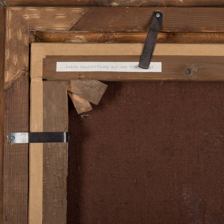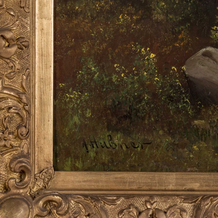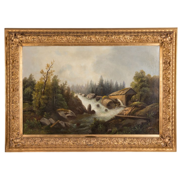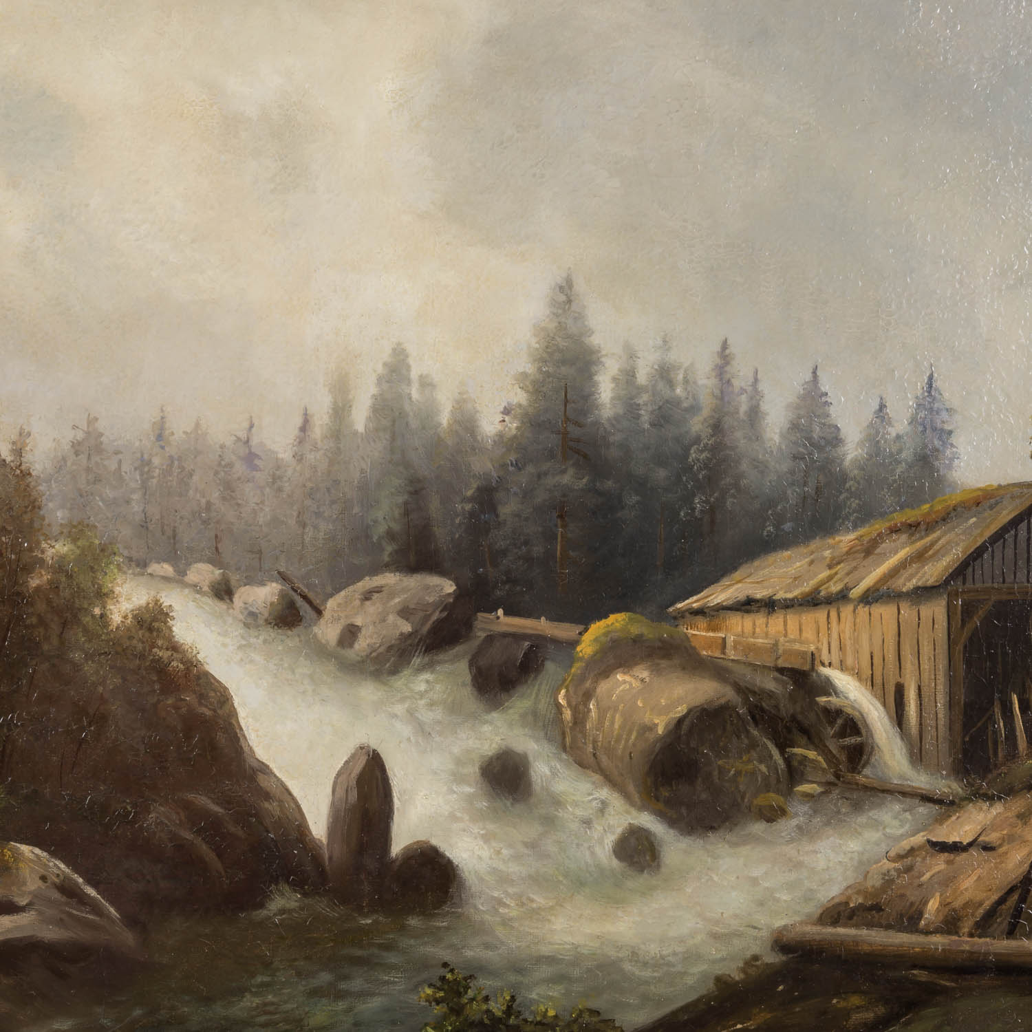 Dargestellt ist eine naturgewaltige Landschaft im typisch melancholischen Stil der deutschen Romantik, herbstlich-düster und mit starken Naturmotiven, wie dem reißenden Fluss und den großen Felsblöcken, neben denen eine kleine, verlassene Mühle und 2 Figuren verletzlich und verloren wirken. Unten links signiert: 'A.Hübner', Öl auf Leinwand, ca. 69 x 105,5 cm, (mit Prunkrahmen 95x131,5 cm). Besch.
