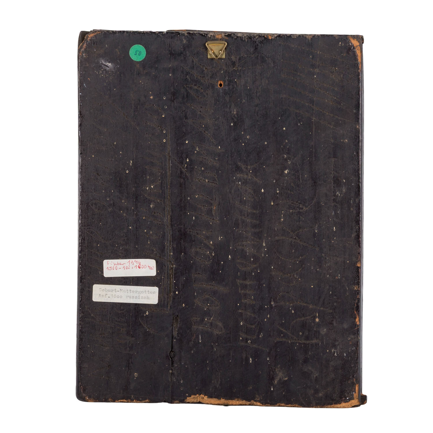 Darstellung mit der Heiligen Anna und dem Heiligen Joachim in Kirchenarchitektur, mit Bezeichnung in Kirchenkyrillisch, Tempera und Vergoldung über Kreidegrundierung auf Holztafel (mit zwei Stirnseitensponki), HxB: ca. 29x23 cm. Alters- und Trocknungsspuren, part. Craquelé und Farbabplatzer. VERSO kyrillische Ritzbezeichnungen.