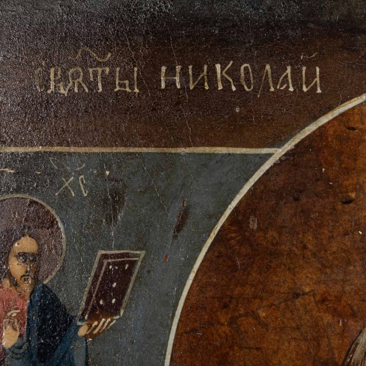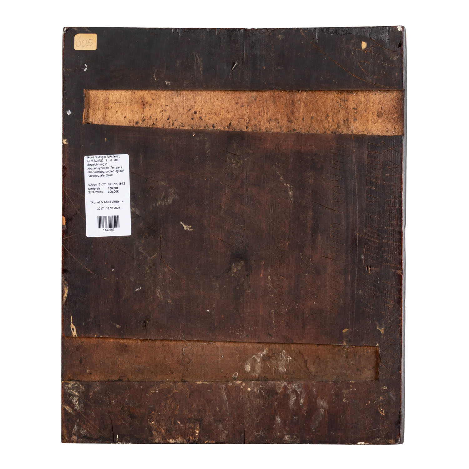 mit Bezeichnung in Kirchenkyrillisch, Tempera über Kreidegrundierung auf Laubholztafel (zwei Rückseitensponki fehlend), HxB: ca. 41x34 cm. Alters- und Trocknungsspuren, part. überarbeitet.