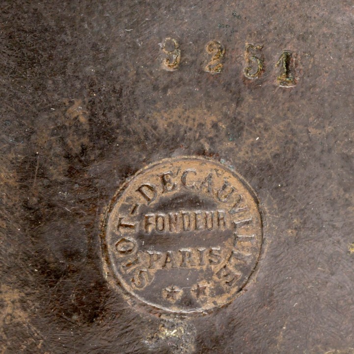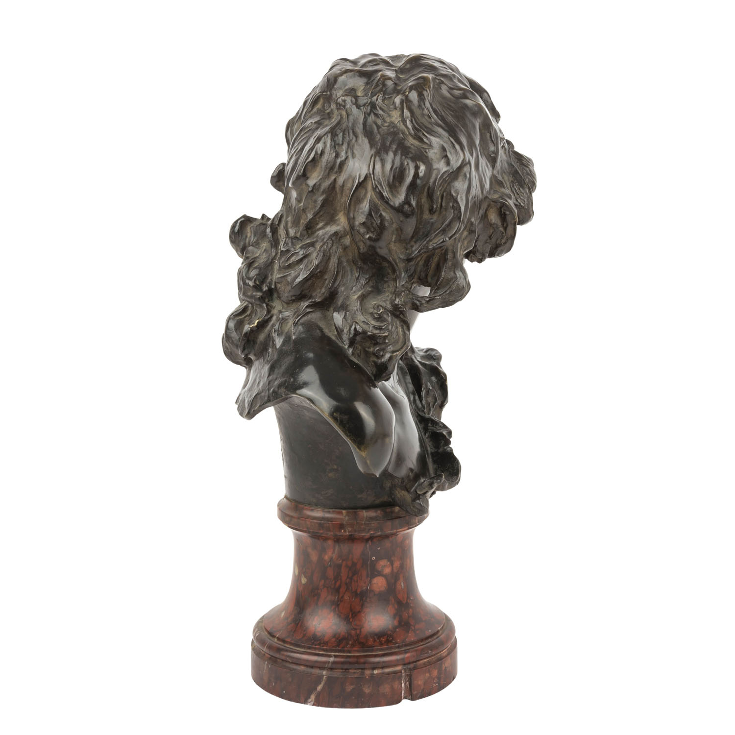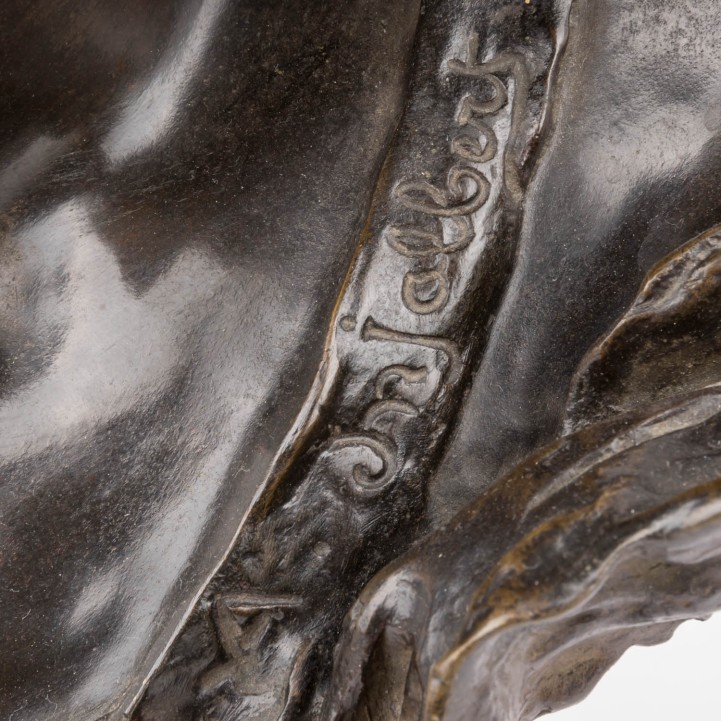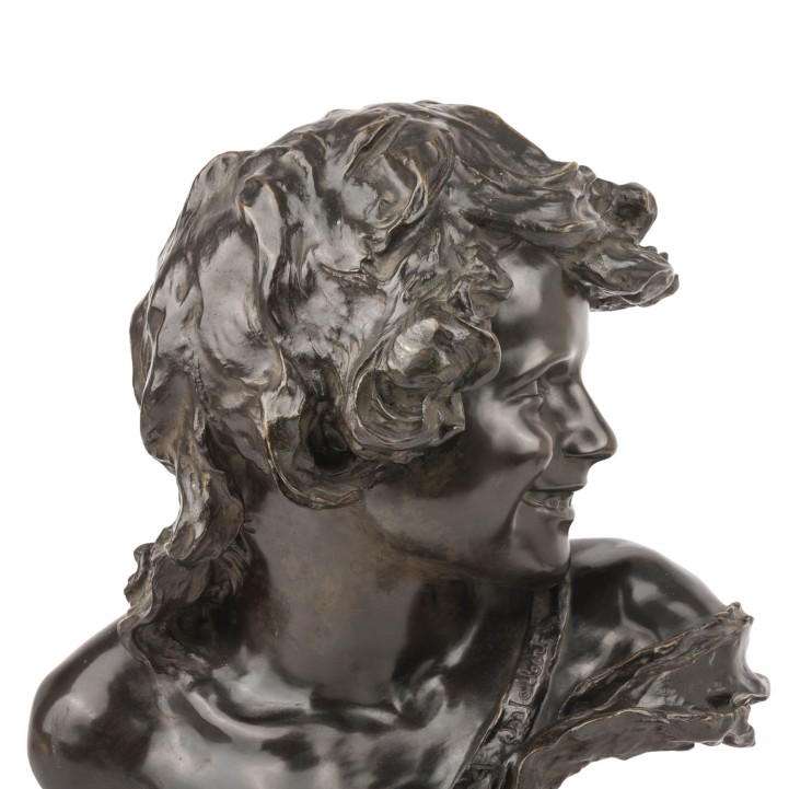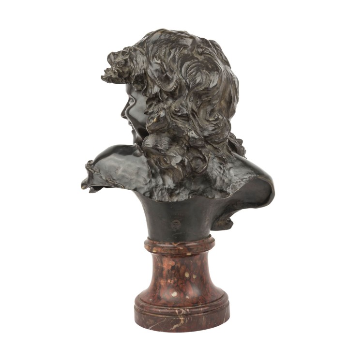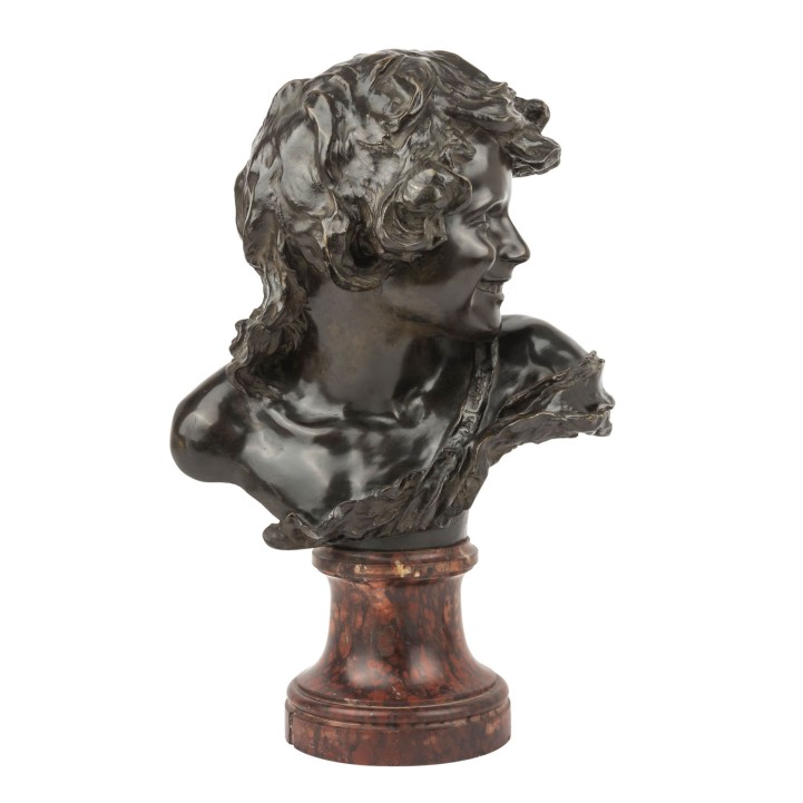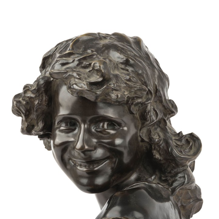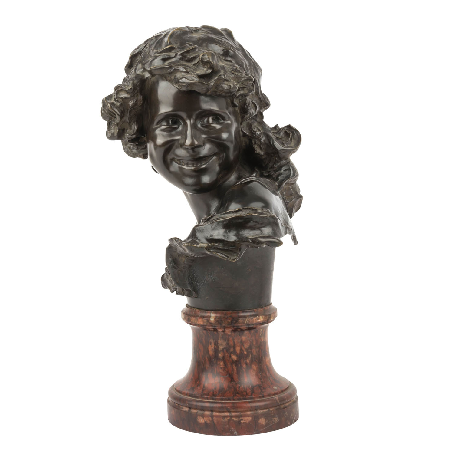 Bronze auf Steinsockel, Halbbüste eines lachenden Kinds mit lockigem Haar, bezeichnet 'A. Injalbert', rückseitig mit Gießerplakette 'SIOT-DECAUVILLE FONDEUR PARIS', nummeriert '9254', H. ca. 49,5 cm. Sockel mit Beschädigungen, Altersspuren.