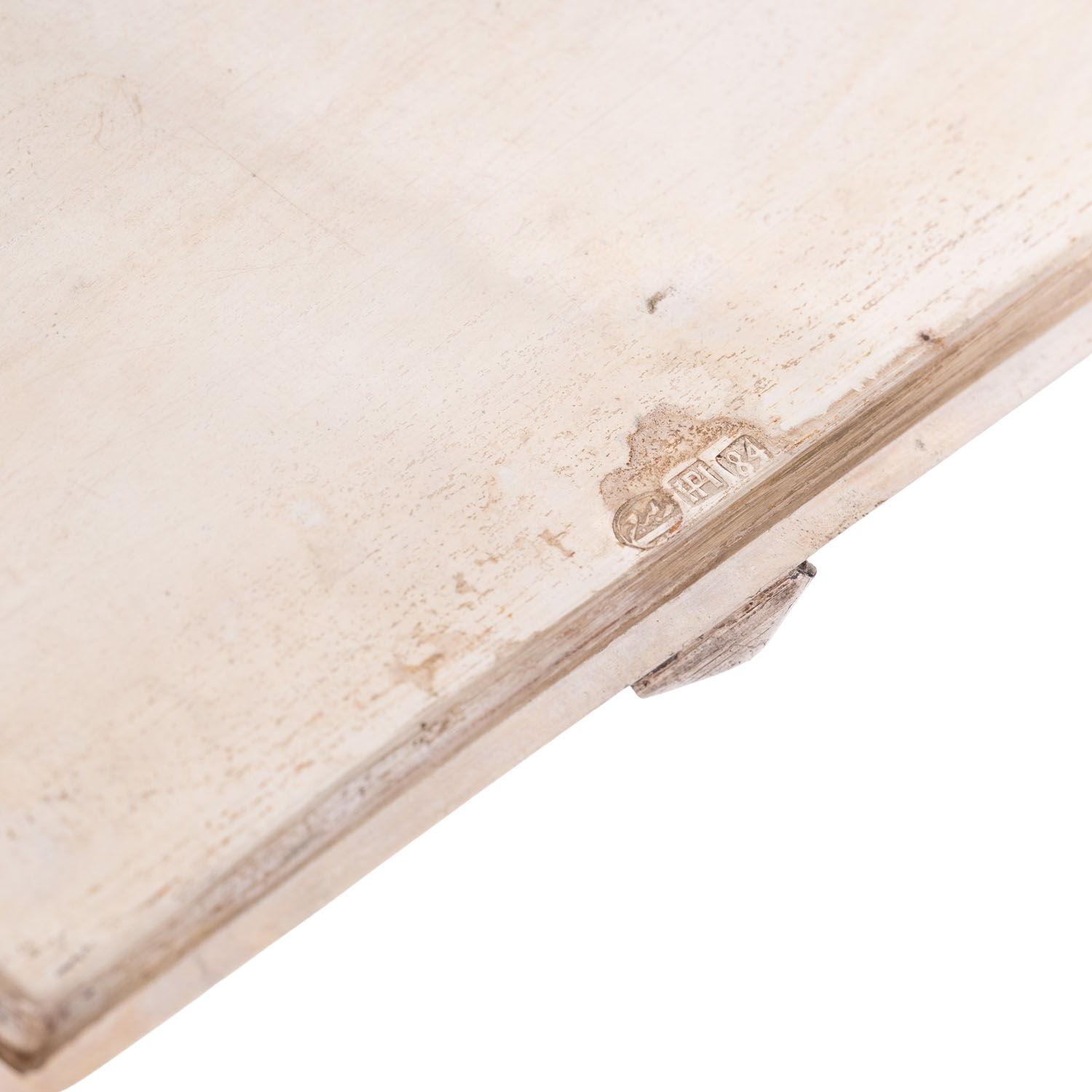 8 kleine Becher mit Innenvergoldung (H. ca. 4,5 cm), 1 Ovaltablett (L. ca. 28), 1 quadratische Deckeldose (ca. 2,5x9x9), 1 rechteckige Deckeldose (ca. 3x14x9,5), 1 runde Deckeldose (D. ca. 6,5), 1 Aschenbecher (D. ca. 10), mit üppigen symmetrischen vegetabilen Dekoren, alle Teile (außer 1 kleiner Becher) mit Punzierung '84' und 2 weiteren Marken, dazu in abweichendem Dekor 2 Gewürzstreuer (H. ca. 5) punziert '84', Gesamtgewicht ca. 1394 g. Alters- und Gebrauchsspuren.
