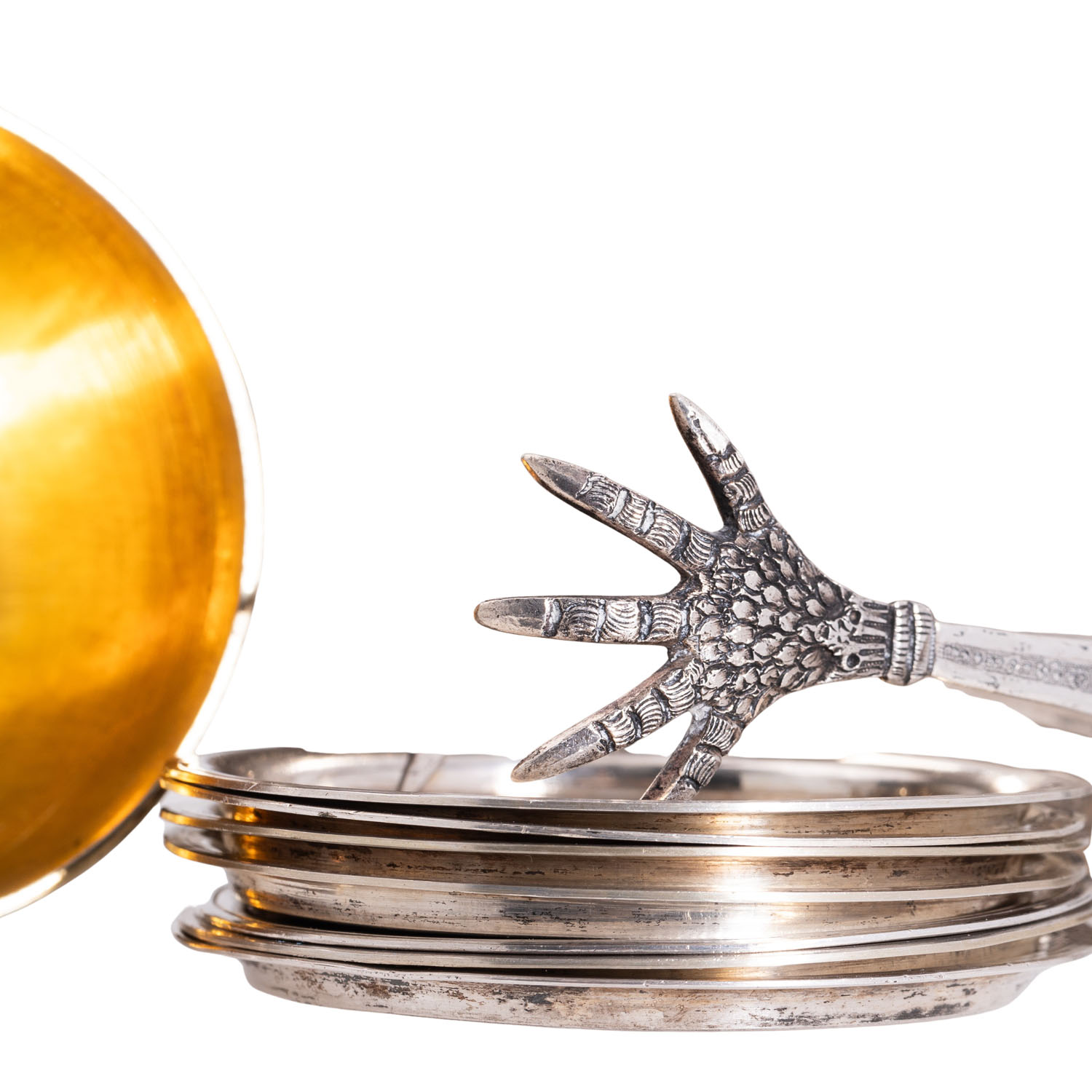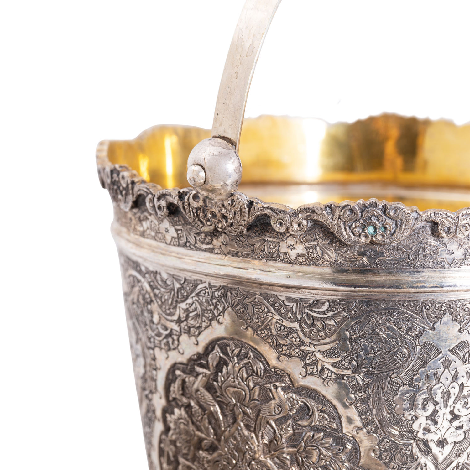 8 Becher mit Innenvergoldung (H. ca. 10 cm), 1 Becher (H. ca. 9), 7 Untersetzer (D. ca. 8), 1 Eiswürfelbehälter mit Innenvergoldung und Klapphenkel (H. ohne Henkel ca. 13) und 1 Eiswürfelzange, alle Teile mit üppigem symmetrischem vegetabilem Dekor, Punzierung '84' und 2 weitere Marken, Gesamtgewicht ca. 2138 g. Normale Alters- und Gebrauchsspuren.