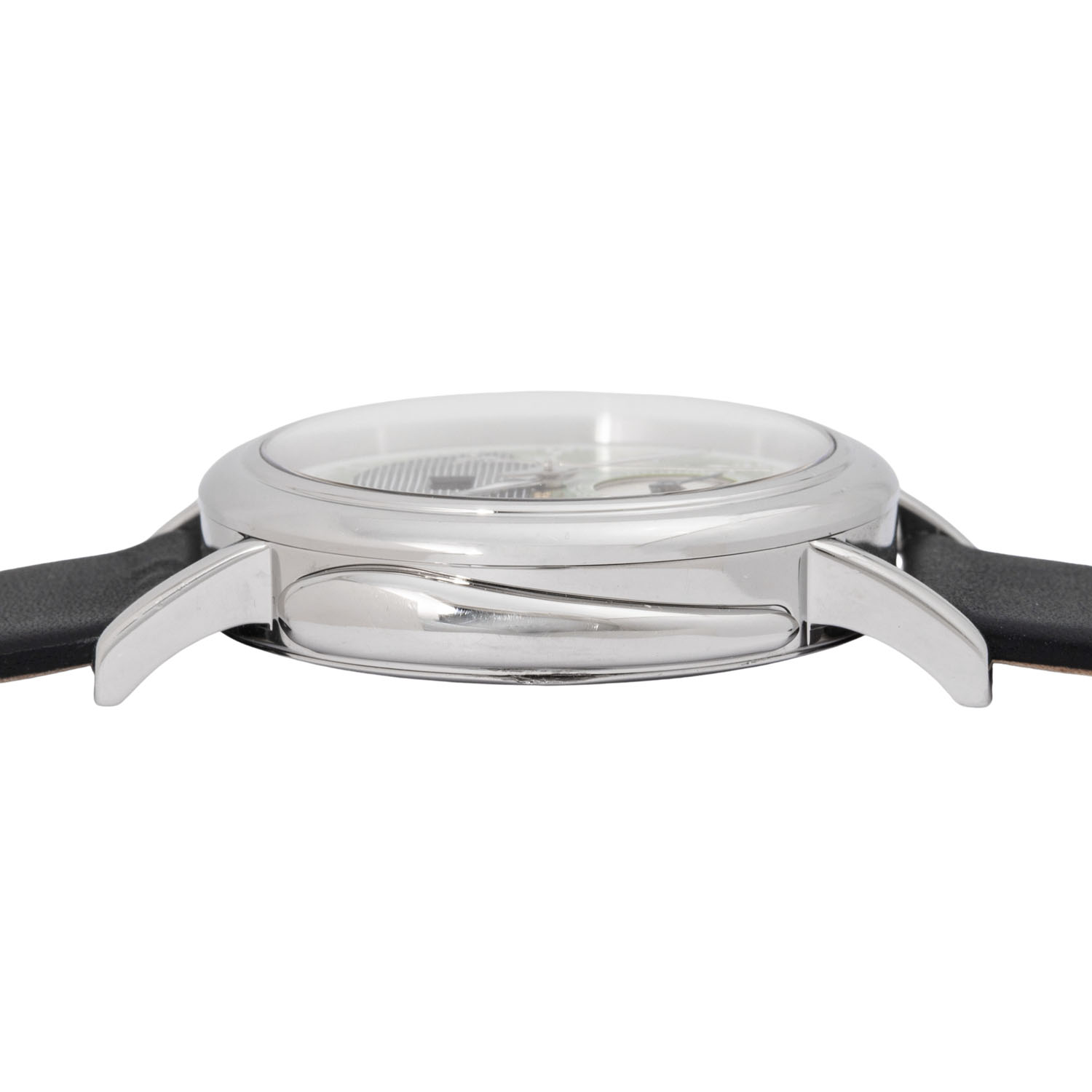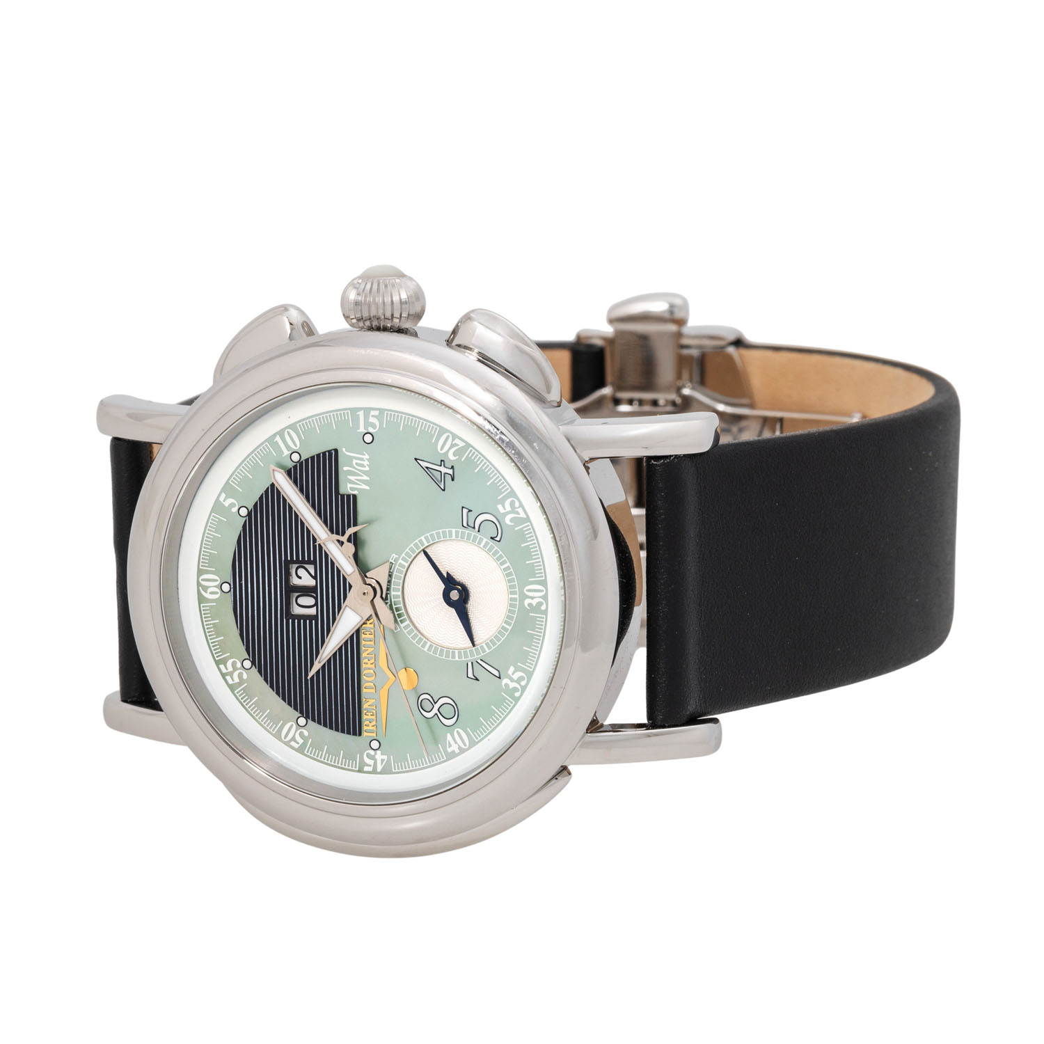 Edelstahl. Glasboden. Automatik-Werk Kal. ETA 2892-A2 mit sehr guten Gangwerten (+2 s/d, 294° Amplitude). Hellgrün-Schwarzes Perlmutt Zifferblatt mit arabischen Ziffern, zweiter Zeitzone über kleinem, guillochiertem Hilfszifferblatt und Datumsanzeige bei 12 Uhr. Zwiebelkrone mit Perlmutt Perle. Limited Edition Nr. 069 von 999 Stück. Neues Lederband mit Iren Dornier Faltschließe. Gehäuseboden mit Namensgravur. Guter Zustand mit Tragespuren. Durchmesser ca. 43 mm (gemessen ohne Krone). Passend bis zu ca. 20,5 cm Handgelenkumfang.