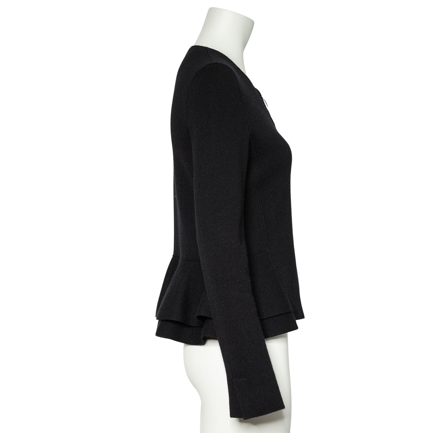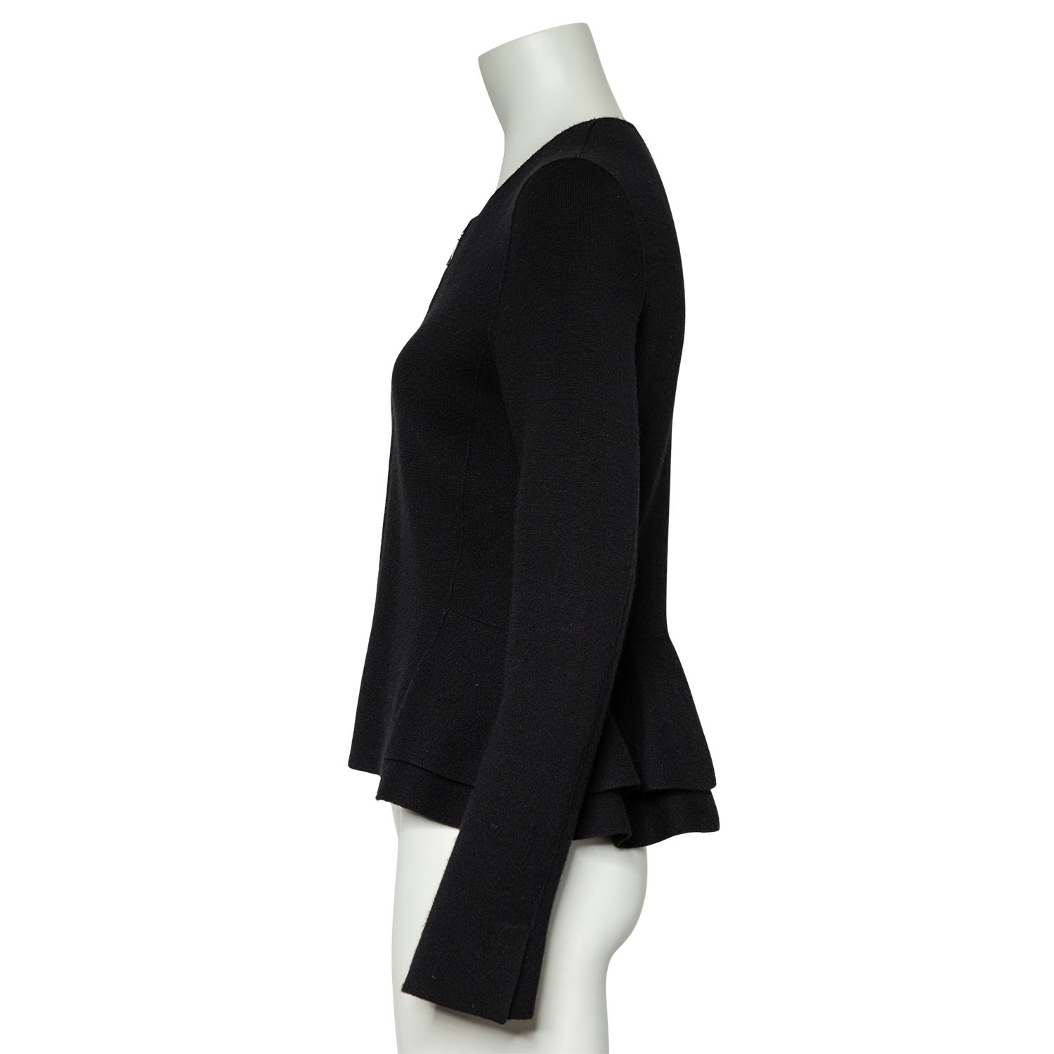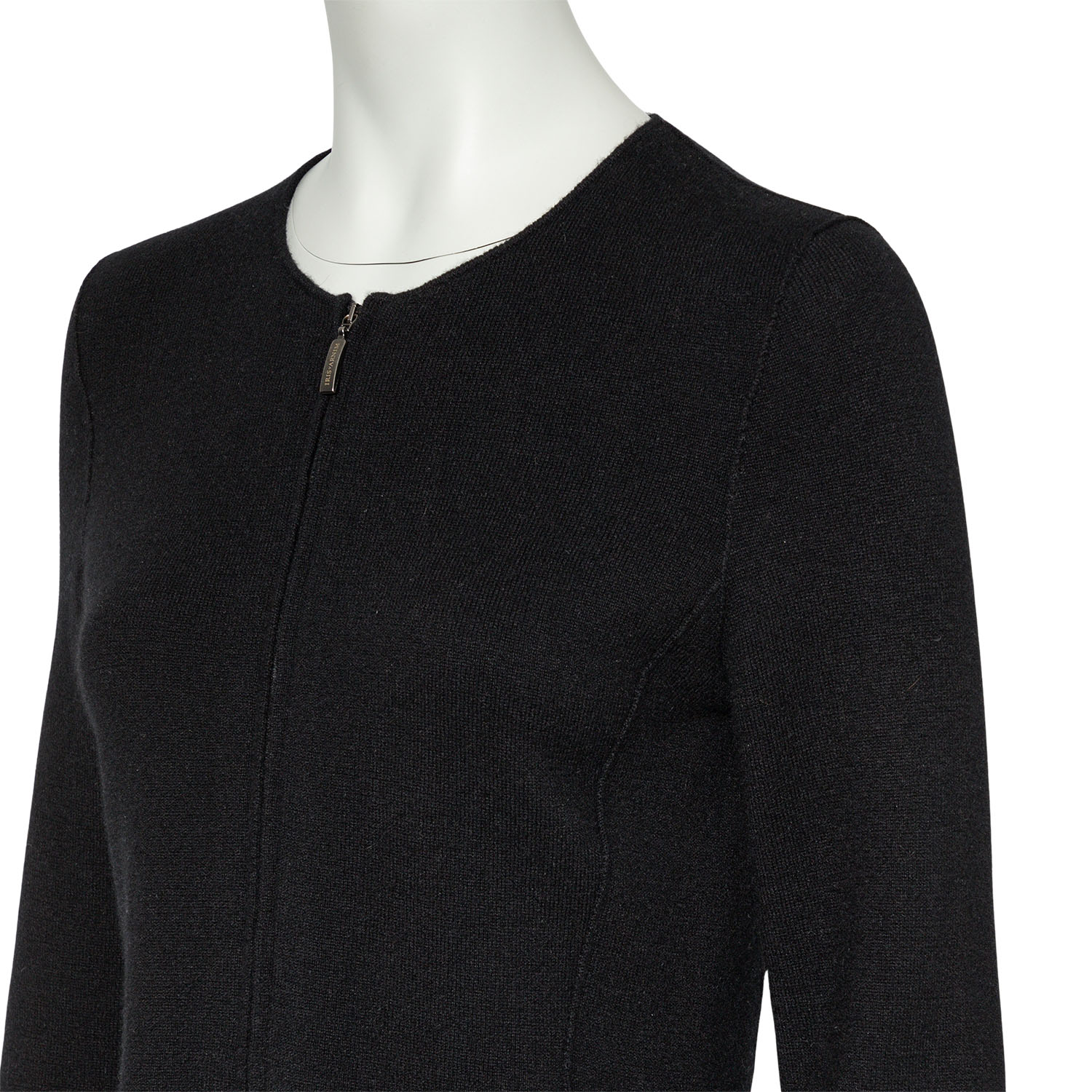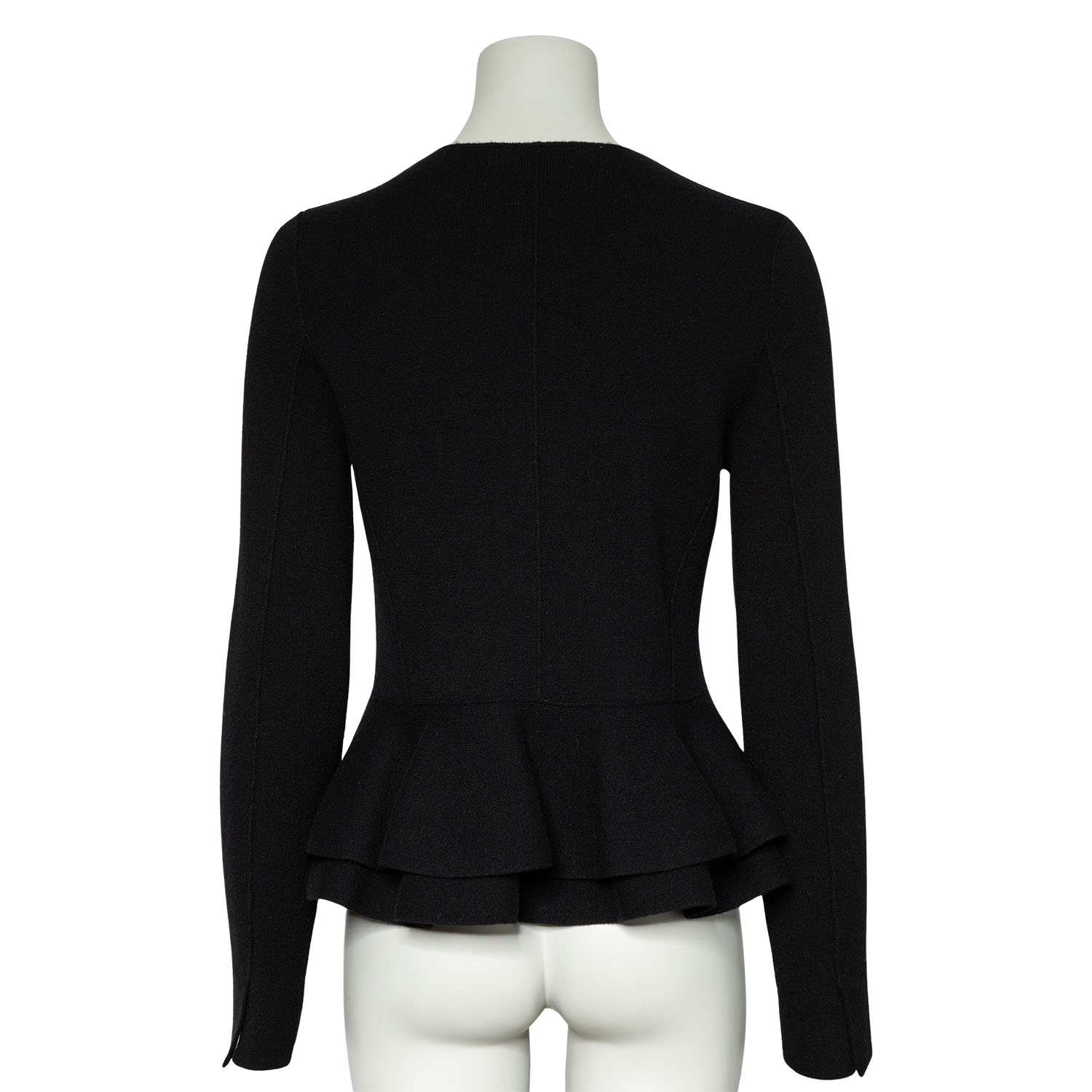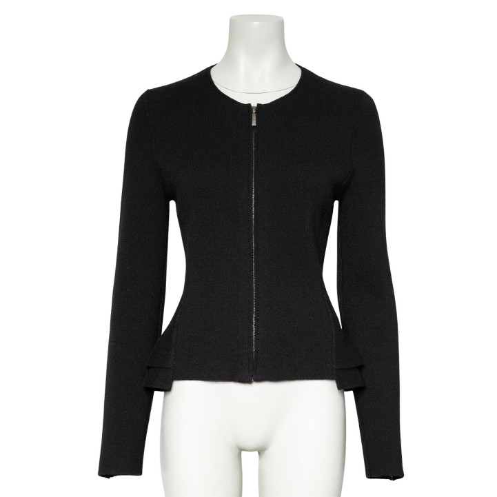 Schwarzes Modell aus 100 % Kaschmir mit Reißverschluss, doppeltem Schößchen und Teilungsnähten. Dezente Tragespuren vorhanden
