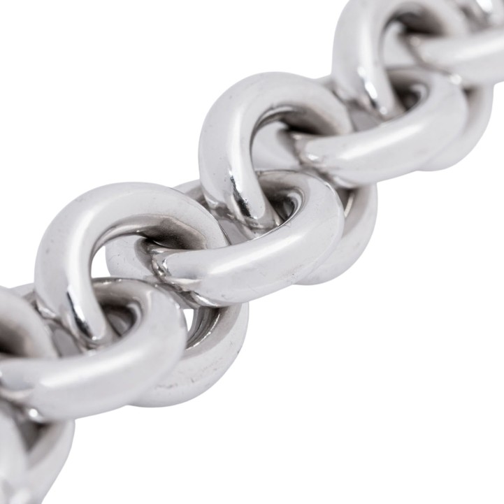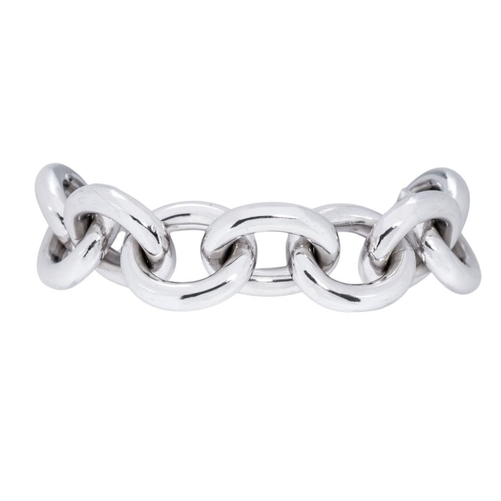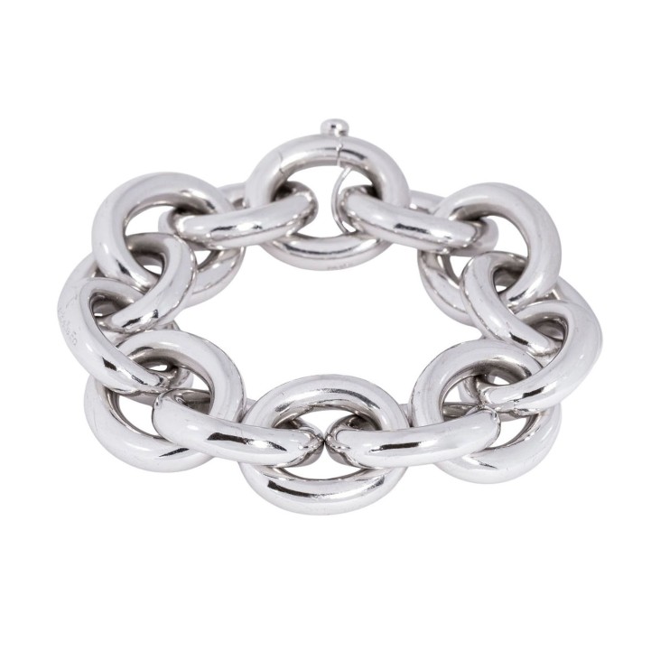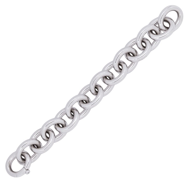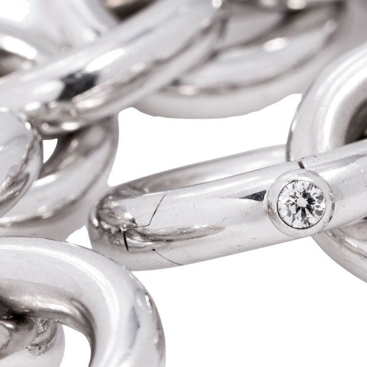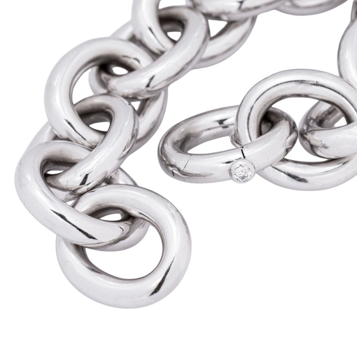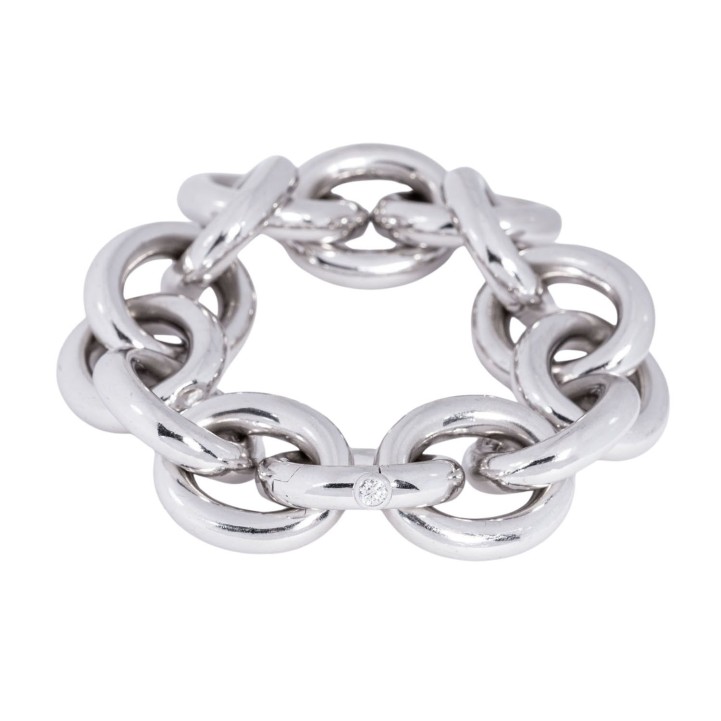 akt. WBW: 21.700 €, kl. Brillant ca. 0,10 ct, 18K WG, 74,8 g, Länge ca. 22 cm, passend für Handgelenksumfang bis ca. 16,5 cm, 21. Jh., leichte Tragespuren. (20.3) // Ergänzung 30.09.25: Die Länge war ursprünglich mit 15,5 cm angegeben.