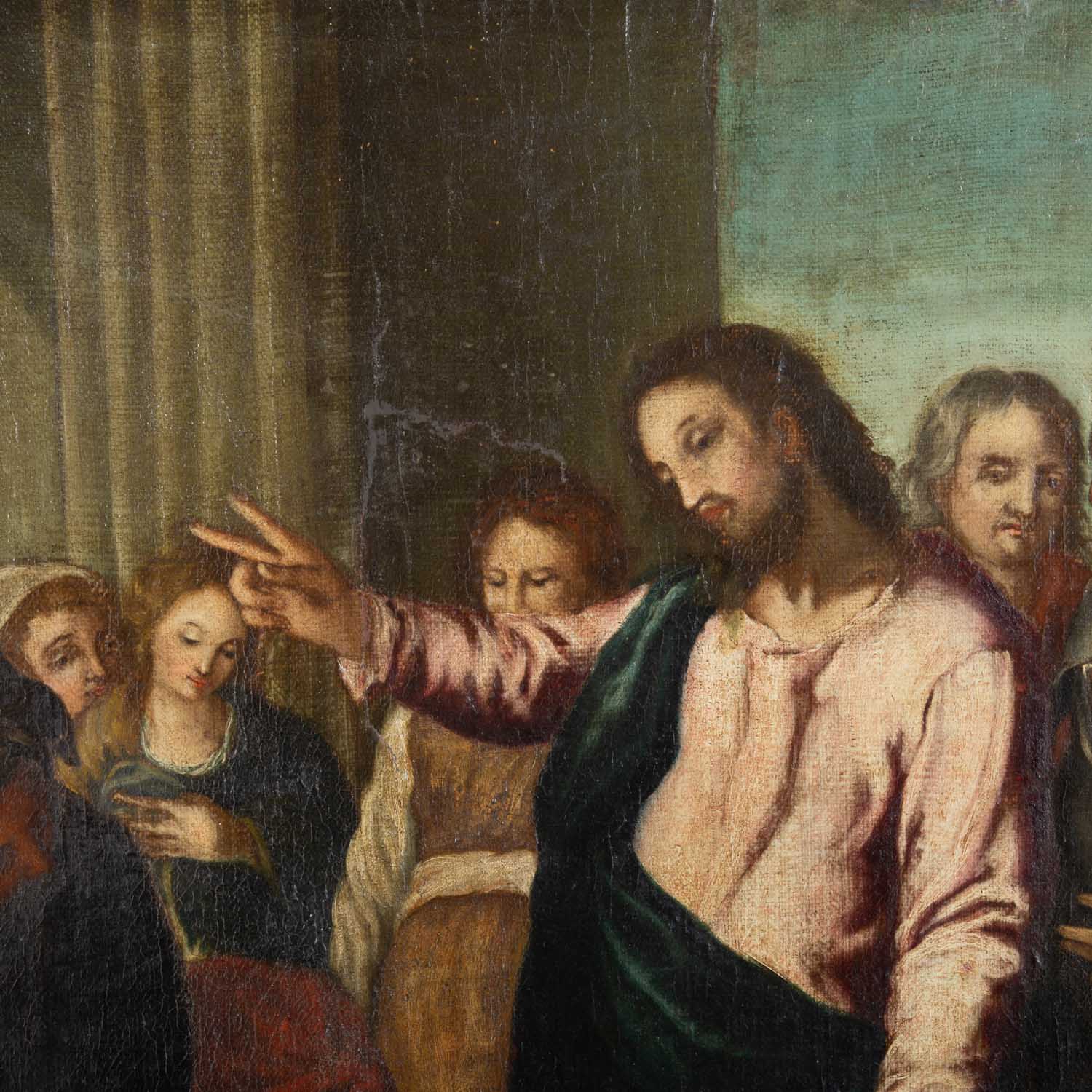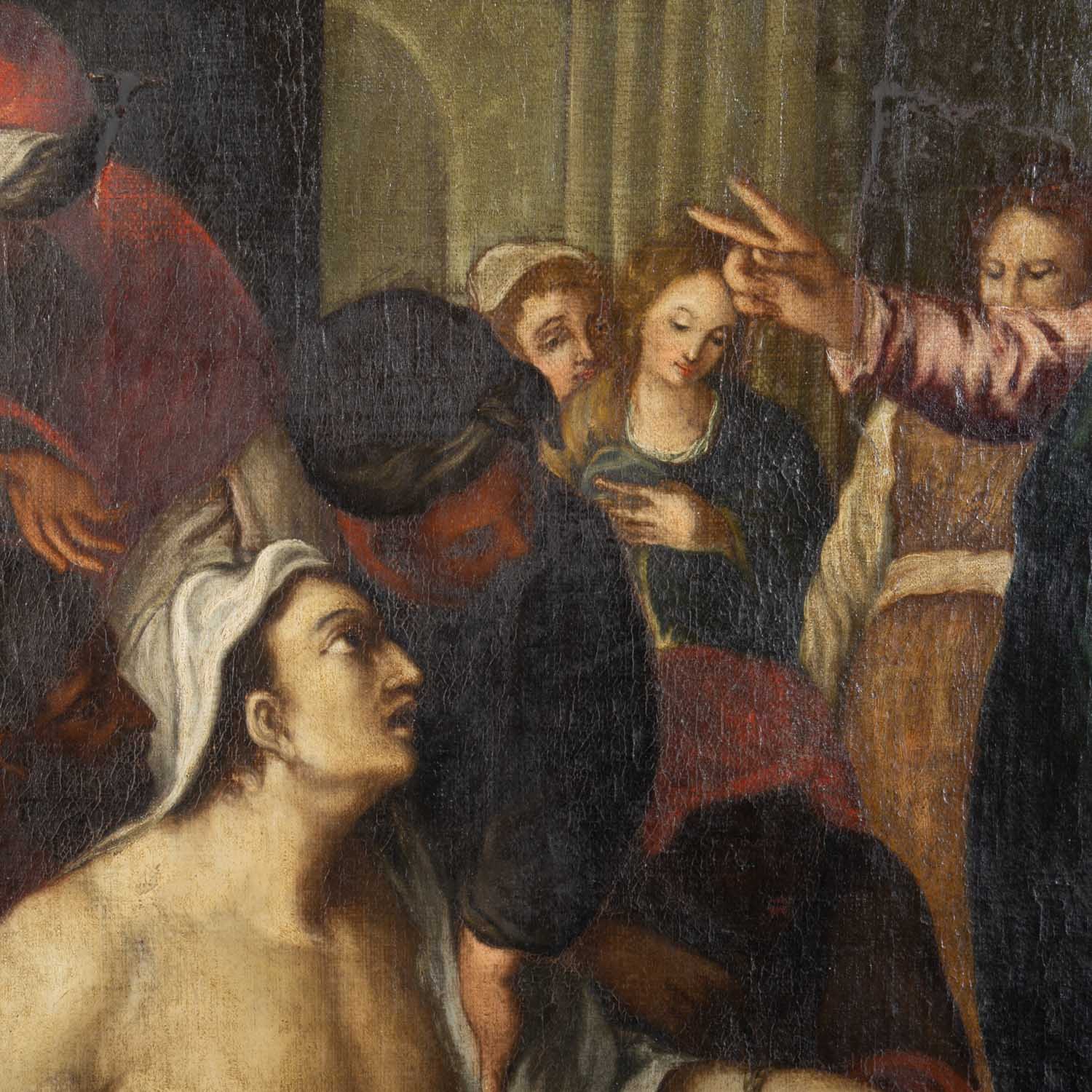 | ITALIAN PAINTER 18th century, 'The Awakening of Lazarus', multi-figure scenes with the blessing Christ in the center, oil/canvas, HxW: approx. 81x99 cm (94x112 cm with frame). Signs of age and wear, craquelure and stretcher frame impression, old restoration with canvas lining patches and retouching. With frame (signs of age).