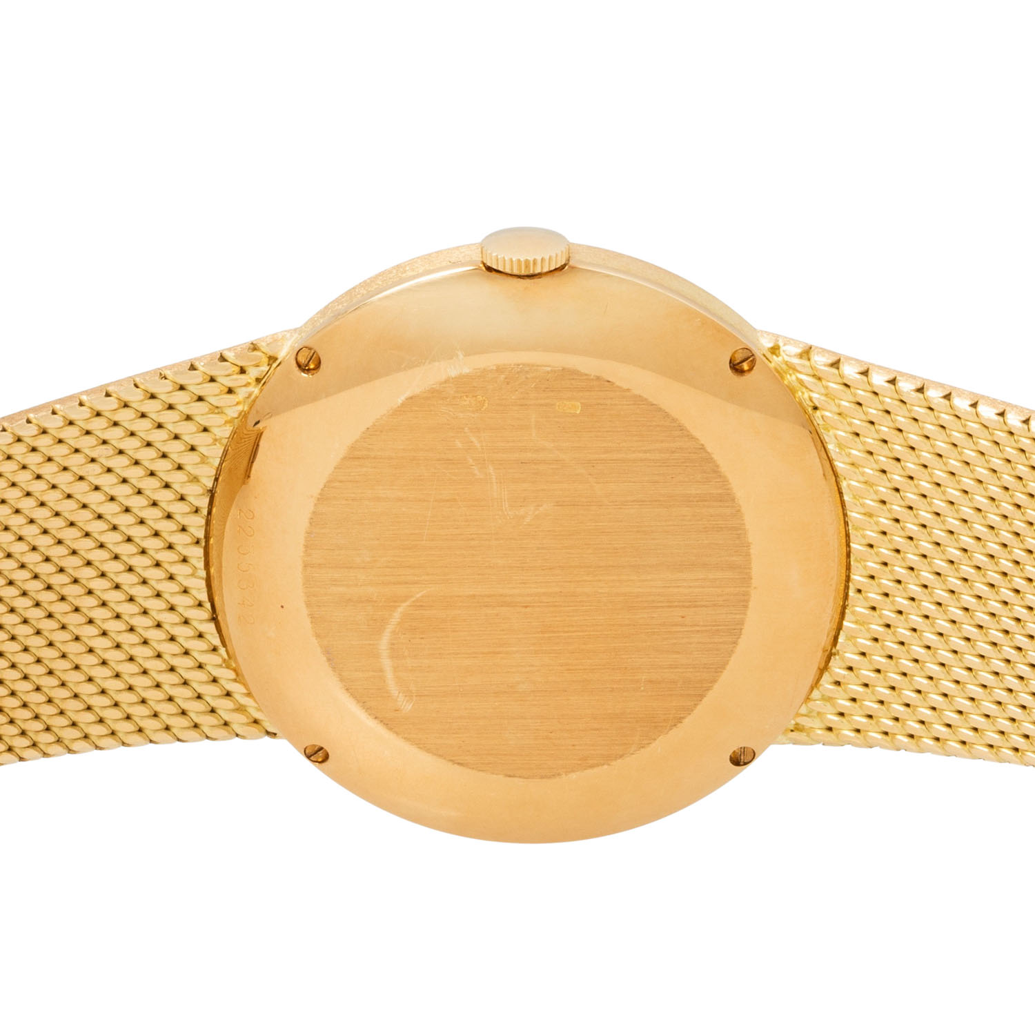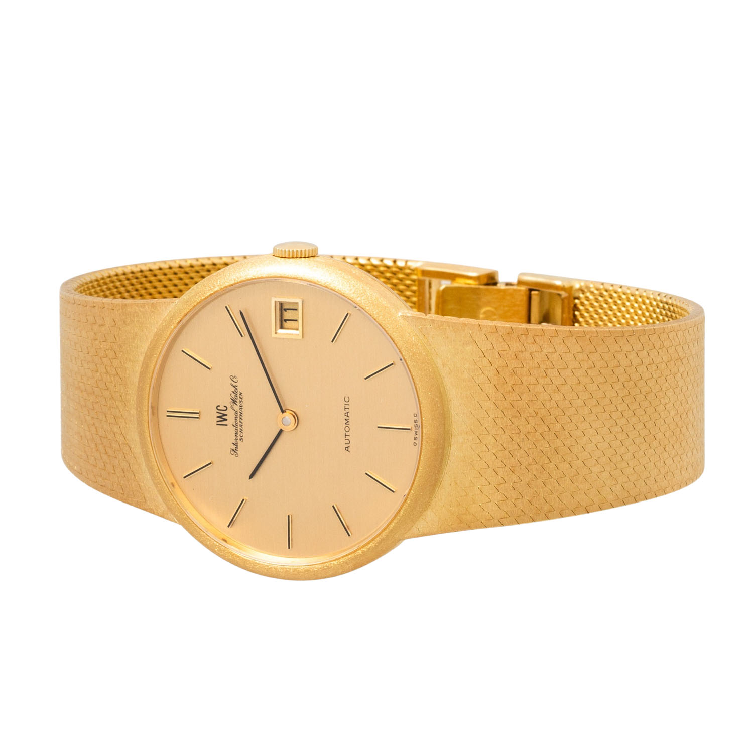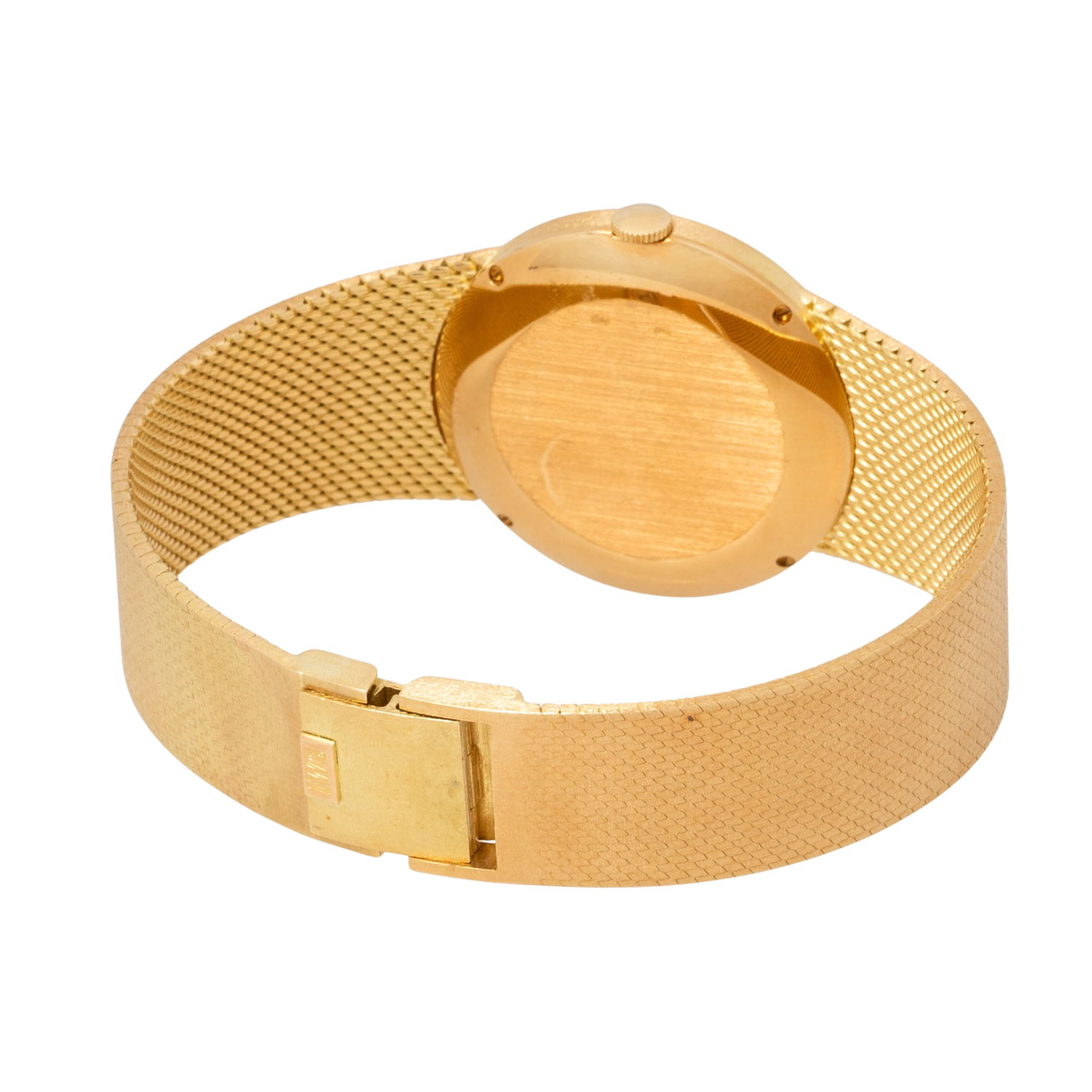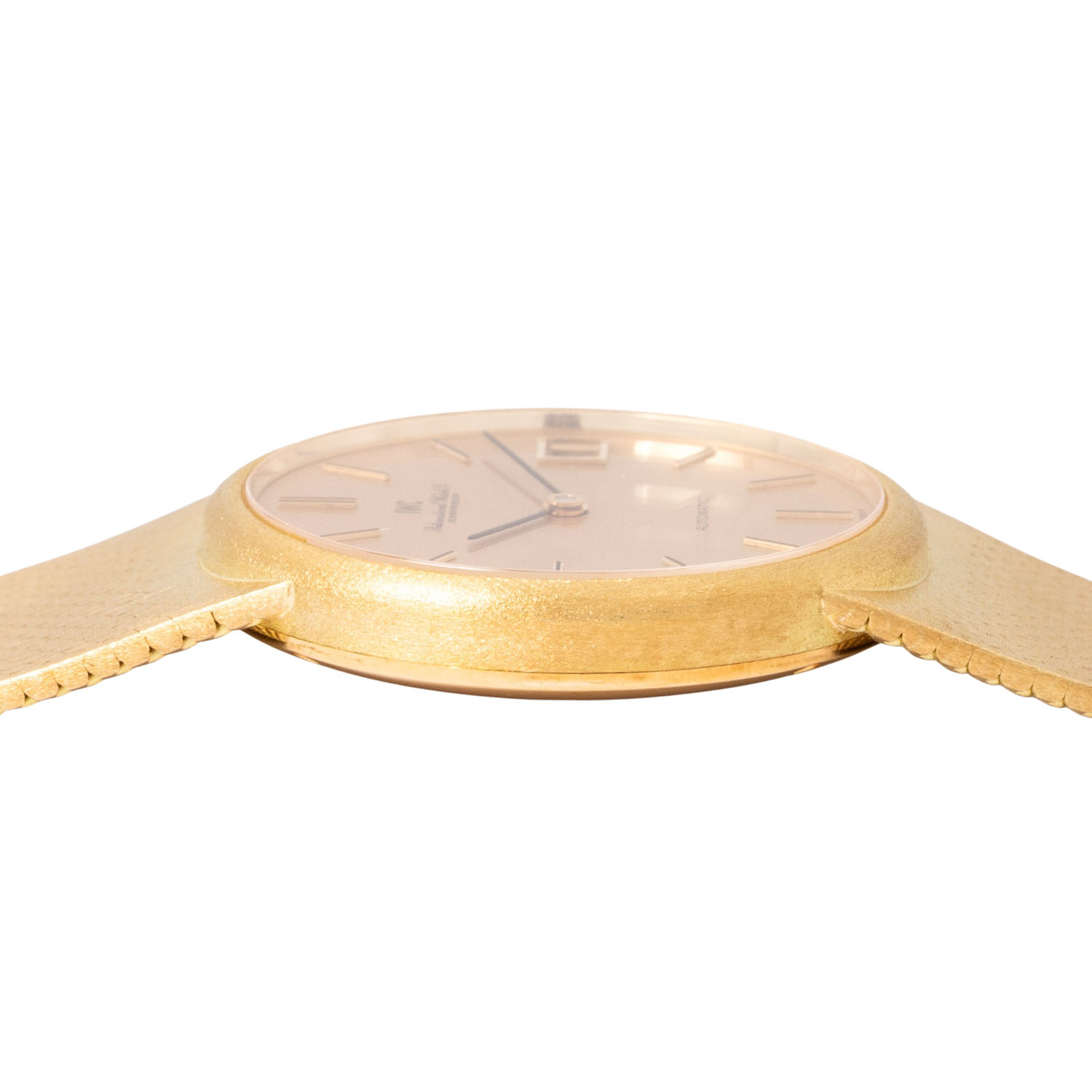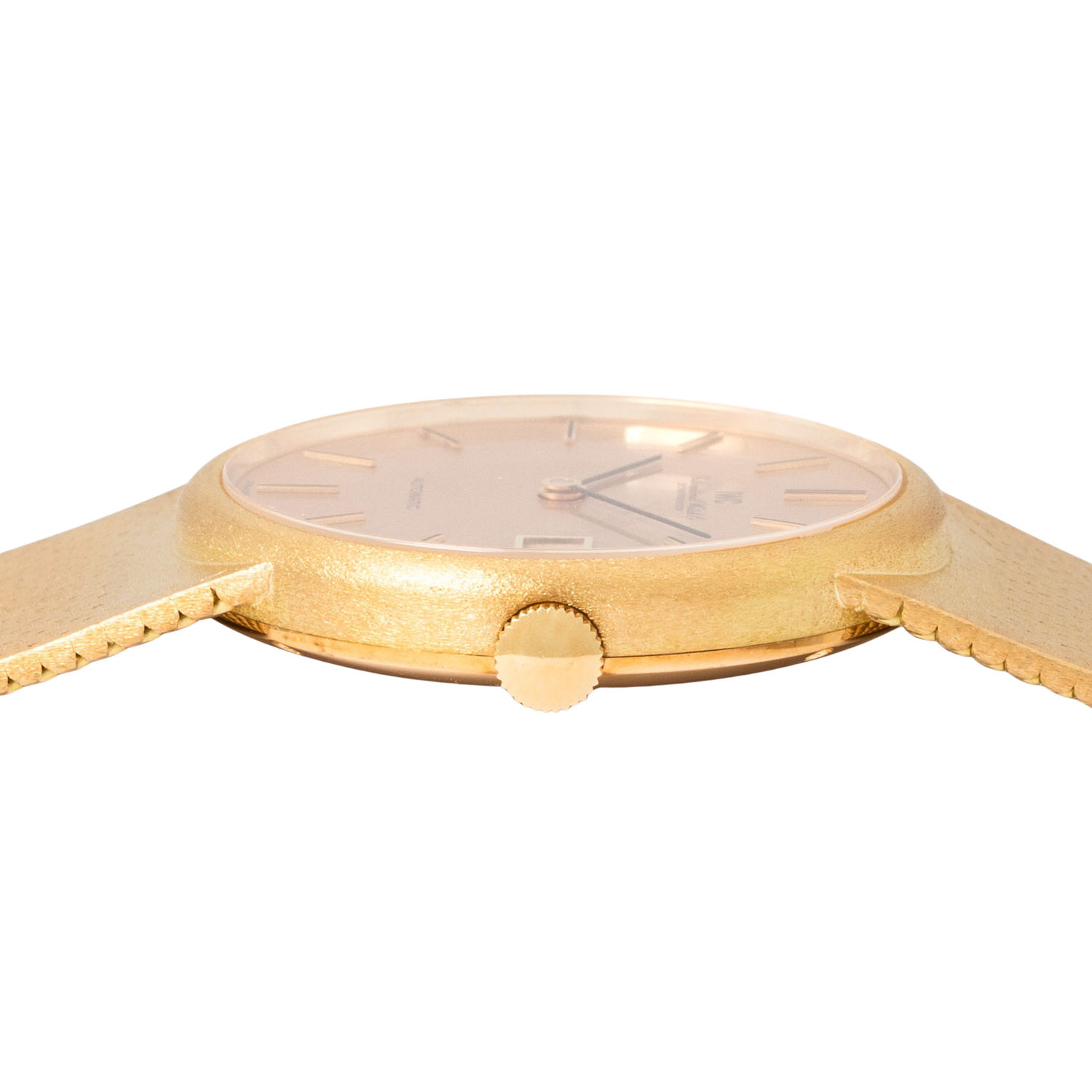 18K Gelbgold. Automatik-Werk Kal. 900 mit guten Gangwerten (+3 Sek., 222° Amplitude). Goldenes Zifferblatt mit Stabindizes und Datumsanzeige bei 3 Uhr. 18K Gelbgold Band mit Faltschließe. Guter Zustand, leichte Gebraucsspuren am Gehäuse und Band. Durchmesser ca. 33 mm, gemessen ohne Krone. Passend bis zu ca. 17,5 cm Handgelenksumfang.