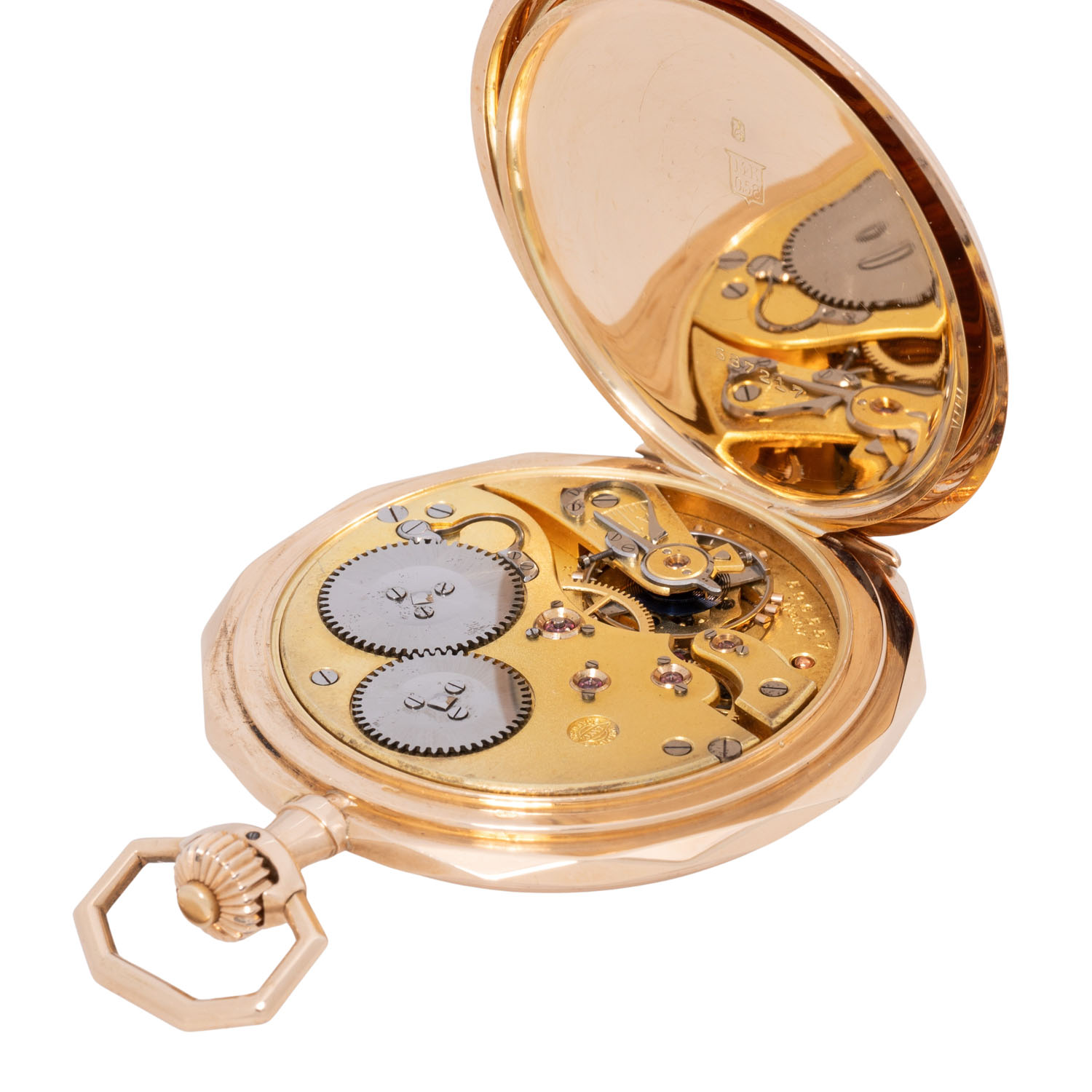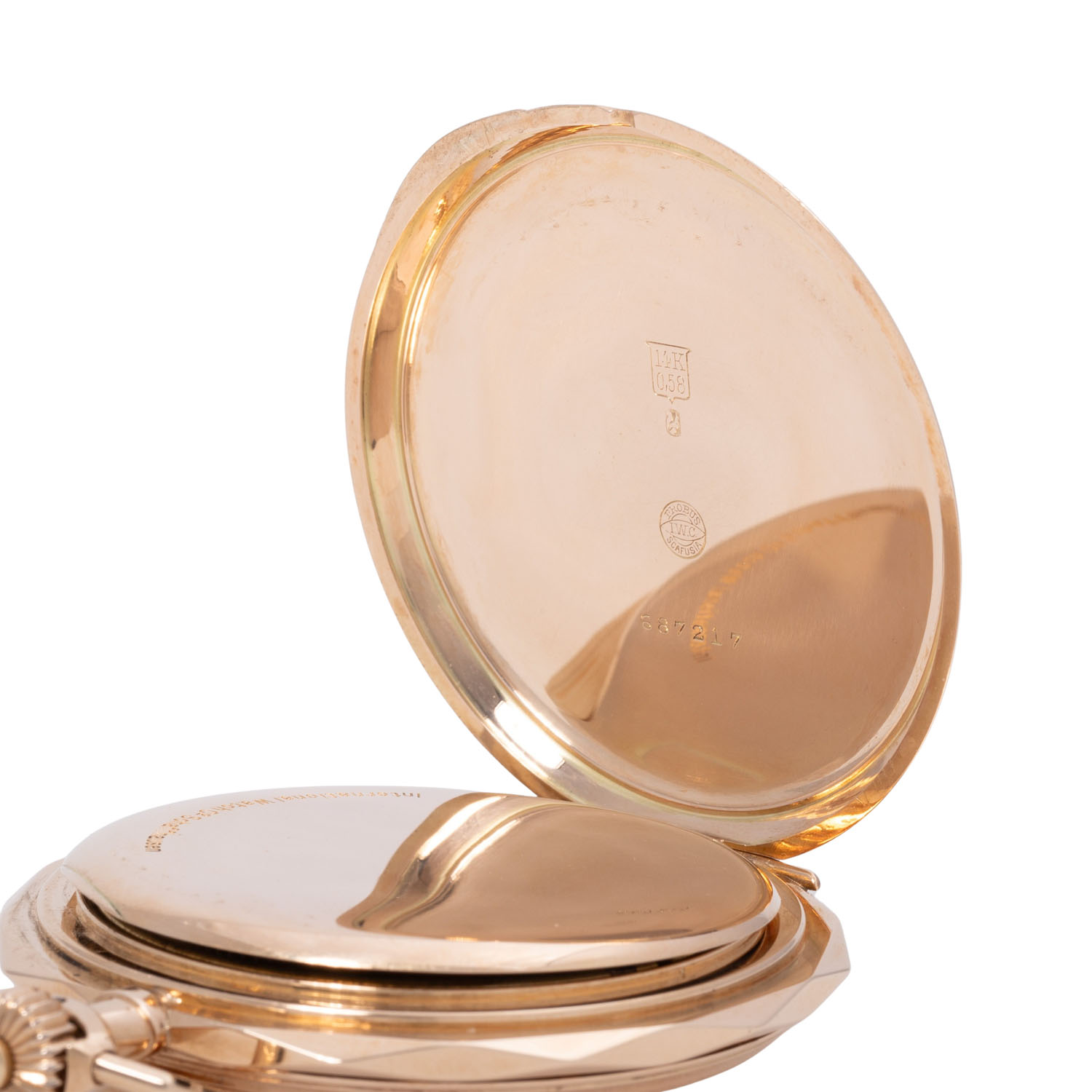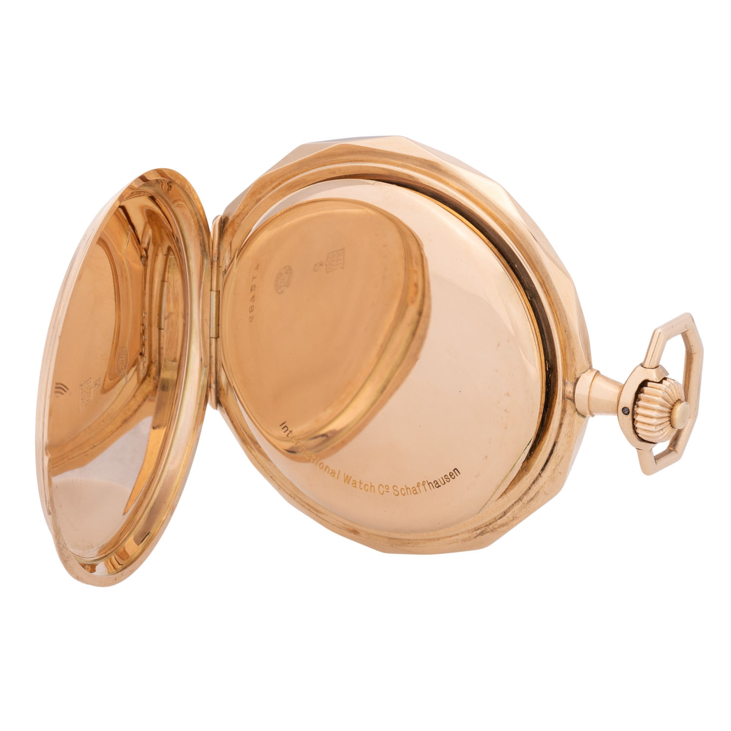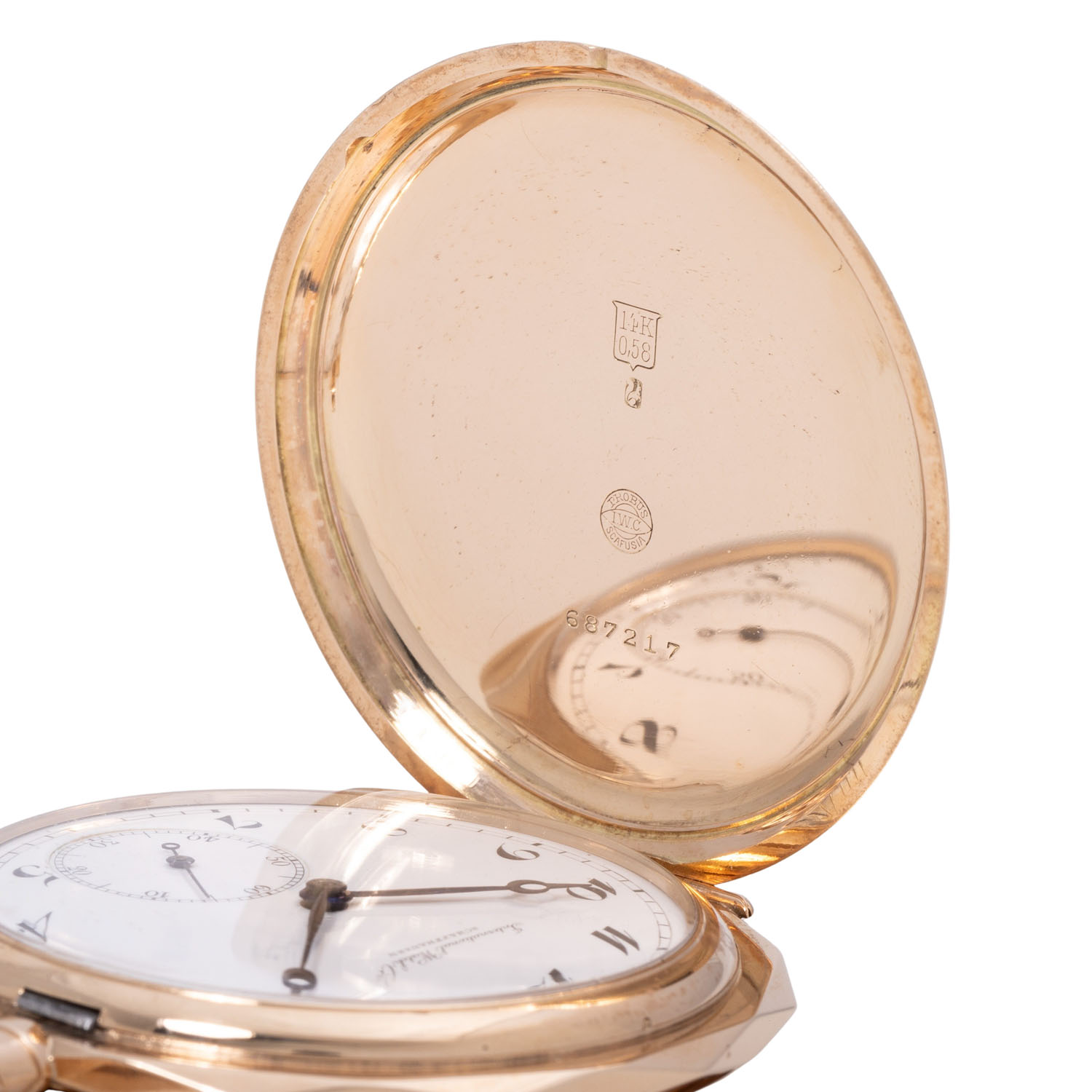 14K Roségold, Gehäuse-Nr. 687217, sign. 'IWC Probus Scafusia' inkl. Staubdeckel sign. 'International Watch Co. Schaffhausen'. Vorder- & Rückseite guillochiert, mit freier Signaturstelle auf der Vorderseite. Mechanisches Werk mit Handaufzug Kal. 53H7, Kompensations-Unruh, Savonnette-Kaliber, Feinregulierung, sign. 'IWC Probus Scafusia' mit guten Gangwerten (-10 Sek., 280° Amplitude). Weißes Emaille-Zifferblatt mit Breguet-Ziffern, abgesetzter kleiner Sekunde auf 6 Uhr, metallicblauen Breguet-Zeigern und Eisenbahnminuterie, sign. 'International Watch Co. Schaffhausen'. Guter Zustand, leichte Gebrauchsspuren. Spuren unsachgemäßer Öffnung des Sprungdeckels. Zifferblatt in einwandfreiem Zustand. Durchmesser ca. 54 mm gemessen ohne Krone.