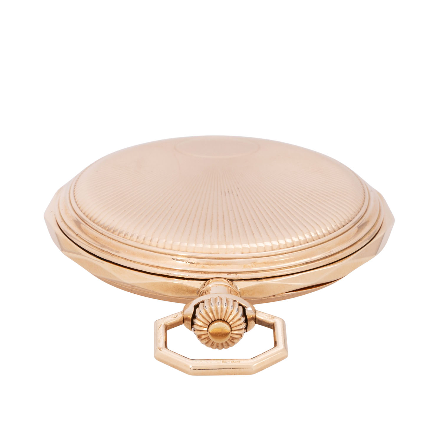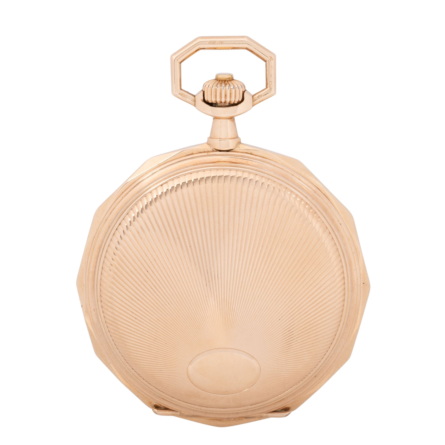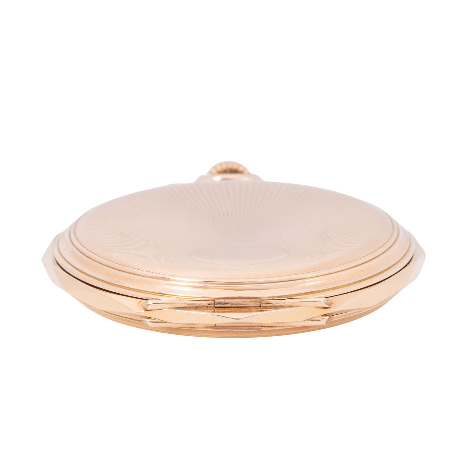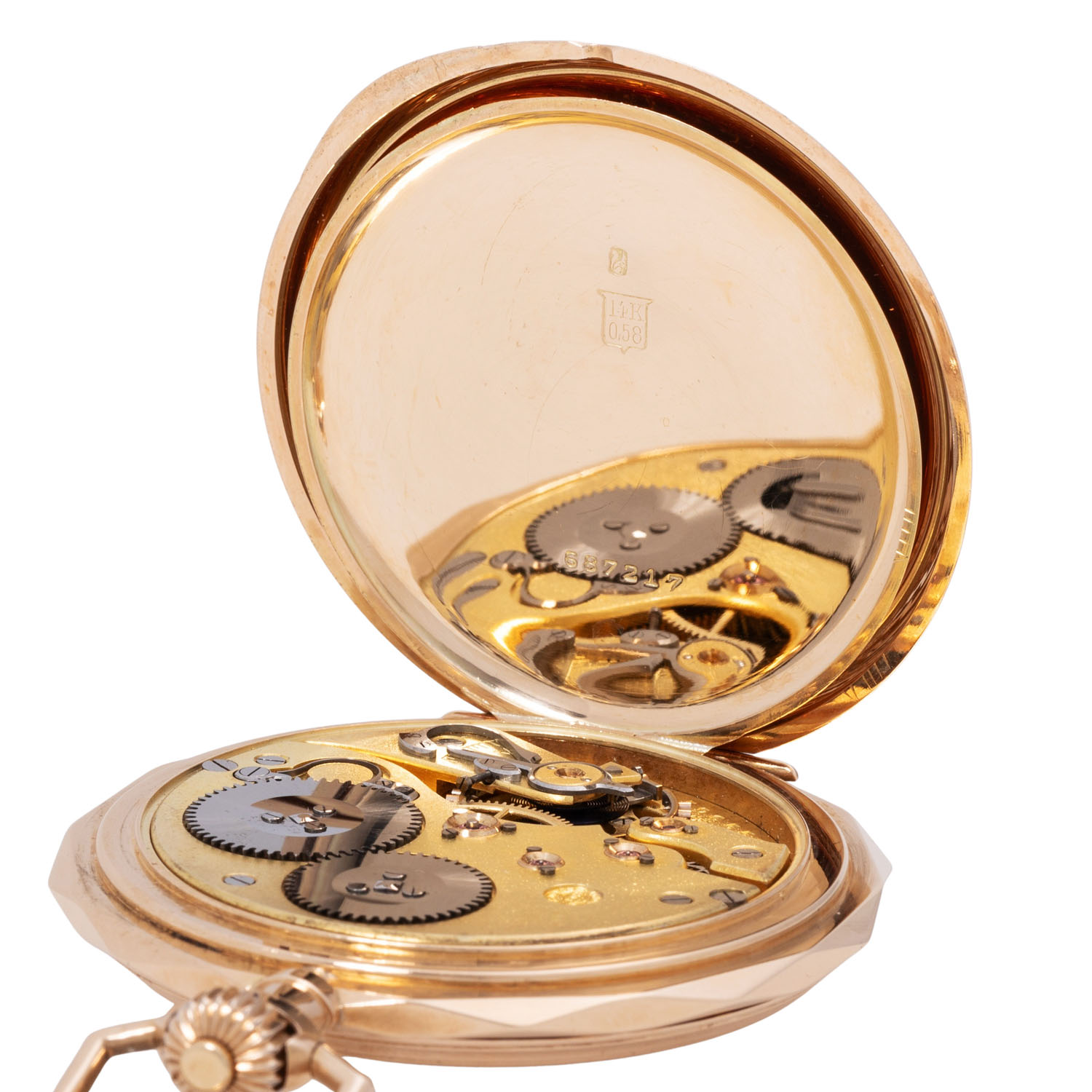 14K Roségold, Gehäuse-Nr. 687217, sign. 'IWC Probus Scafusia' inkl. Staubdeckel sign. 'International Watch Co. Schaffhausen'. Vorder- & Rückseite guillochiert, mit freier Signaturstelle auf der Vorderseite. Mechanisches Werk mit Handaufzug Kal. 53H7, Kompensations-Unruh, Savonnette-Kaliber, Feinregulierung, sign. 'IWC Probus Scafusia' mit guten Gangwerten (-10 Sek., 280° Amplitude). Weißes Emaille-Zifferblatt mit Breguet-Ziffern, abgesetzter kleiner Sekunde auf 6 Uhr, metallicblauen Breguet-Zeigern und Eisenbahnminuterie, sign. 'International Watch Co. Schaffhausen'. Guter Zustand, leichte Gebrauchsspuren. Spuren unsachgemäßer Öffnung des Sprungdeckels. Zifferblatt in einwandfreiem Zustand. Durchmesser ca. 54 mm gemessen ohne Krone.