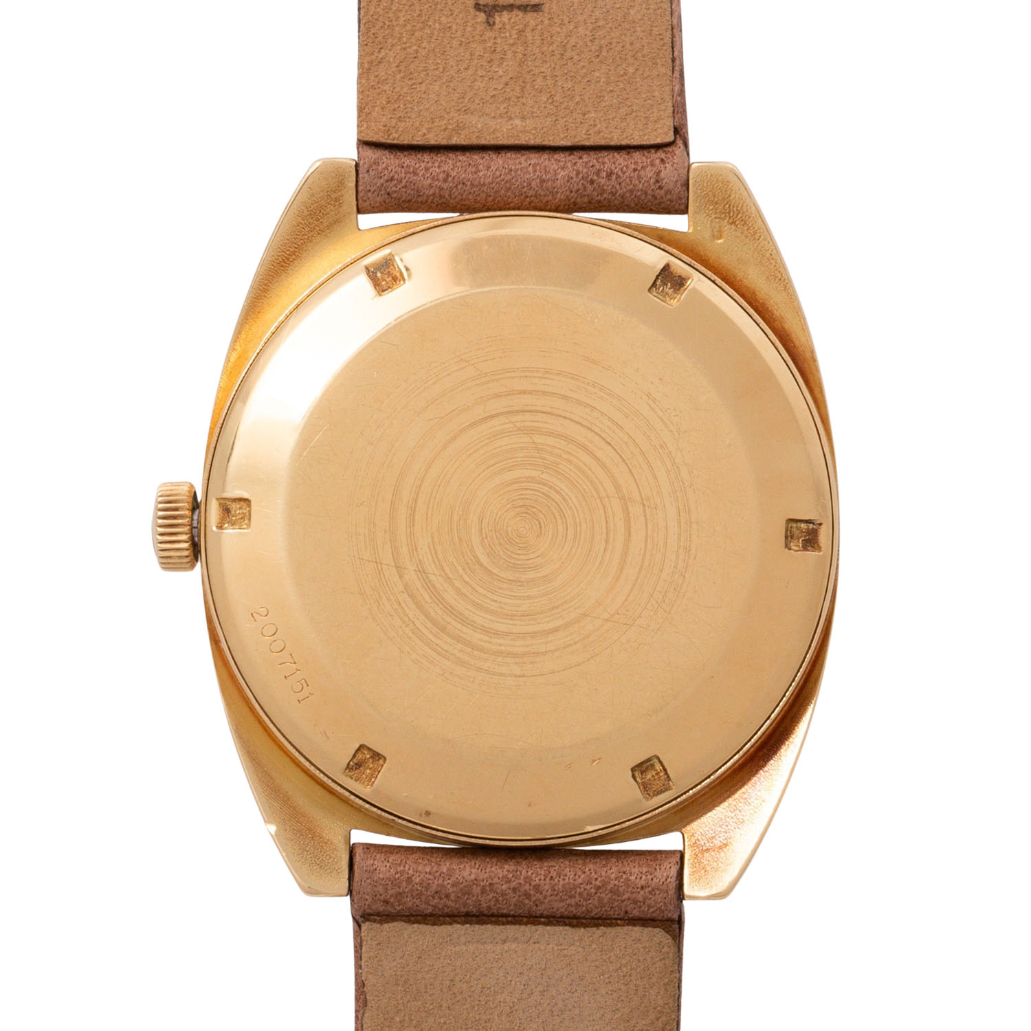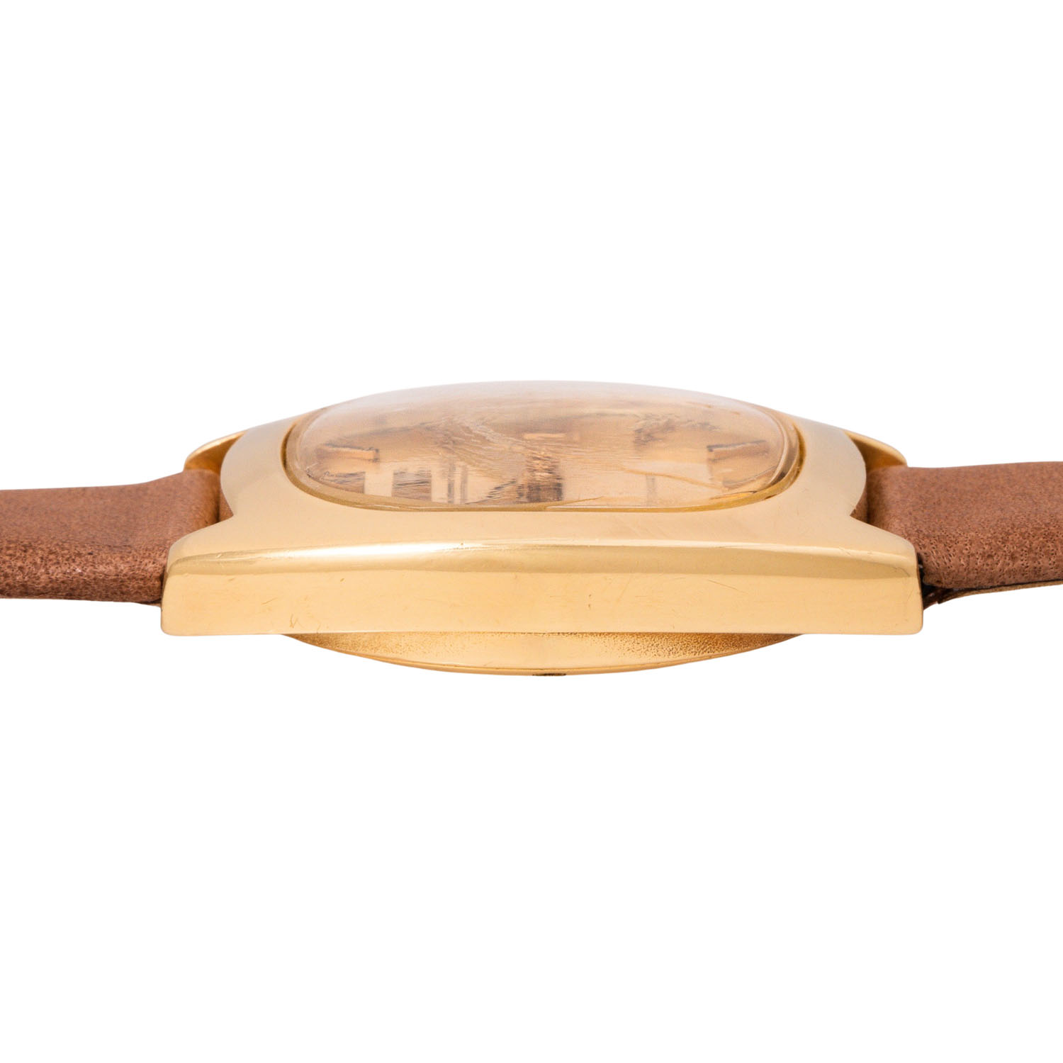 Gelbgold 18K. Automatik-Werk Kal. 8541B mit guten Gangwerten (+5 Sek., 255° Amplitude). Goldfarbenes Zifferblatt mit Stabindizes und Datumsanzeige. Neues Lederband mit vergoldeter Dornschließe. Gebraucht, Tragespuren am Gehäuse und Plexi. Durchmesser ca. 35 mm, gemessen ohne Krone.