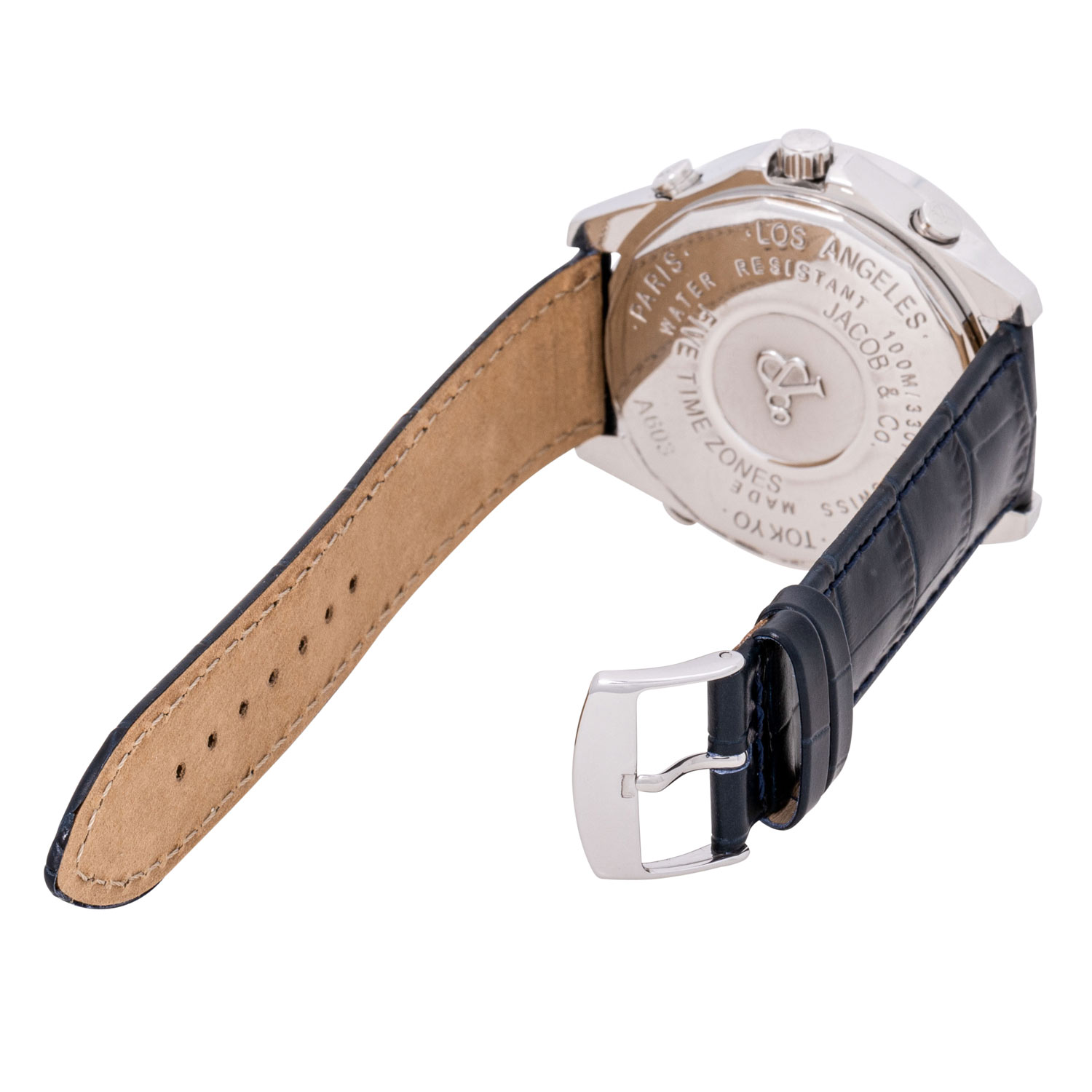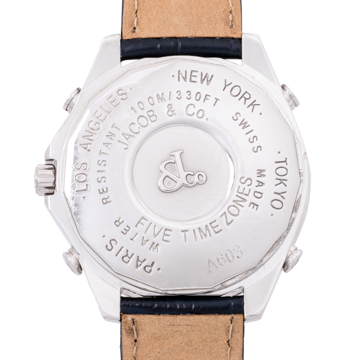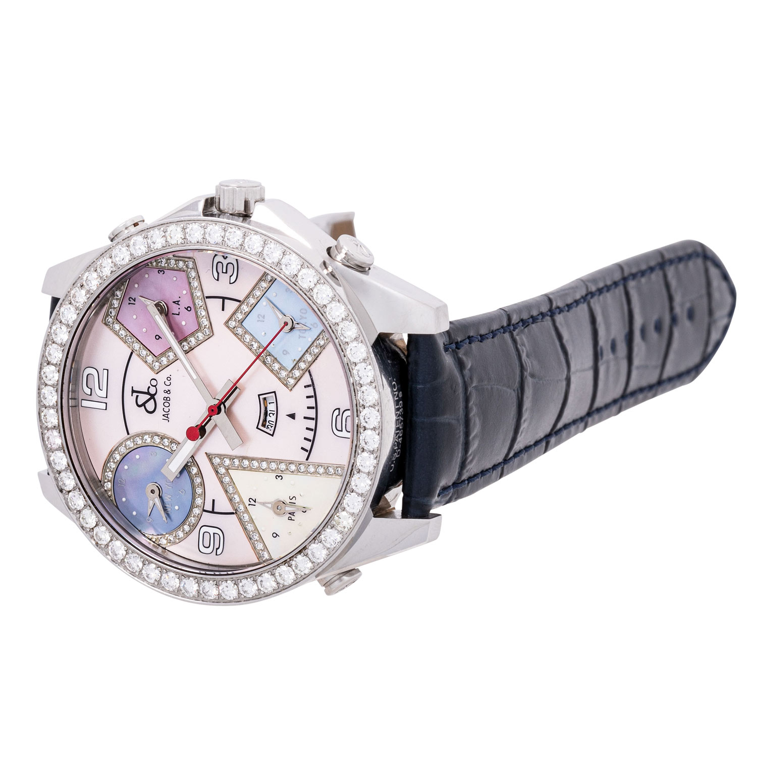 Edelstahl. Quarzwerk mit 5 neuen Batterien in funktionsfähigem Zustand. Perlmutt Zifferblatt mit Diamantindizes, 5 Zeitzonen (darunter Paris, New York, LA und Tokyo) und Datumsanzeige. Diamantenlünette. Neues Lederband mit Dornschließe. Guter Zustand mit Tragespuren. Das Zifferblatt hat einen längeren Riss im Bereich der Datumsanzeige. Original Box (unvollständig), Microfasertuch, Hang Tag, Edelstahl Lünette, 6 weitere Armbänder in verschiedenen Farben, 4 davon mit Jacob & Co. Faltschließen, ein Armband ohne Schließe und eines mit neutraler Faltschließe, Anleitung und Garantiezertifikat anbei. Gekauft im Oktober 2007 im Flughafen Dubai. Durchmesser ca. 47 mm (gemessen ohne Krone).