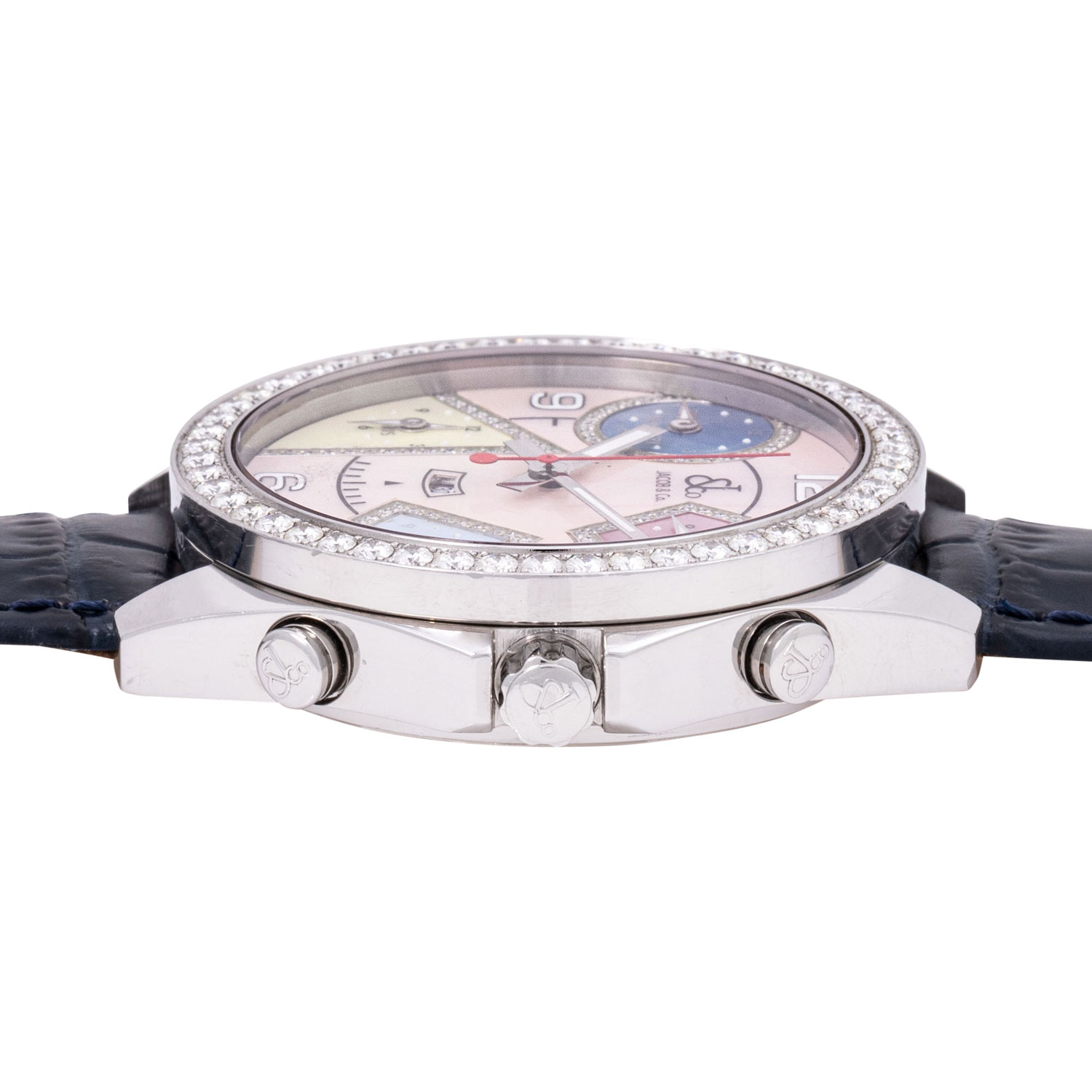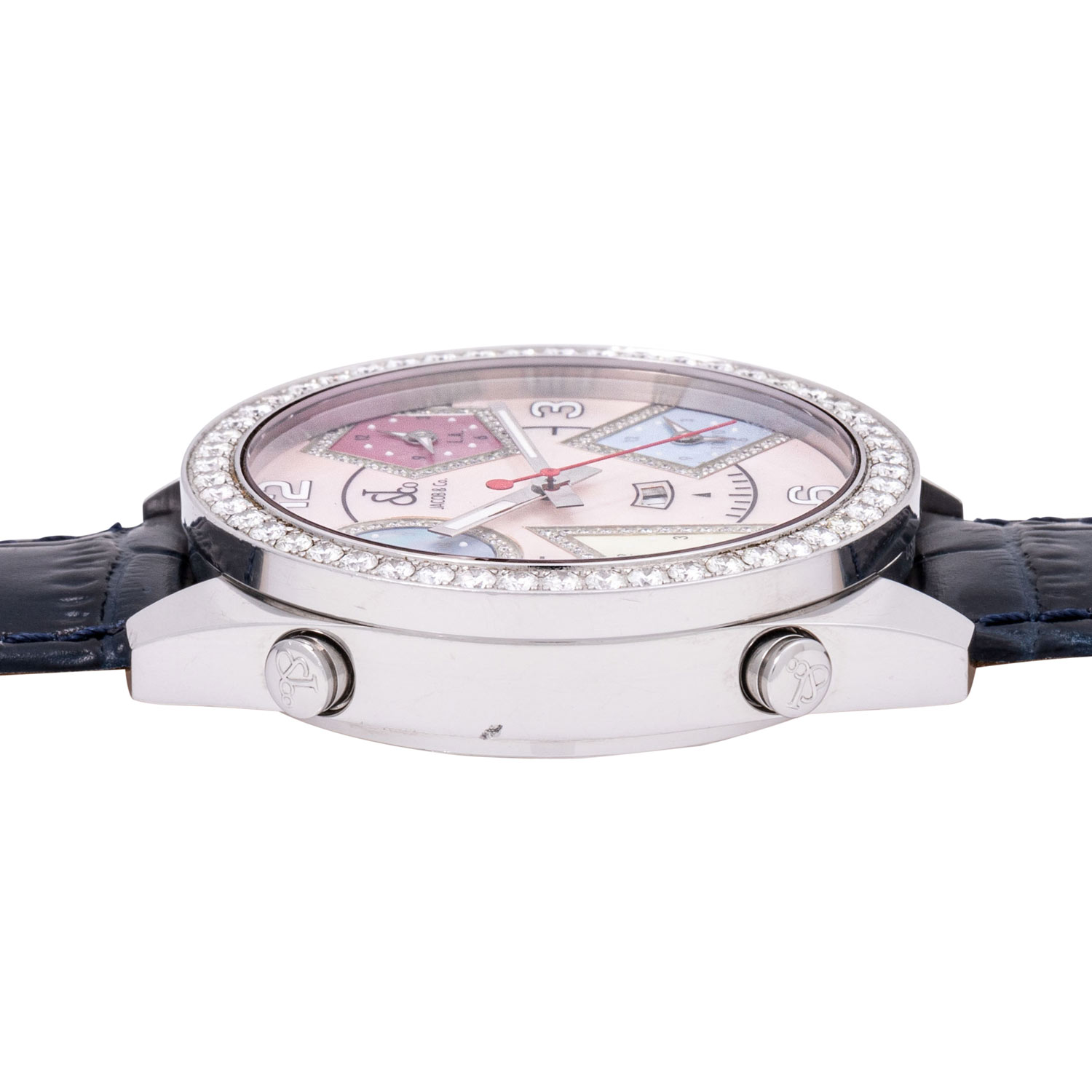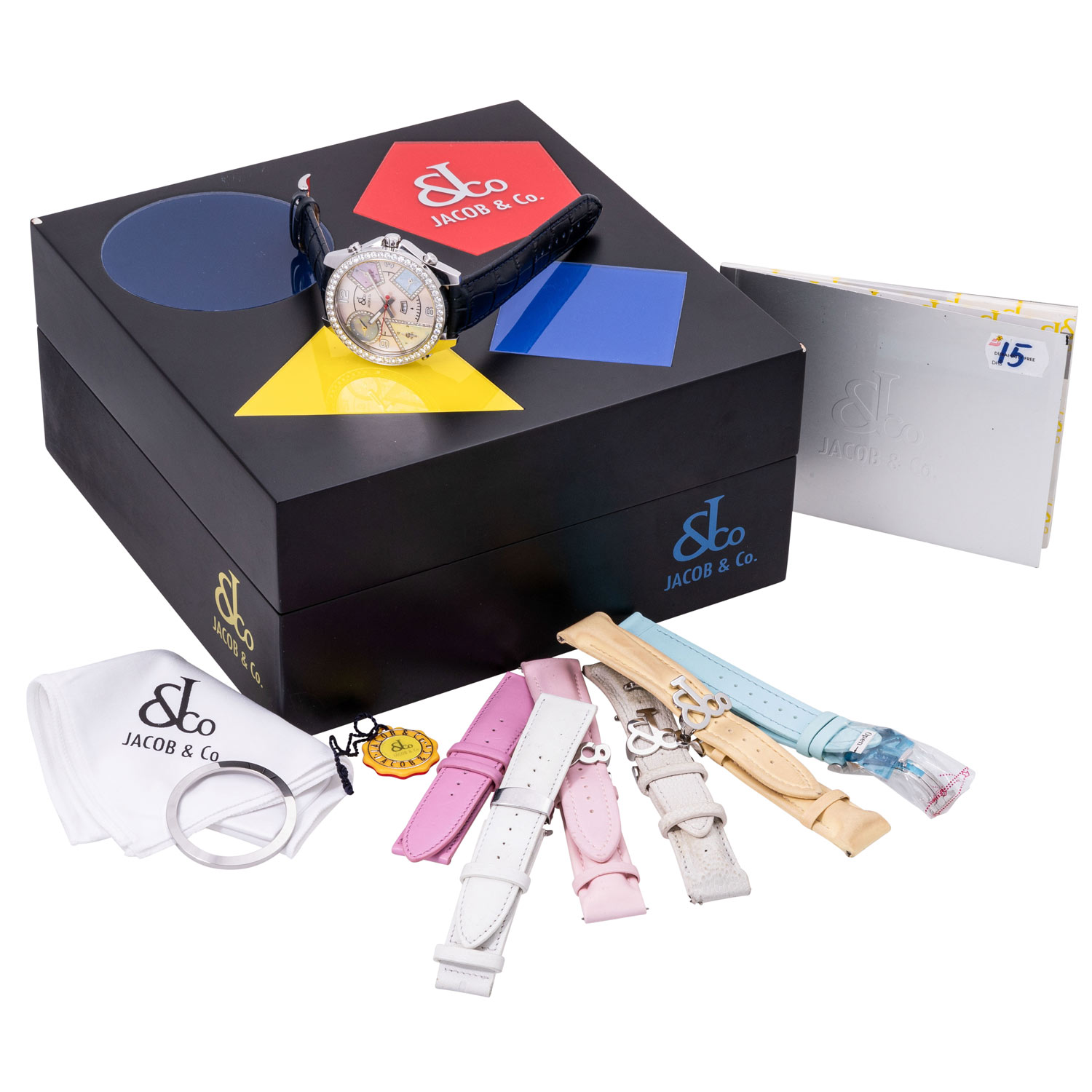 Edelstahl. Quarzwerk mit 5 neuen Batterien in funktionsfähigem Zustand. Perlmutt Zifferblatt mit Diamantindizes, 5 Zeitzonen (darunter Paris, New York, LA und Tokyo) und Datumsanzeige. Diamantenlünette. Neues Lederband mit Dornschließe. Guter Zustand mit Tragespuren. Das Zifferblatt hat einen längeren Riss im Bereich der Datumsanzeige. Original Box (unvollständig), Microfasertuch, Hang Tag, Edelstahl Lünette, 6 weitere Armbänder in verschiedenen Farben, 4 davon mit Jacob & Co. Faltschließen, ein Armband ohne Schließe und eines mit neutraler Faltschließe, Anleitung und Garantiezertifikat anbei. Gekauft im Oktober 2007 im Flughafen Dubai. Durchmesser ca. 47 mm (gemessen ohne Krone).