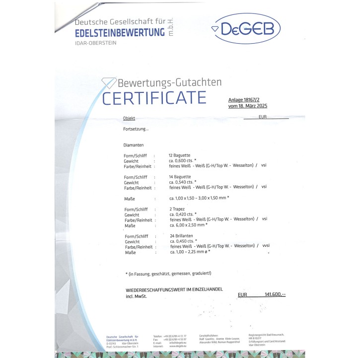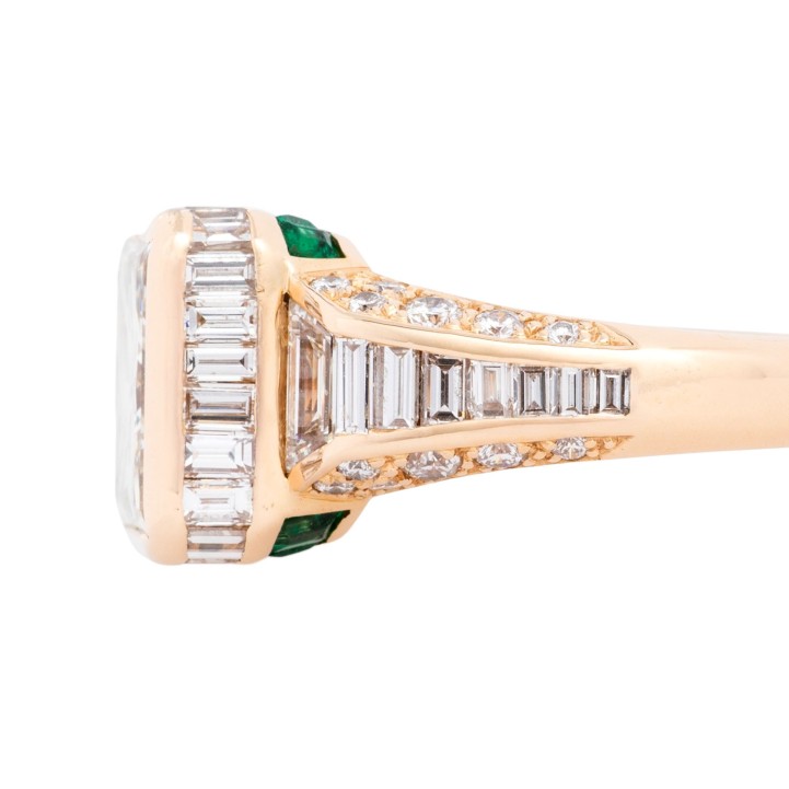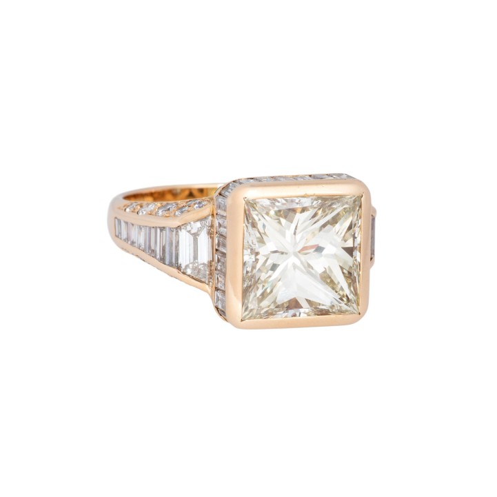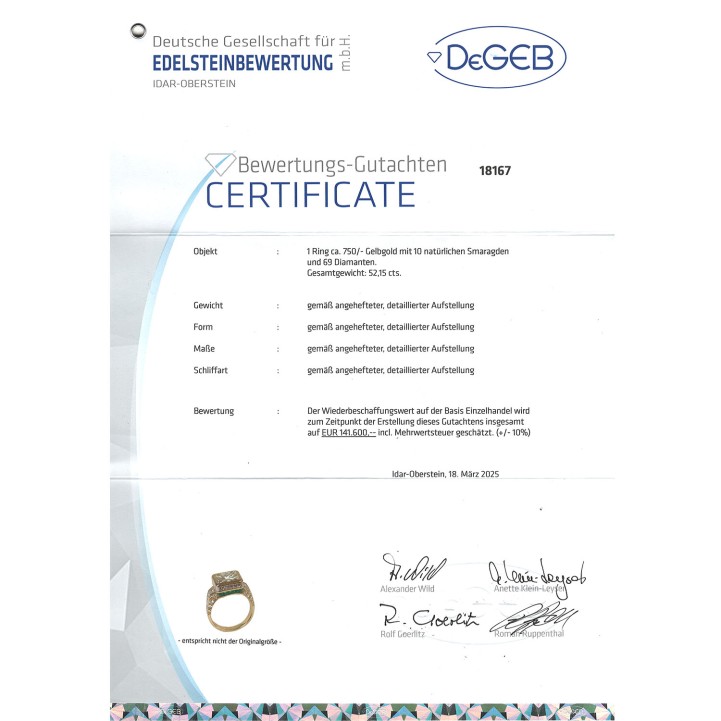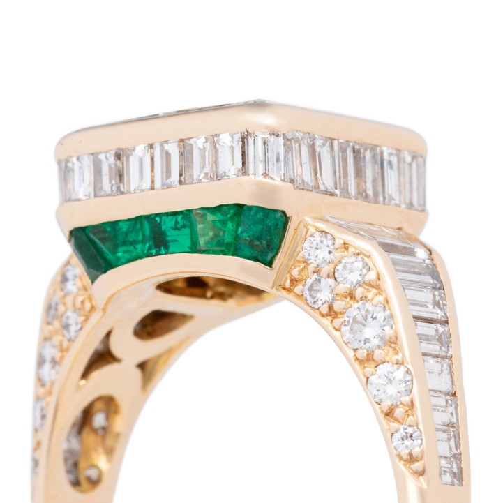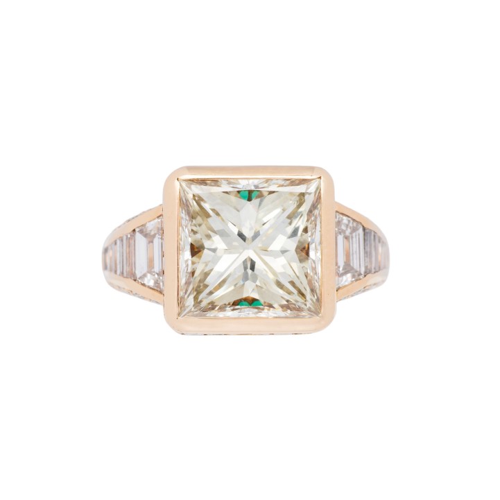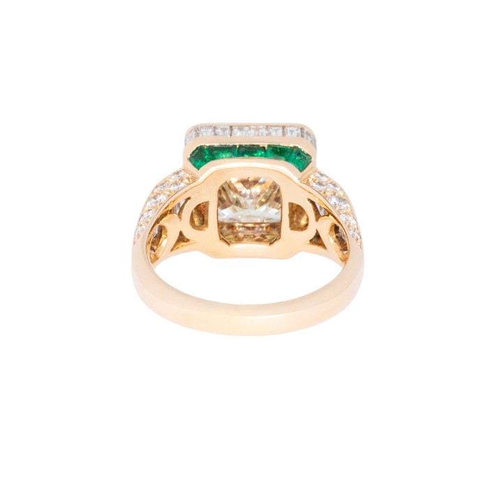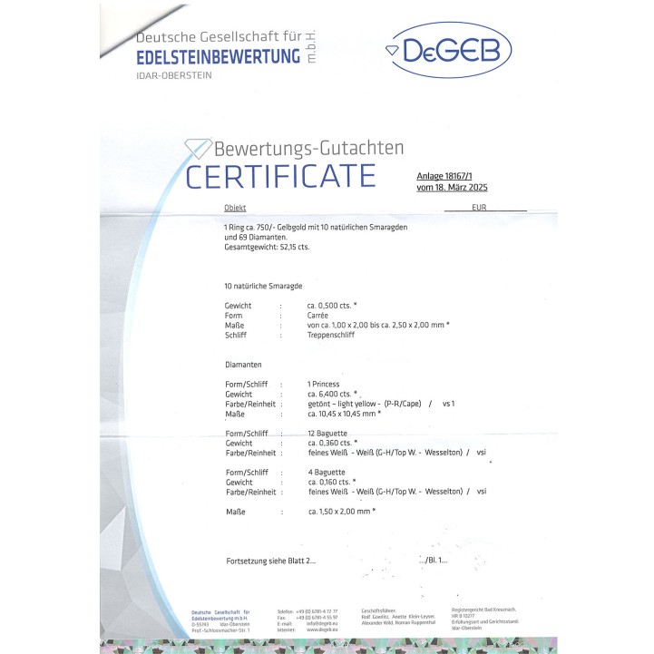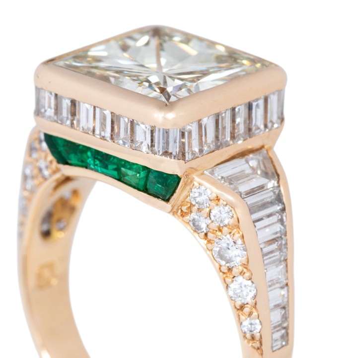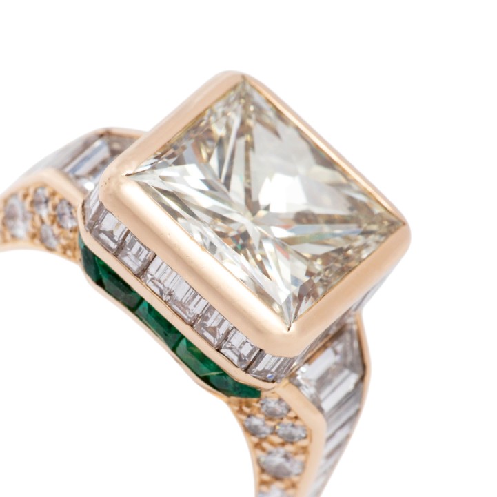 weiteren Diamanten von zus. ca. 2,53 ct und Smaragdcarrées zus. ca. 0,5 ct, aktueller WBW laut DeGEB Gutachten von 3/2025: ca. 141.600 €, Hauptstein ca. GET-LIGHT YELLOW (P-R)/VS1, weiterhin 42 Diamanten im Baguetteschliff, 2 im Trapezschliff und 24 Brillanten, alle ca. FW-WEISS (G-H)/VVS-VS, GG 18K, 10,3 g, RW: 58, 20./21. Jh., Tragespuren, Smaragde tlw. bestoßen, punziert 'JACOBI SR', mit DeGEB Bewertungs-Gutachten 18167.