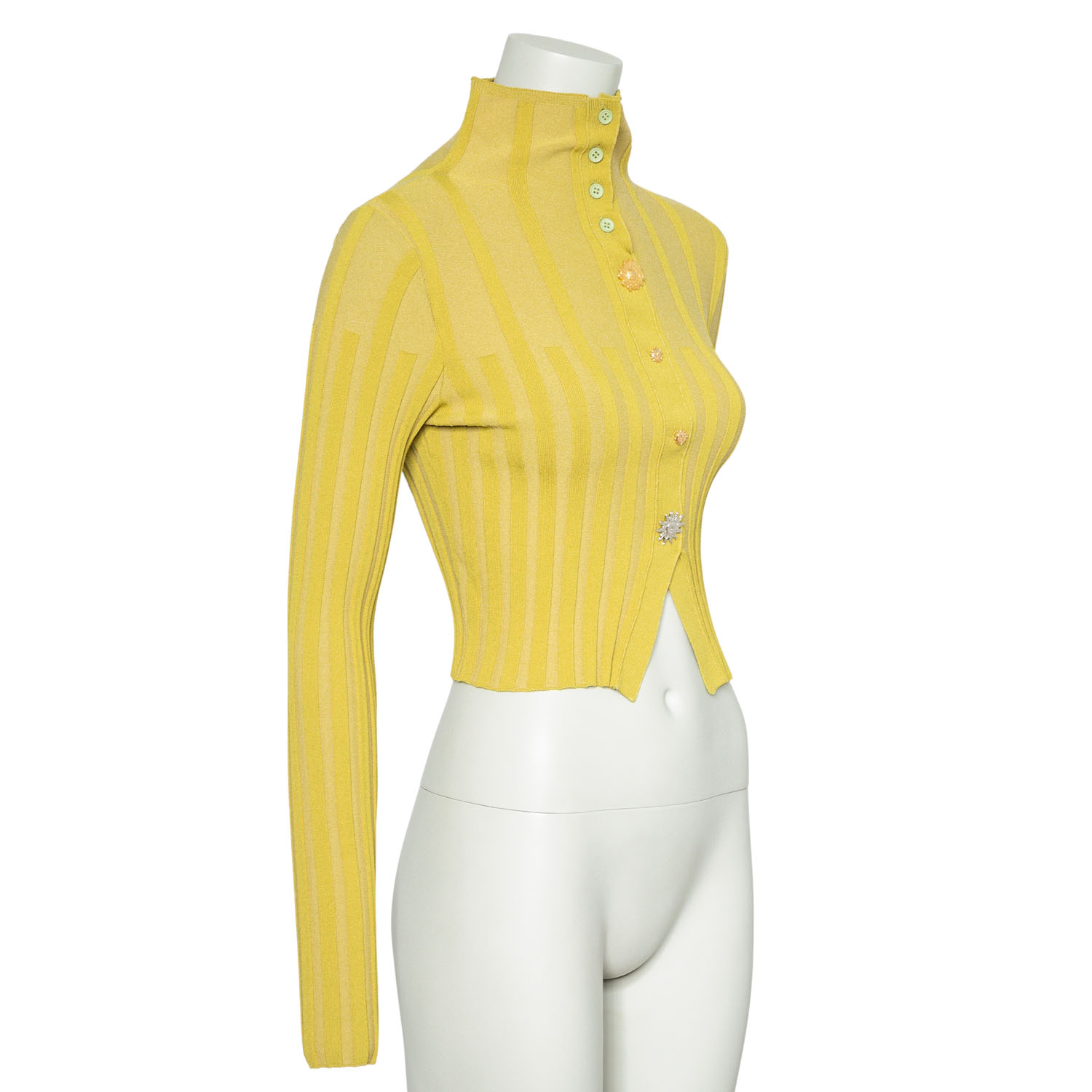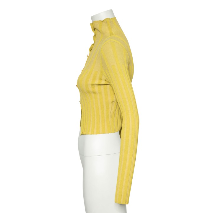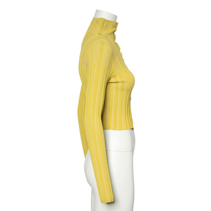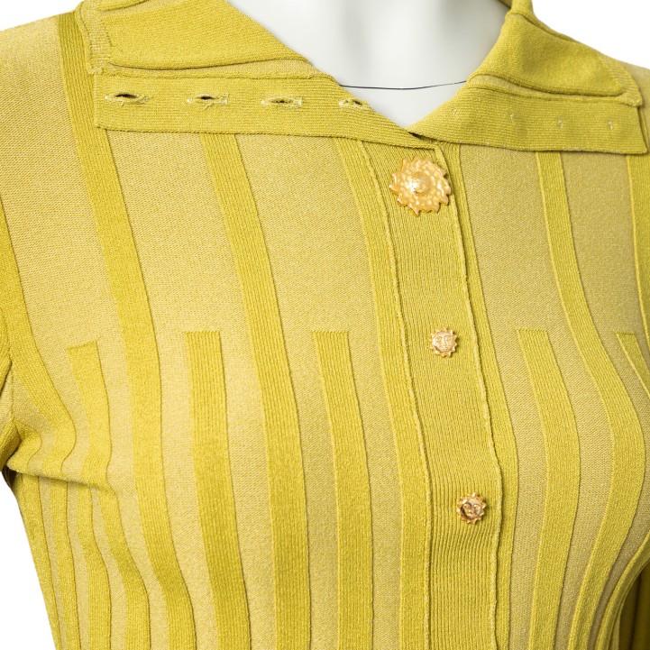 Grünes, verkürztes Modell aus Rippstrick mit Zierknöpfen. Tragespuren vorhanden.