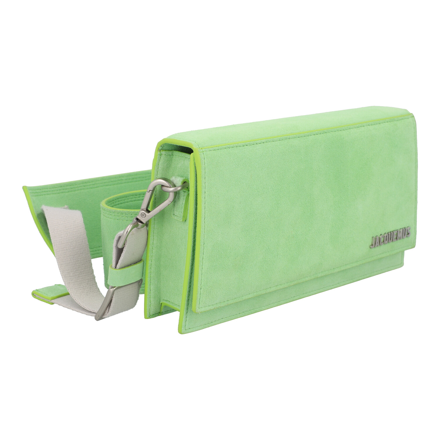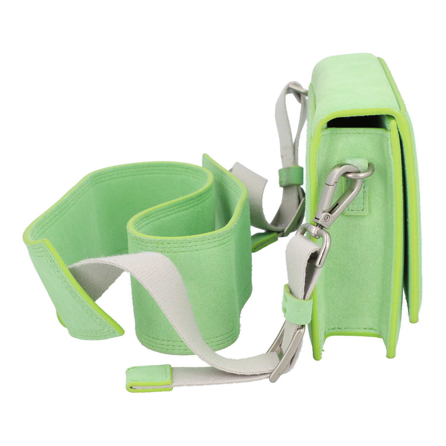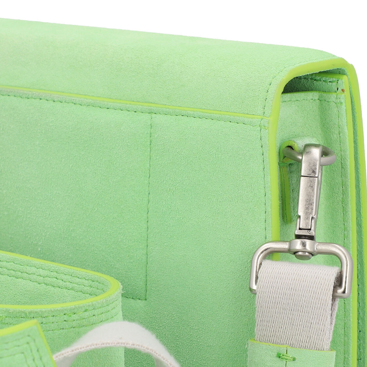 Hellgrünes Wildleder mit silberfarbener Hardware, Überschlag mit magnetischem Verschluss und Logo-Dekor. Rückseitiges Außenfach sowie abnehmbarer, längenverstellbarer Schulterriemen aus Textil und Veloursleder. Innenraum aus Textil mit einem Fach. Staubbeutel anbei. Tragespuren vorhanden. 23 x 4 x 13 cm.