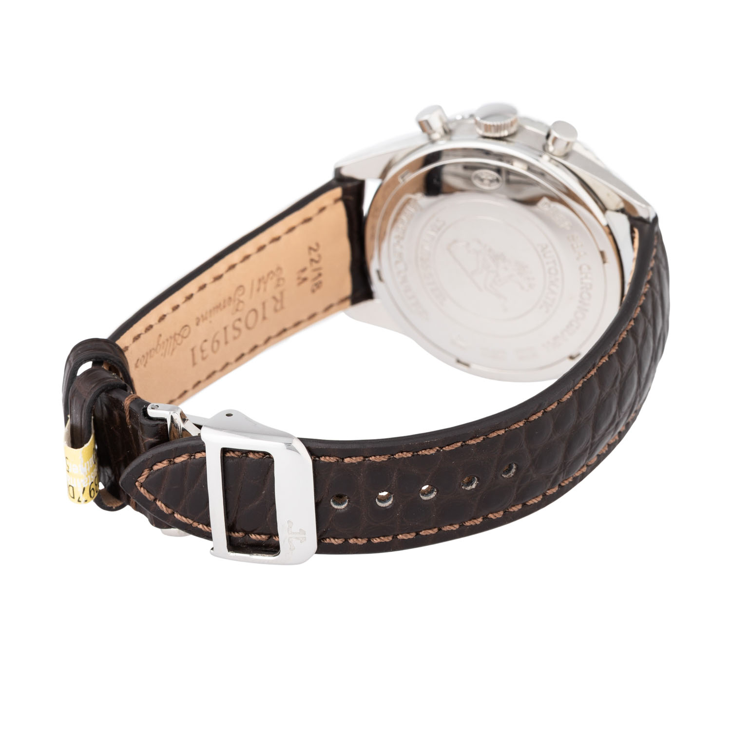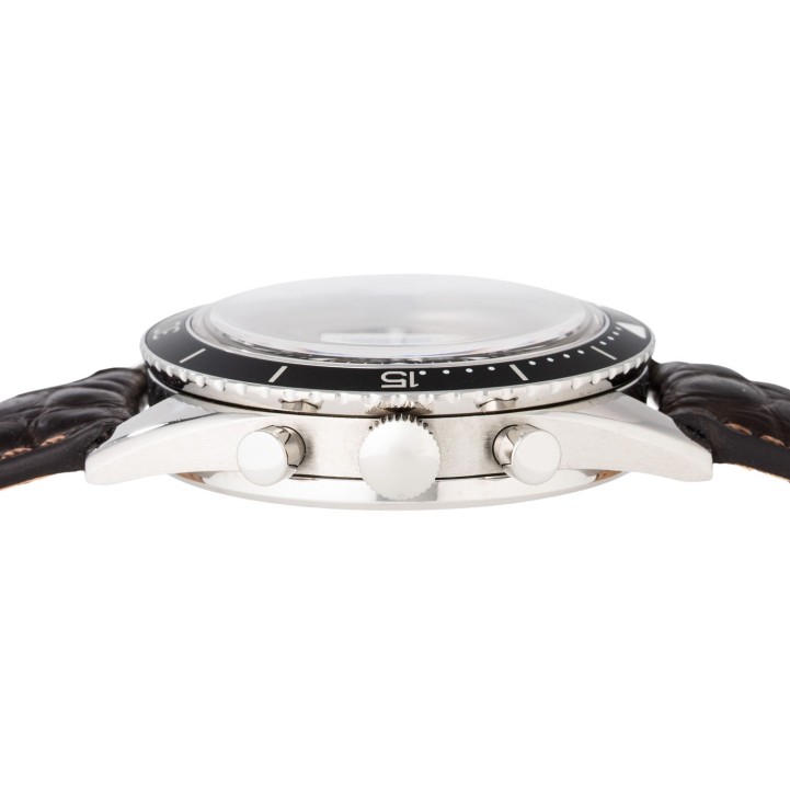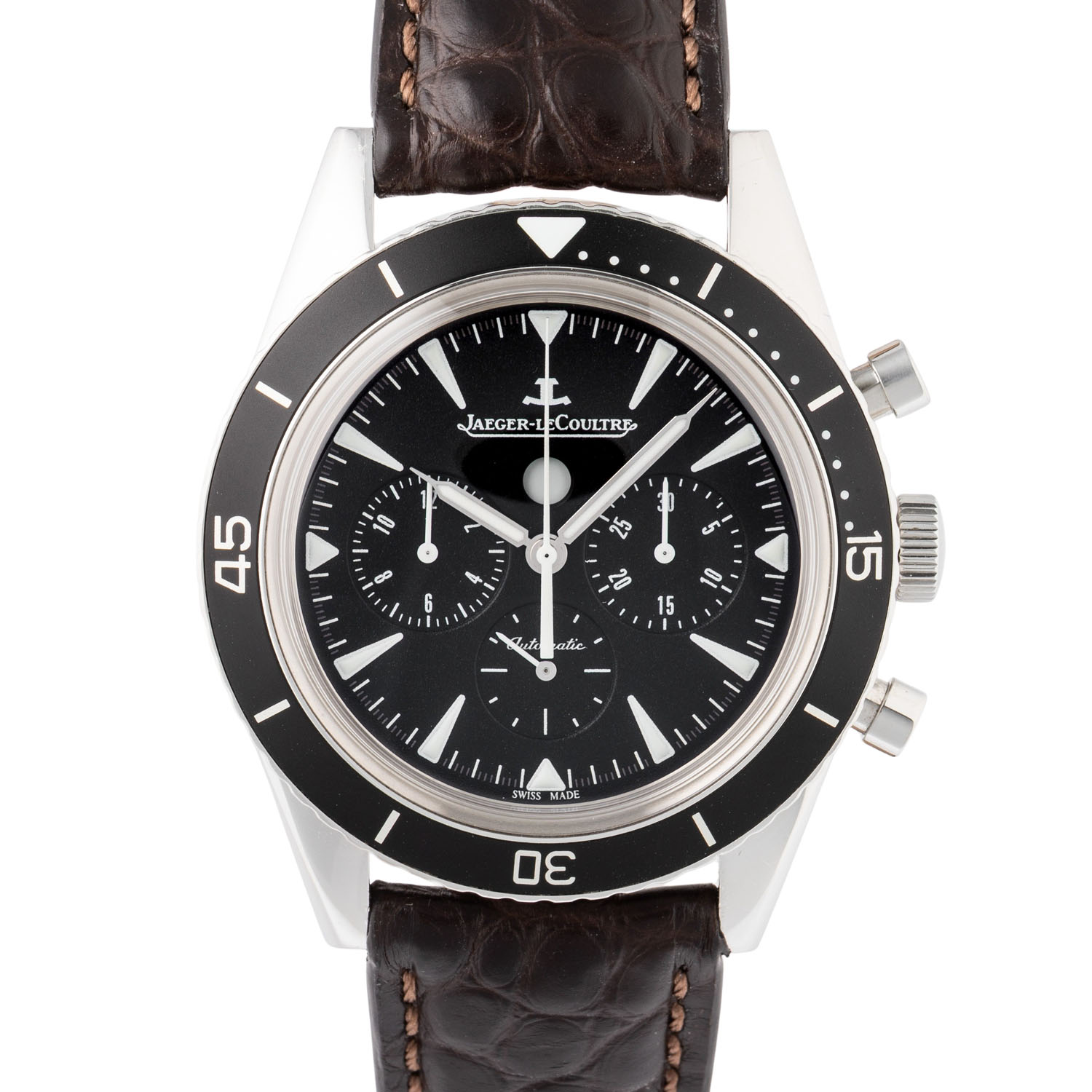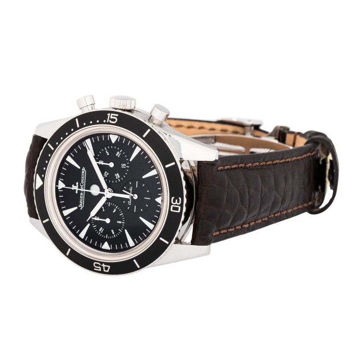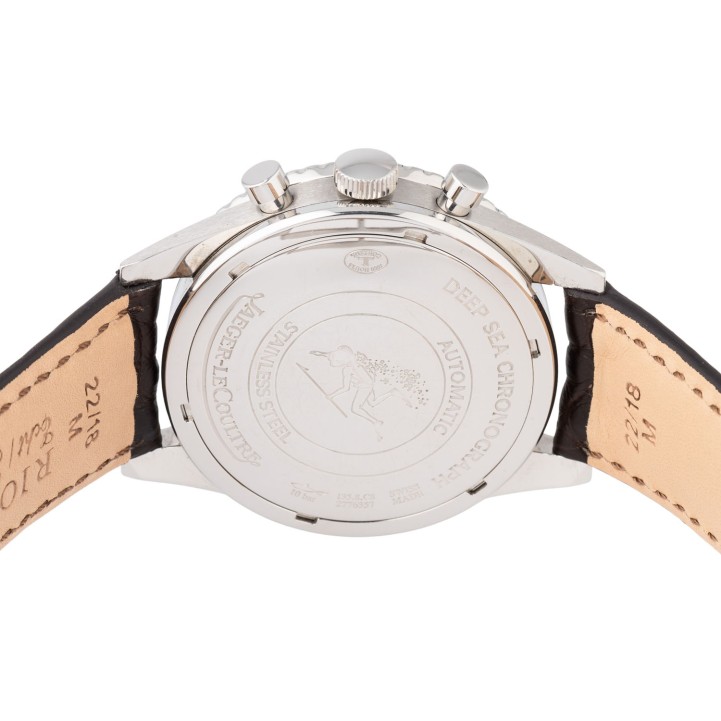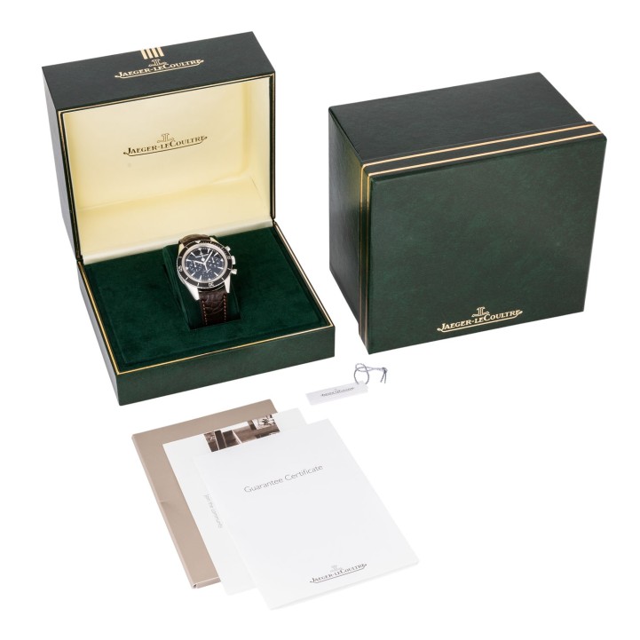 Edelstahl. Seriennummer 2776357. Automatik-Werk Kal. JLC 758 mit guten Gangwerten (+2 s/d. 248° Amplitude). Schwarzes Zifferblatt mit Pfeilindizes, 3 Totalisatoren, kleiner Sekunde und Ganganzeige des Chronographen. Neues Lederband mit der originalen JLC Faltschließe aus Edelstahl. Guter Zustand mit Tragespuren. Original Box, Papier Hang Tag, Registrirungskarte und Garantiezertifikat anbei. Gekauft im Juli 2013 bei Juwelier Flash D'or S.L. - Rabat in Barcelona (Spanien). Durchmesser ca. 42 mm (gemessen ohne Krone). Passend bis zu ca. 22 cm Handgelenkumfang.