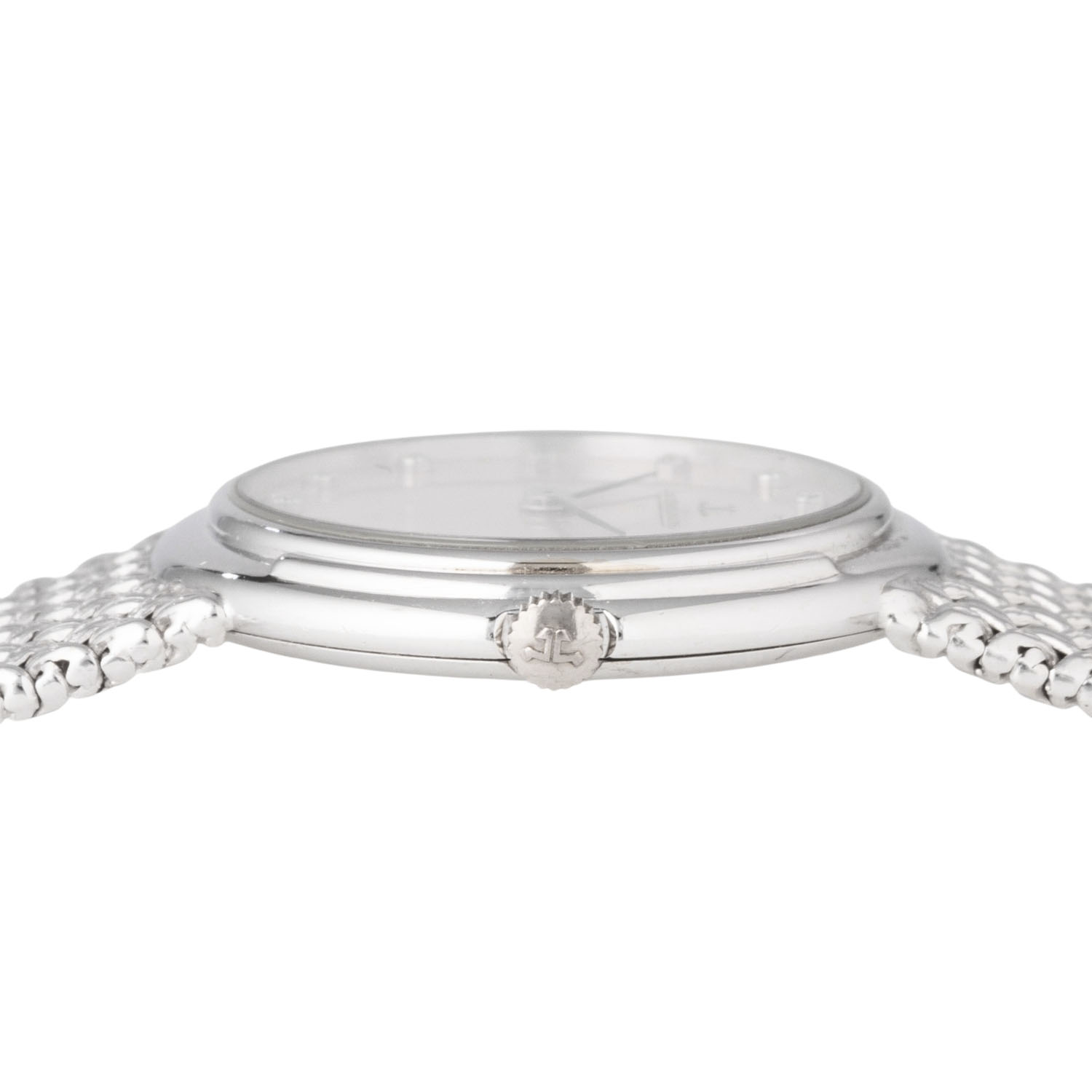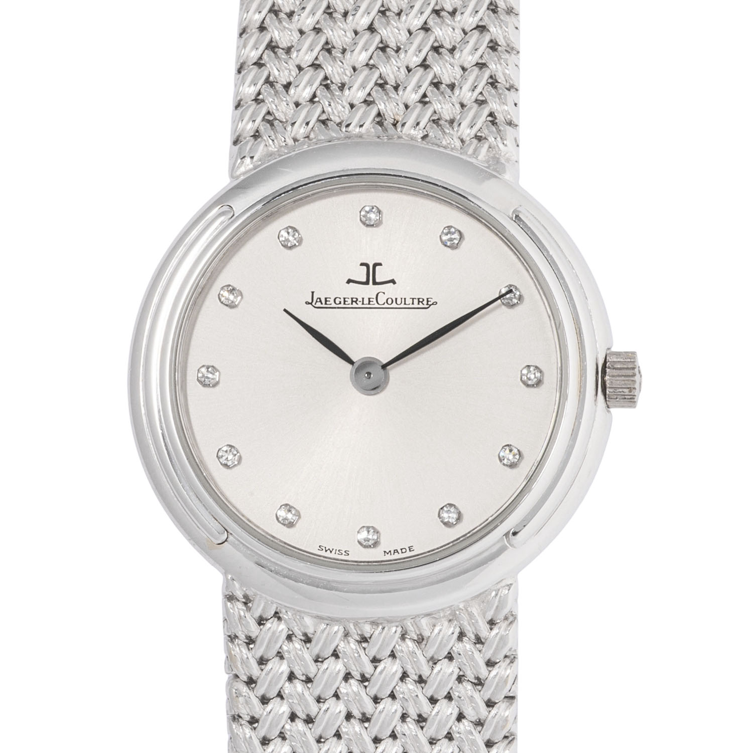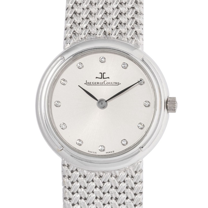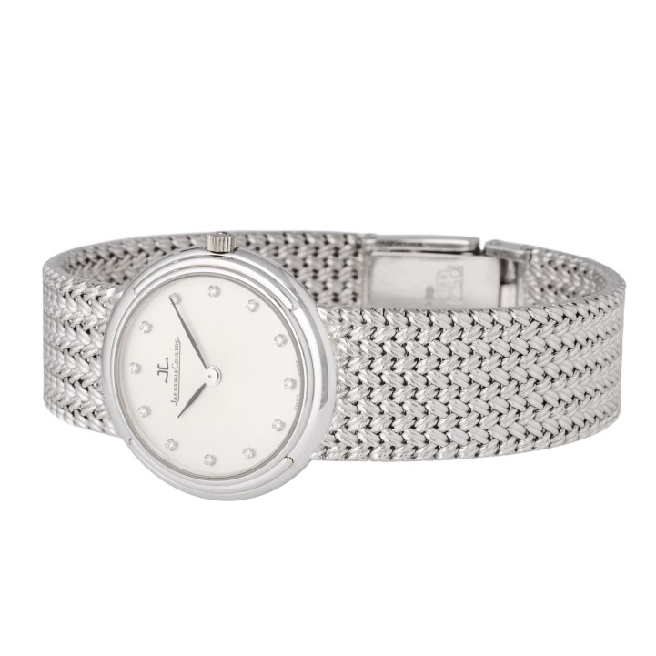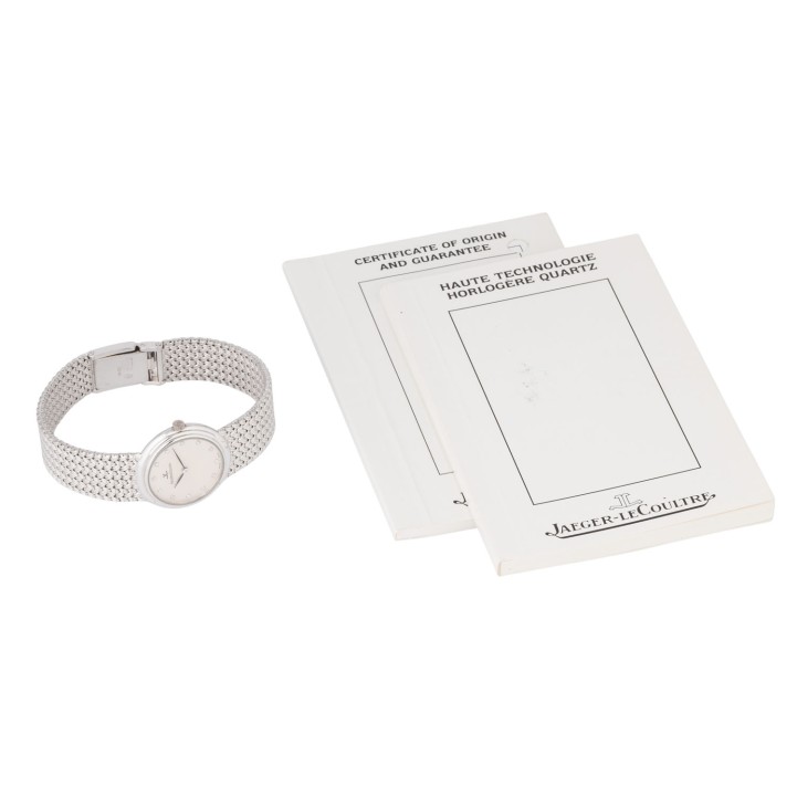 Weißgold 18K. Gehäusenummer 0030. Quarzwerk in funktionsfähigem Zustand. Neue Batterie. Silberfarbenes Zifferblatt mit Diamanten Indizes. Integriertes Jaeger-Lecoultre Armband in 18K Weißgold mit Faltschließe. Guter Zustand mit leichten Tragespuren. Anleitung, Garantieheft und Garantiezertifikat anbei. Gekauft bei Sincere watches in Singapur. Durchmesser ca. 25 mm (gemessen ohne Krone). Passend bis zu ca. 16,5 cm Handgelenkumfang.