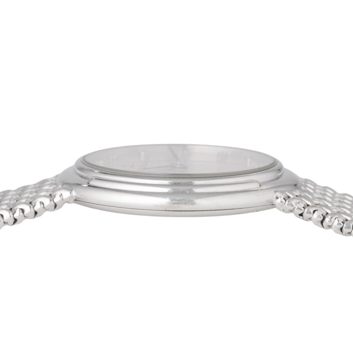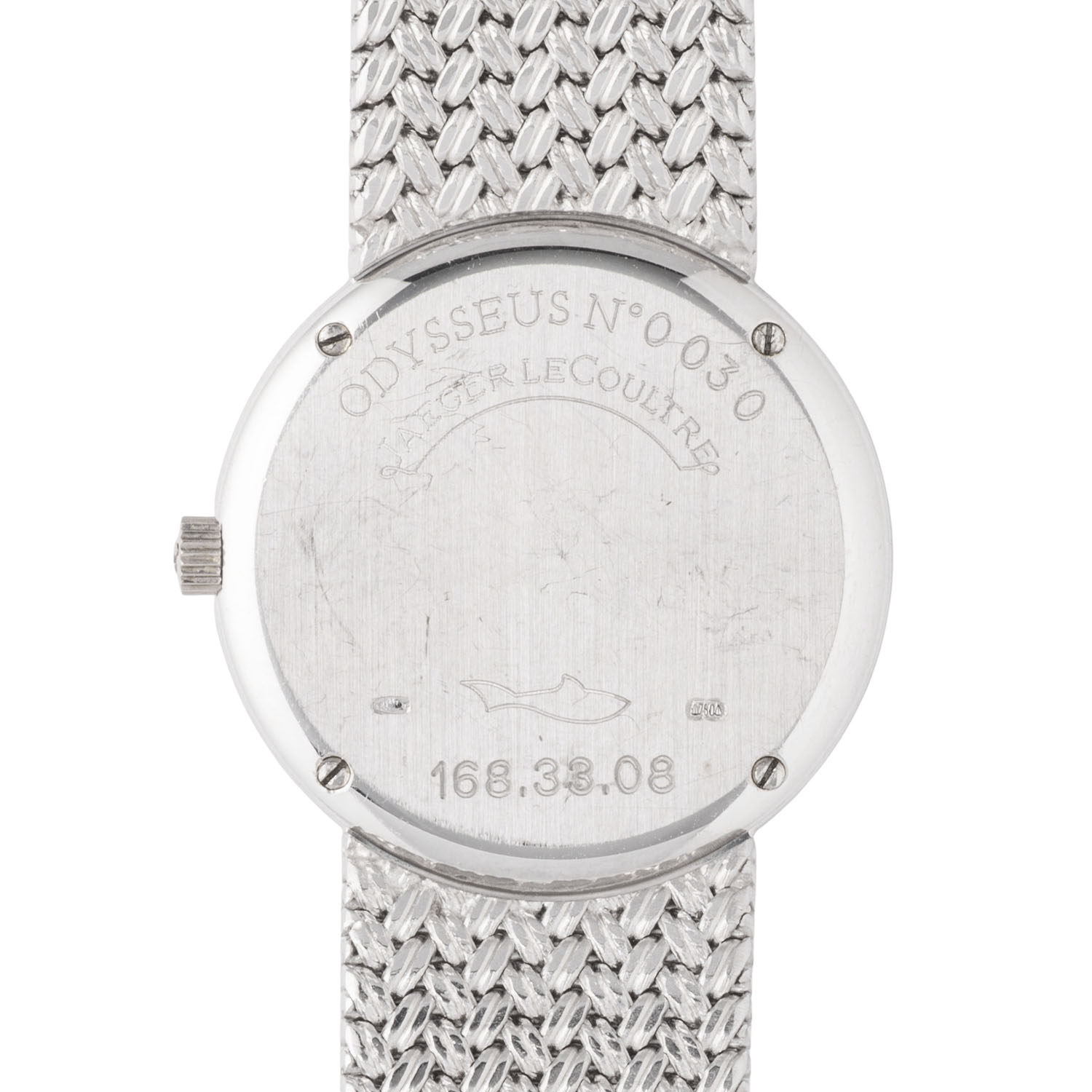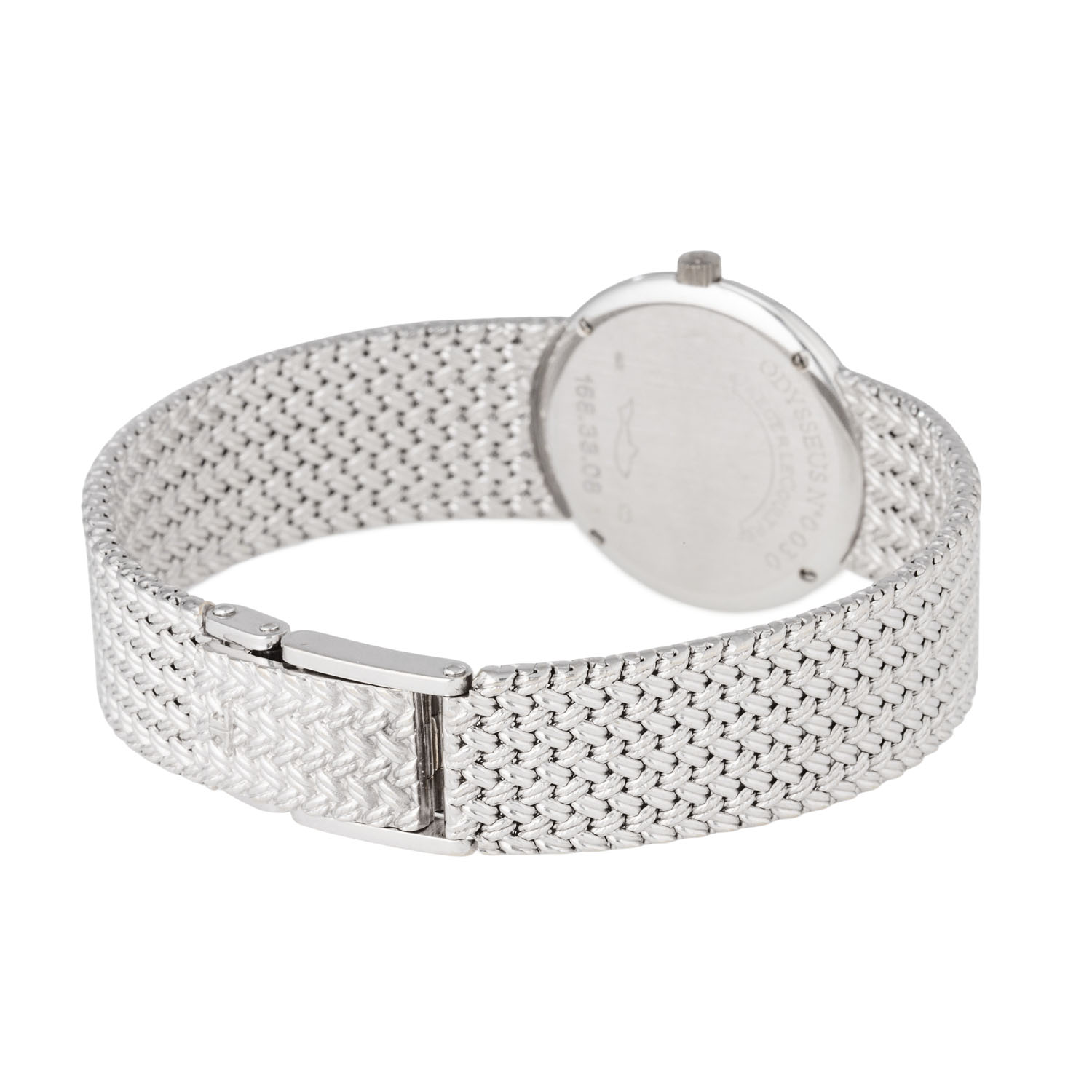 Weißgold 18K. Gehäusenummer 0030. Quarzwerk in funktionsfähigem Zustand. Neue Batterie. Silberfarbenes Zifferblatt mit Diamanten Indizes. Integriertes Jaeger-Lecoultre Armband in 18K Weißgold mit Faltschließe. Guter Zustand mit leichten Tragespuren. Anleitung, Garantieheft und Garantiezertifikat anbei. Gekauft bei Sincere watches in Singapur. Durchmesser ca. 25 mm (gemessen ohne Krone). Passend bis zu ca. 16,5 cm Handgelenkumfang.