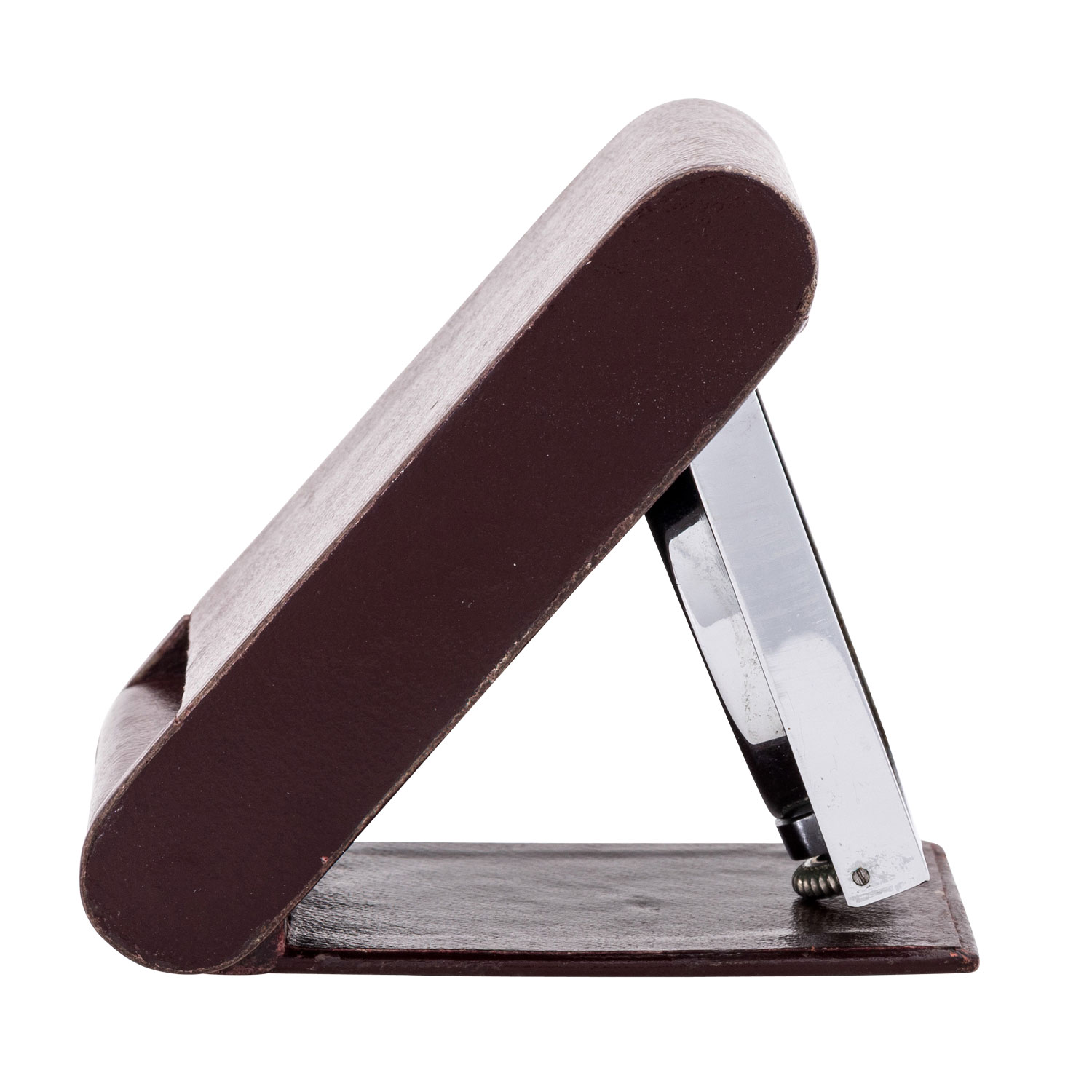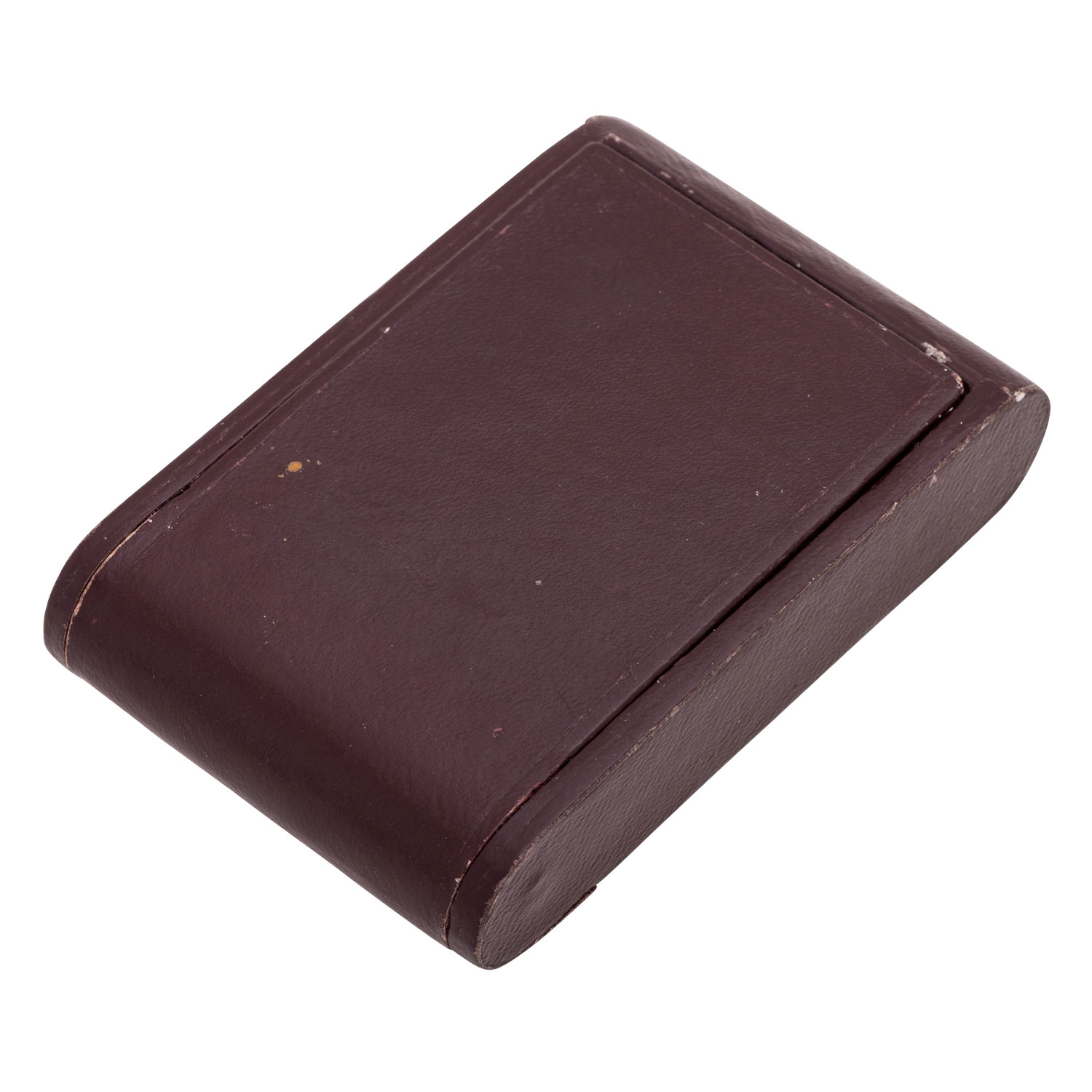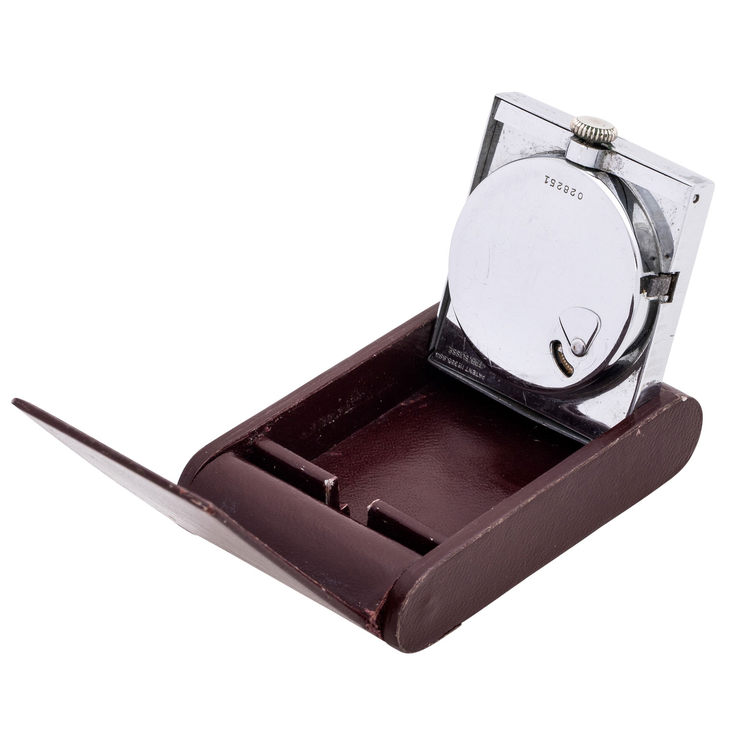 Leder/verchromter Stahl. Handaufzugswerk in funktionsfähigem Zustand. Schwarzes Zifferblatt. Leuchtzeiger und Indizes. Mit Anzeige von Wochentag, Datum und Monat. Dem alter entsprechende Gebrauchsspuren am Gehäuse und Lederetui. Größe 84 mm x 54 mm x 18 mm.