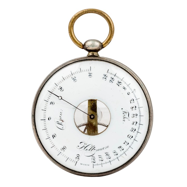Wien / Österreich, um 1850-1880, doppelseitig verglastes Thermometer in Taschenuhrenform, Emailzifferring mit arabischen Skalen der Temperatur in Celsius und Fahrenheit, im unteren Teil bezeichnet: „Holtzman / Wien“. D: 50 mm. Alters- und Gebrauchsspuren, Zeiger ergänzt.