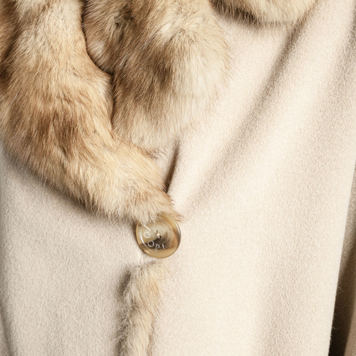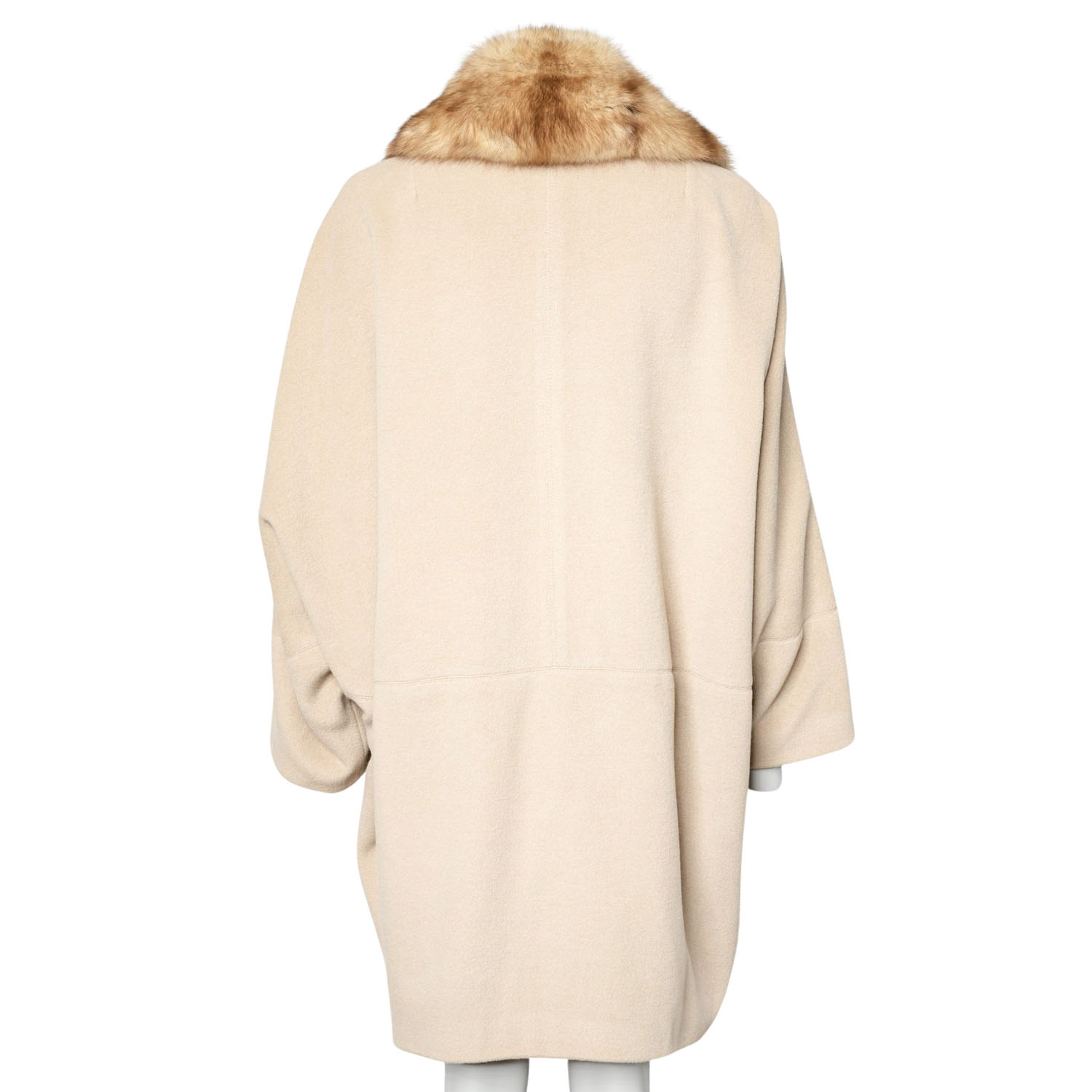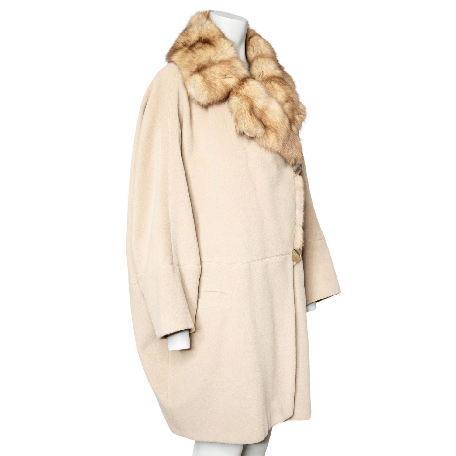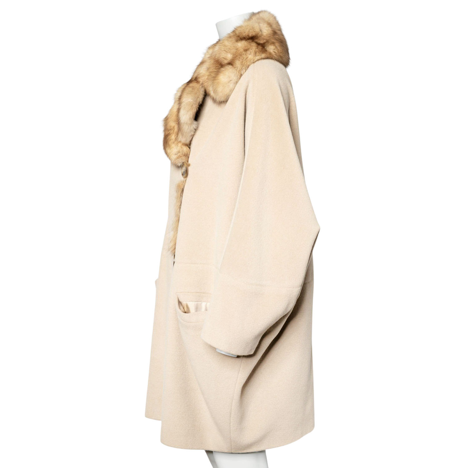 Wollmantel in Beige mit Pelzbesatz am Reverskragen. Knopfverschluss und zwei seitliche Eingrifftaschen. Guter Erhalt.