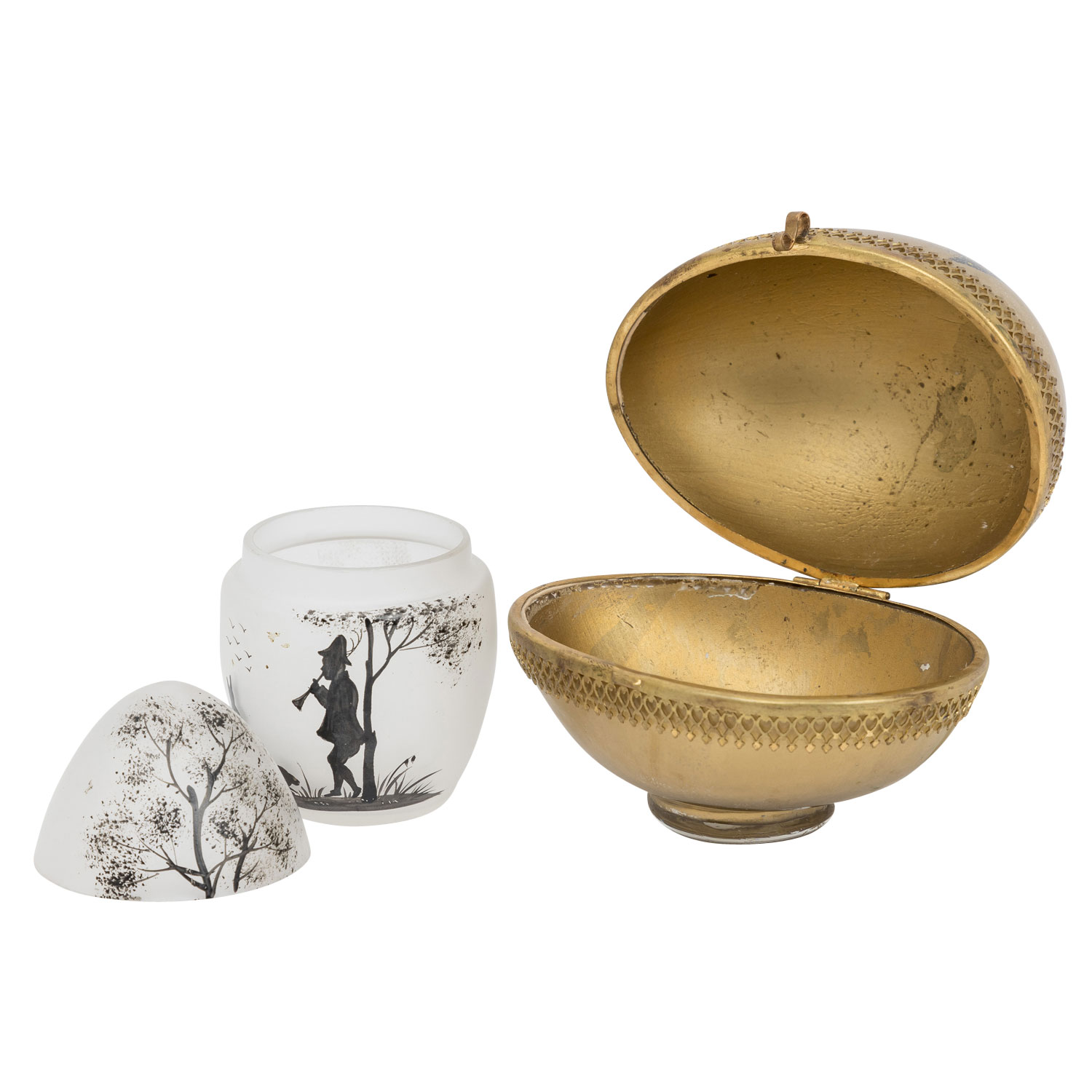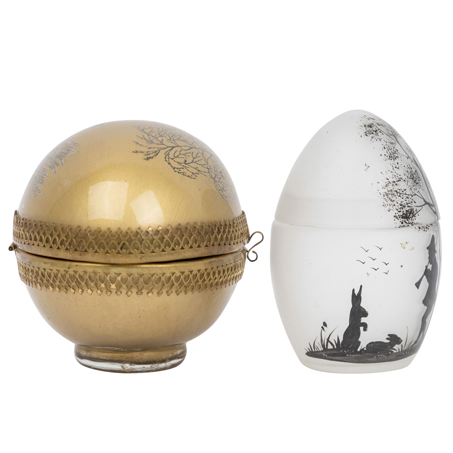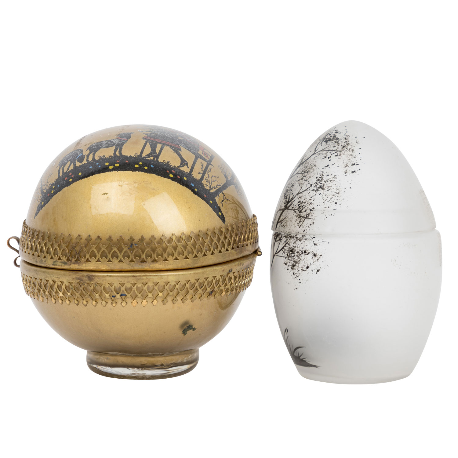 bestehend aus großer, liegender Deckeldose mit goldfarbenem Fond, Deckel mit Scharnier befestigt, aufklappbar, umlaufende, ornamentale Messing-Montur, L 12, 5 cm sowie eine stehende, transparente Deckeldose mit abnehmbaren Deckel, H 10, 5 cm, beide mit Schwarzlotmalerei in Scherenschnitt-Manier, Altersspuren, tlw. berieben.