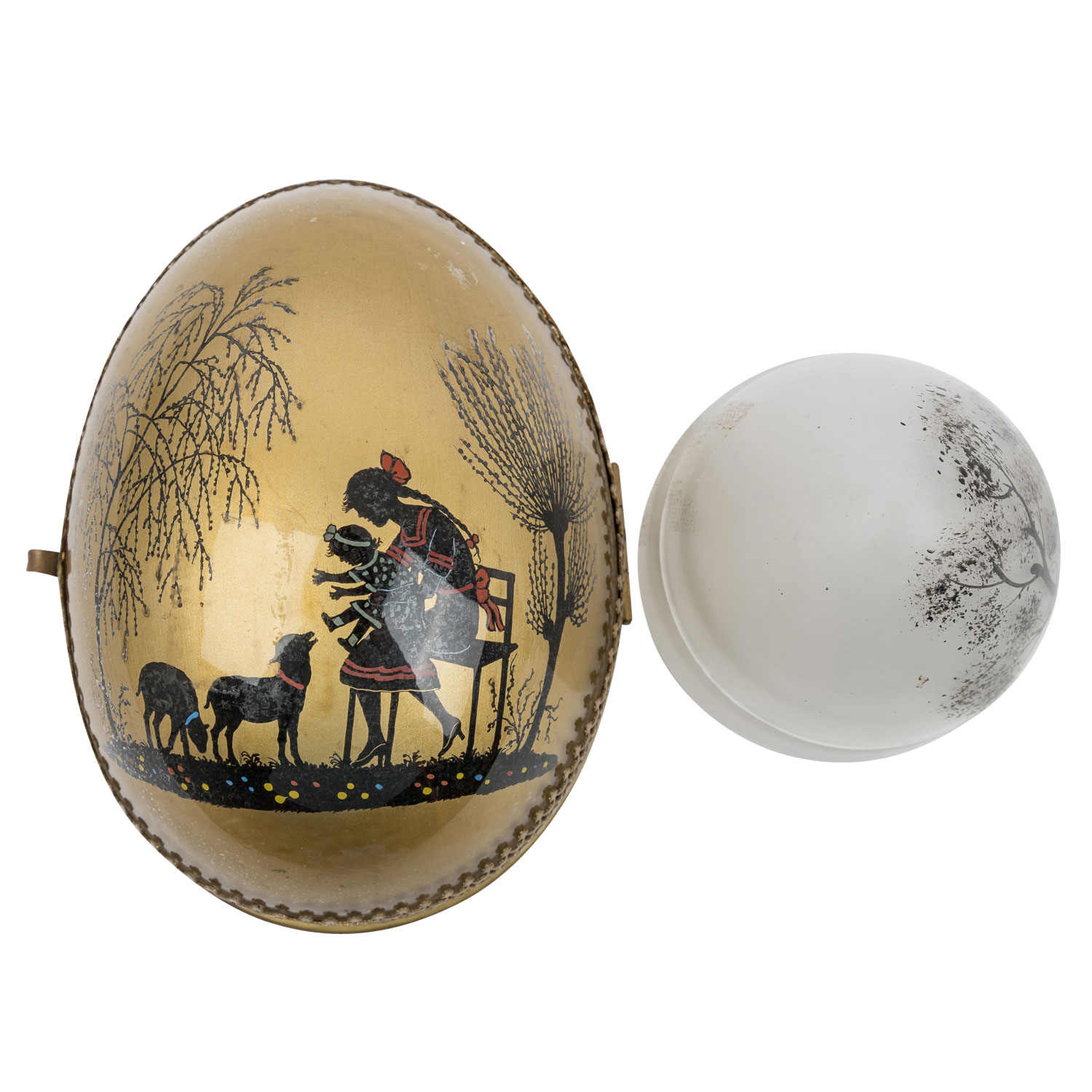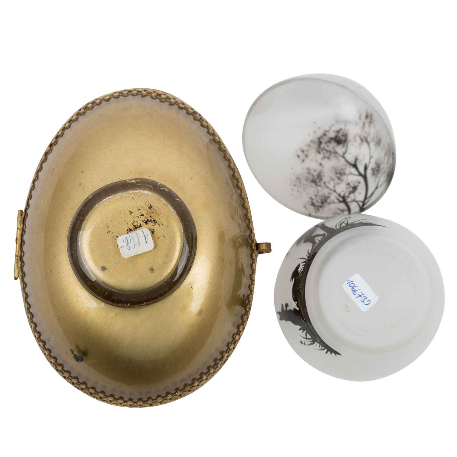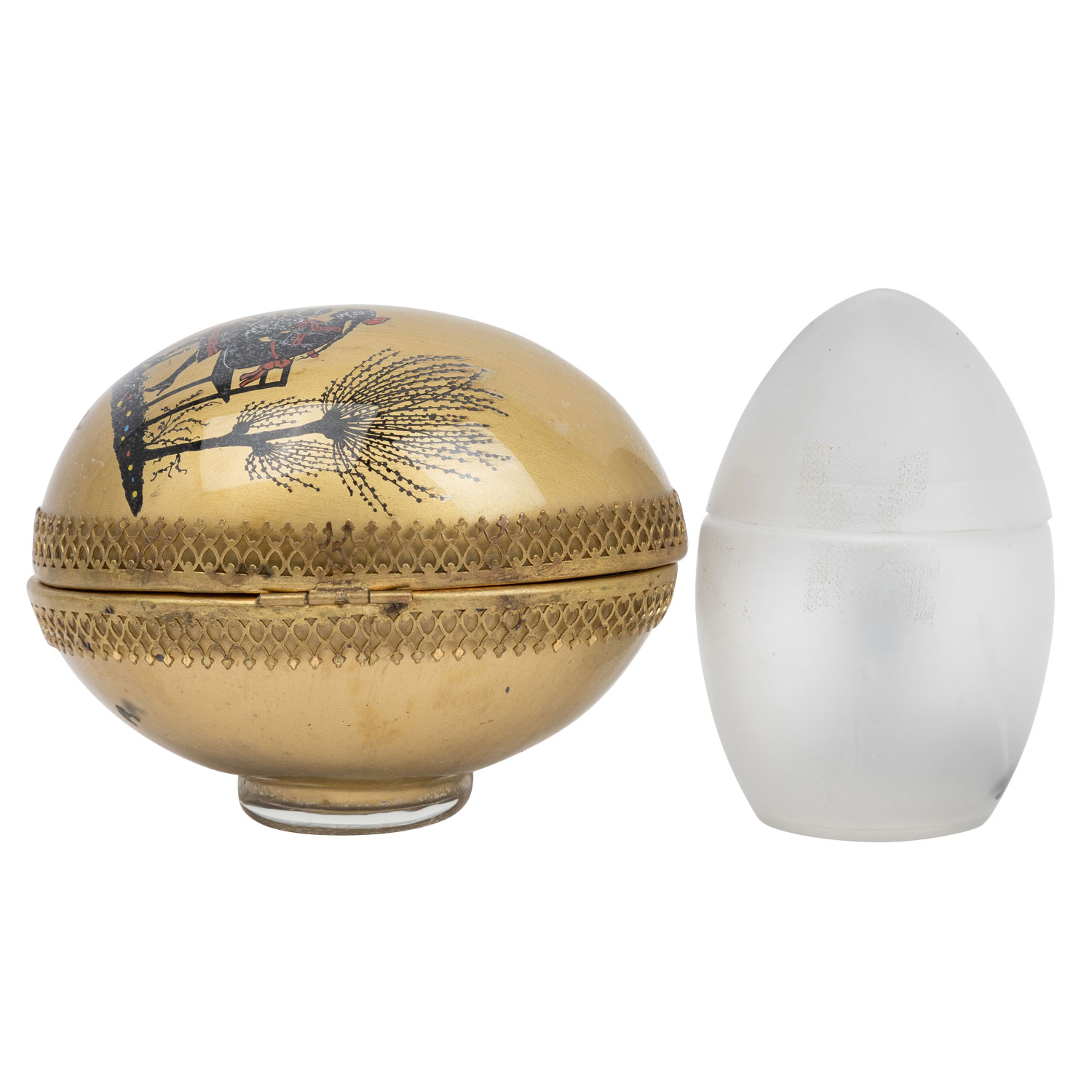 bestehend aus großer, liegender Deckeldose mit goldfarbenem Fond, Deckel mit Scharnier befestigt, aufklappbar, umlaufende, ornamentale Messing-Montur, L 12, 5 cm sowie eine stehende, transparente Deckeldose mit abnehmbaren Deckel, H 10, 5 cm, beide mit Schwarzlotmalerei in Scherenschnitt-Manier, Altersspuren, tlw. berieben.