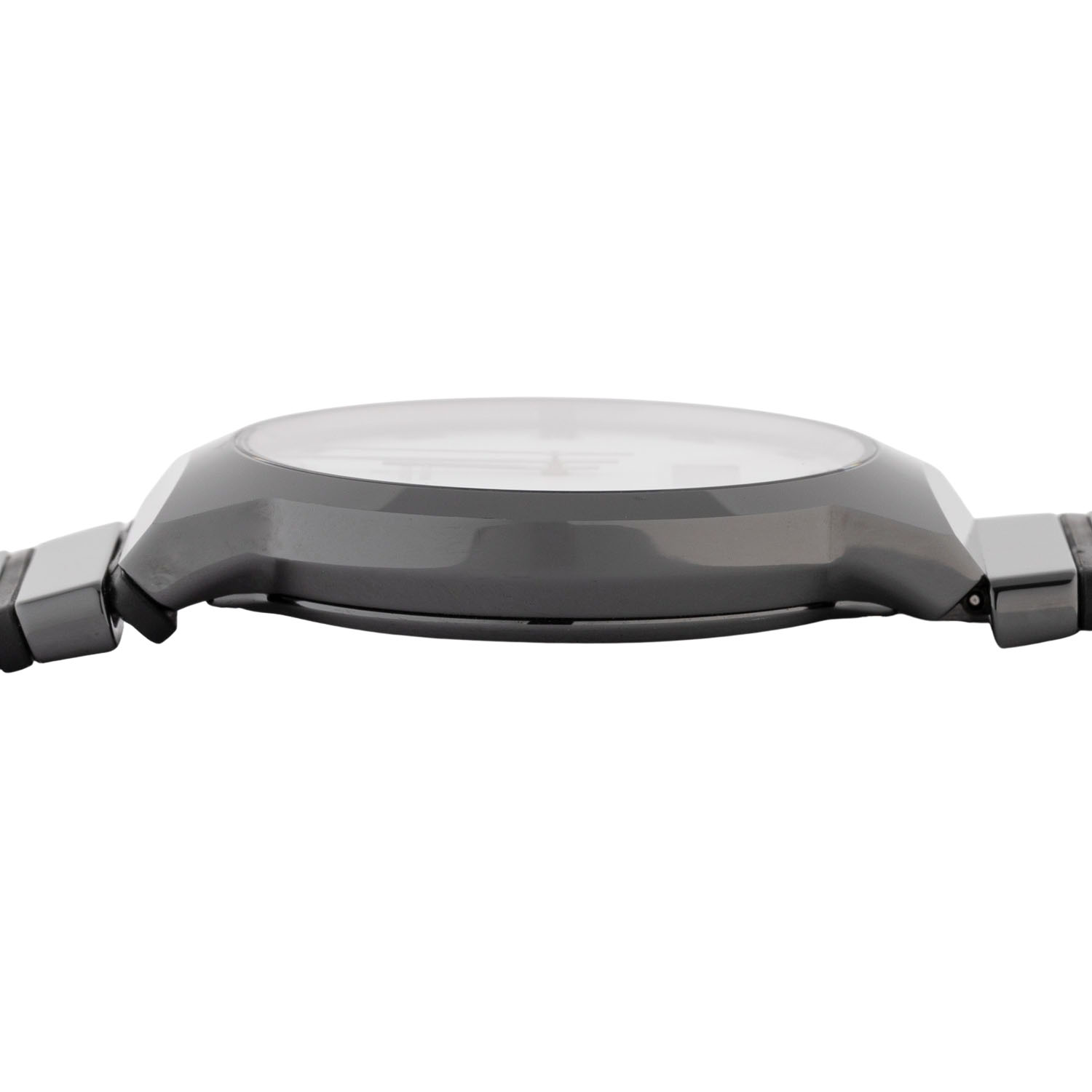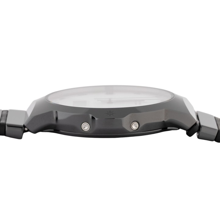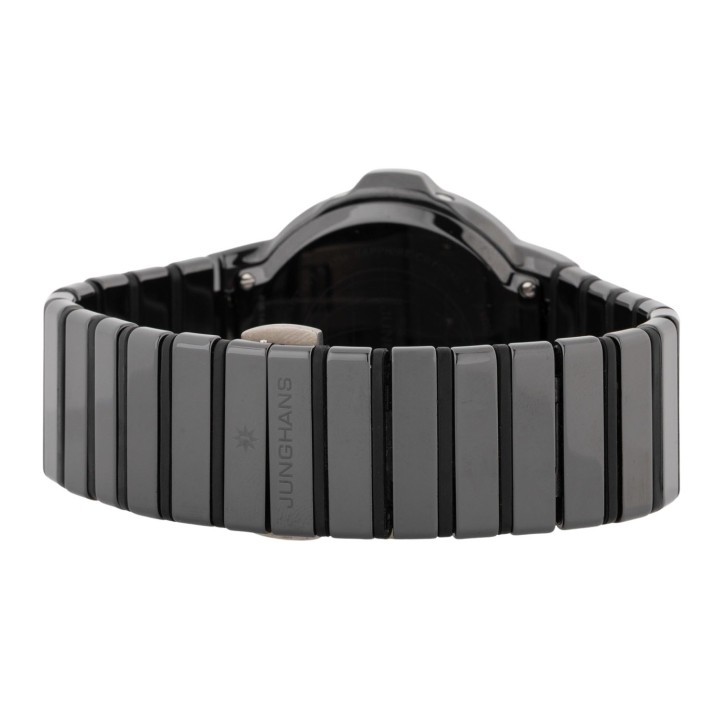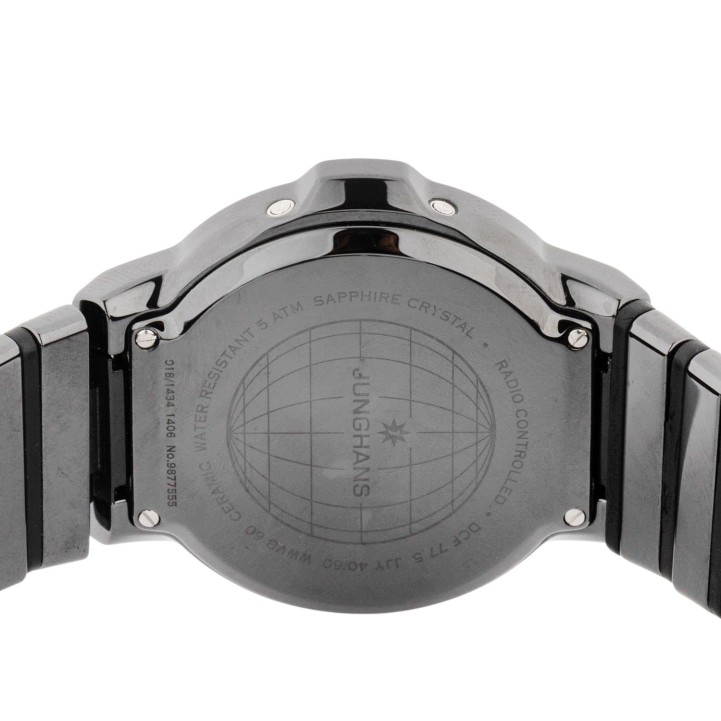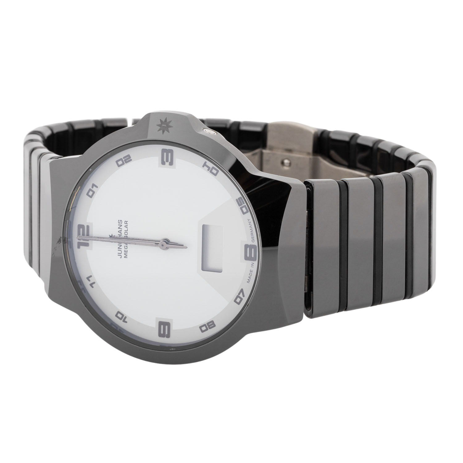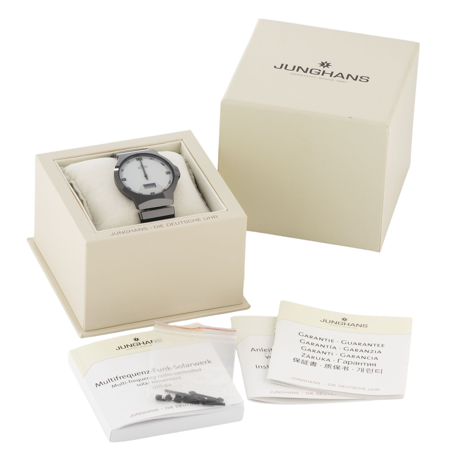 Keramik. Seriennummer 9877555. Multifrequenz Funk-Solarwerk J615.84 in funktionsfähigem Zustand. Graues Zifferblatt mit arabischen Ziffern und digitaler Datumsanzeige. Junghans Keramik Armband mit Faltschließe aus Titan. Armband ist reparaturbedürftig, da Kautschuk Zwischenteile defekt (alte Zwischenteile anbei). Guter Zustand mit Tragespuren. Original Box, Anleitungen, Erstkaufrechnung und Garantieheft anbei. Gekauft im April 2020 in der Waiblinger Goldschmiede Scharf. Durchmesser ca. 40 mm gemessen ohne Krone. Passend bis zu einem Handgelenksumfang von ca. 19 cm.