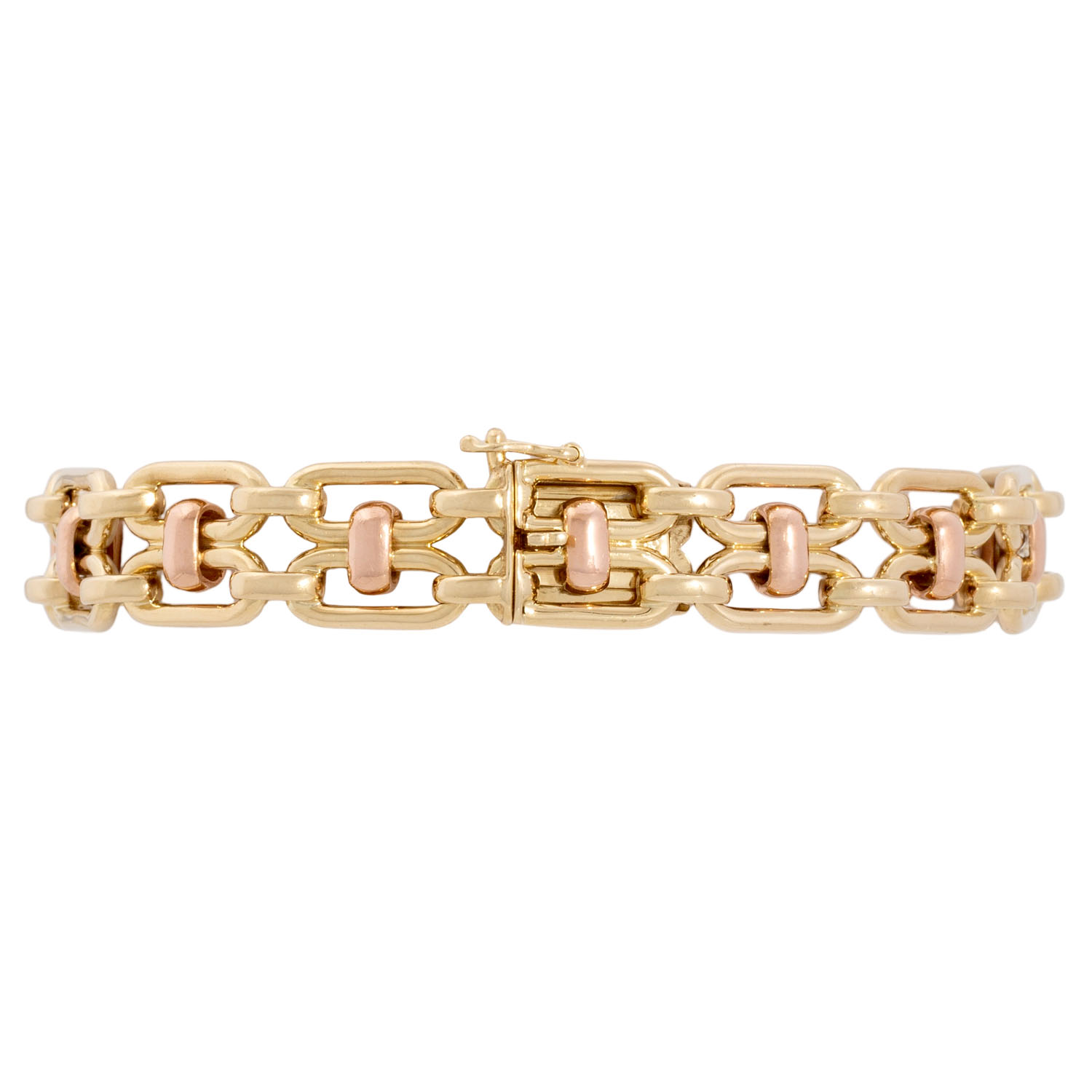 antik rechteckig facettiert, ca. 17 x 14 mm, 6 Brillanten, ges. ca. 0,32 ct, gute Farbe und Reinheit, GG/RG/WG 14K, 49,6 g, L: 19,5 cm, B (Kette/Fassung): 11/19 mm, Kastenschloß mit Sicherungsacht, Anfang 20. Jh., minimale Tragespuren.