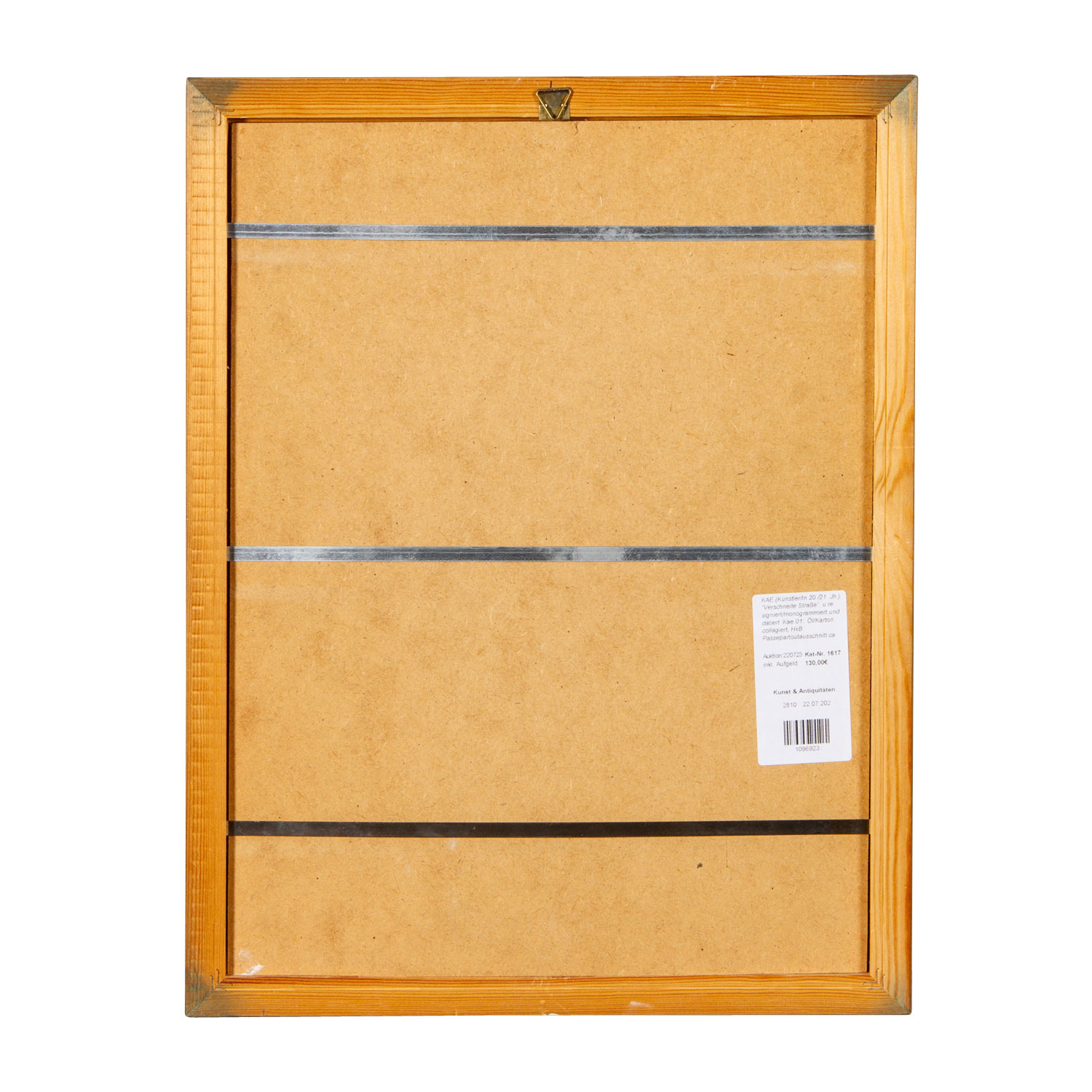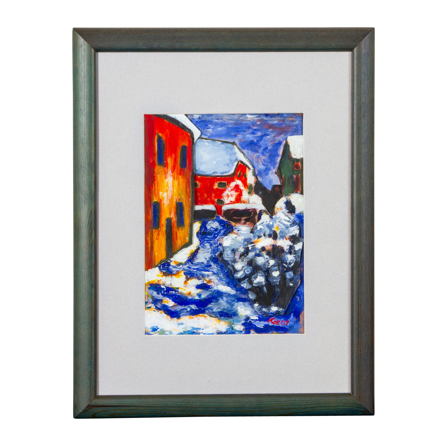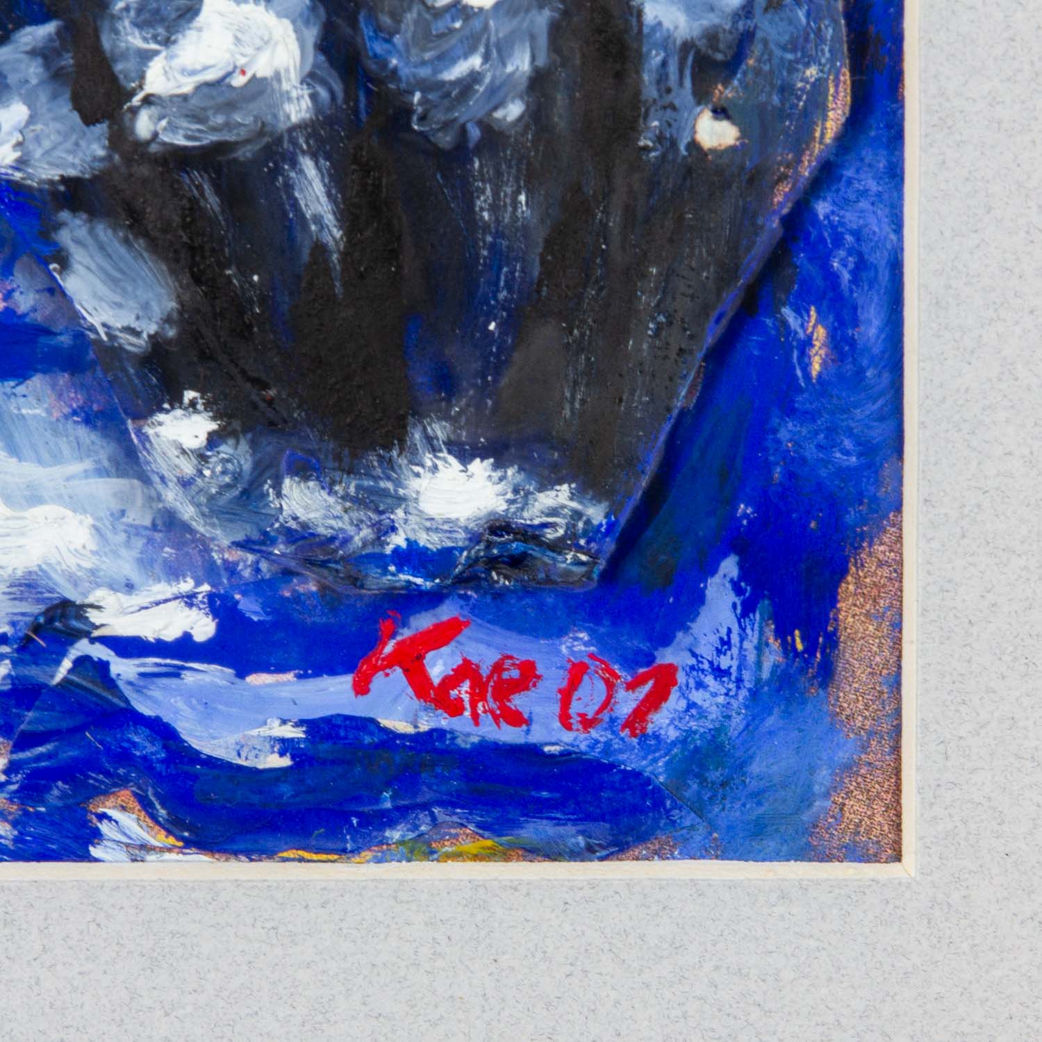 u.re. signiert/monogrammiert und datiert 'Kae 01', Öl/Karton collagiert, HxB: Passepartoutausschnitt ca. 25x18 cm (44x34 cm mit Rahmen). Leichte Altersspuren. Im Passepartout hinter Glas gerahmt.