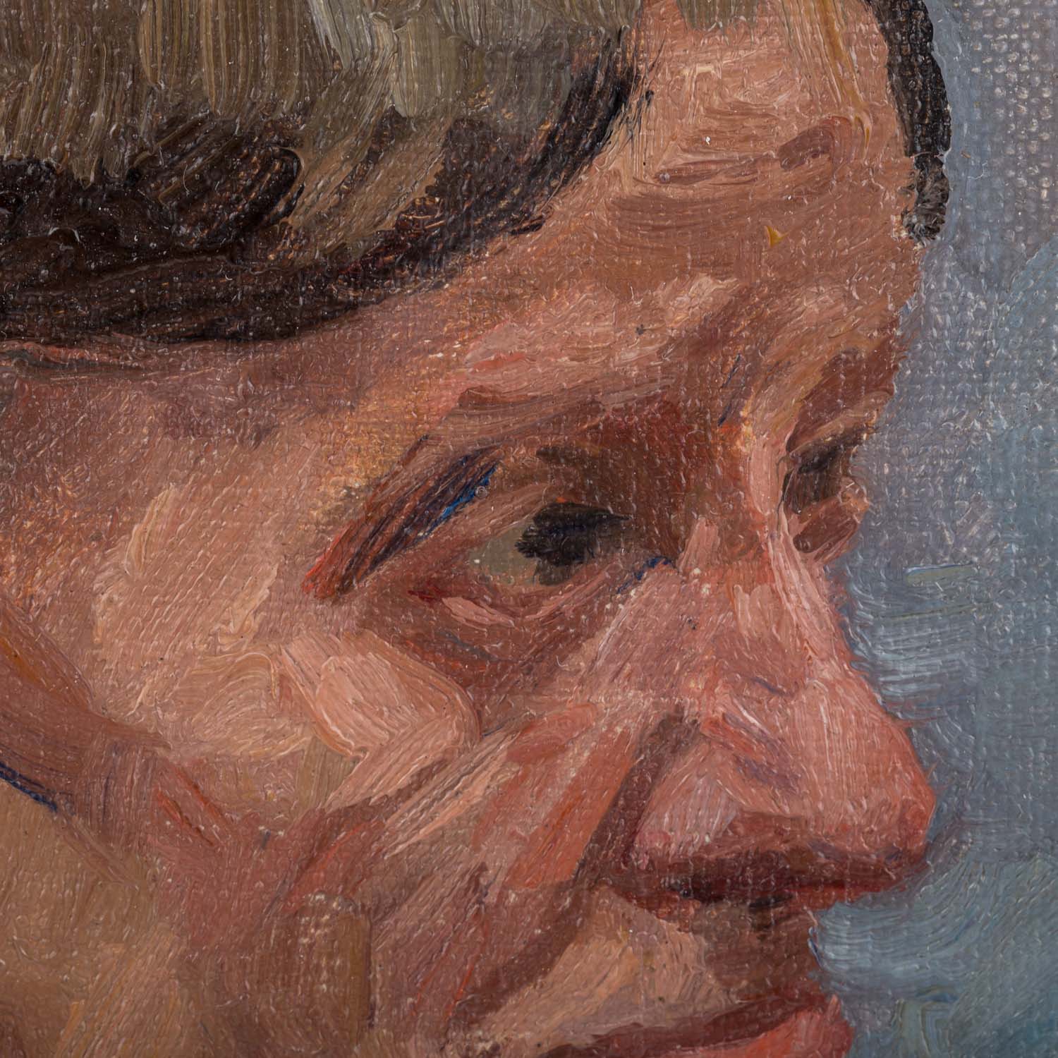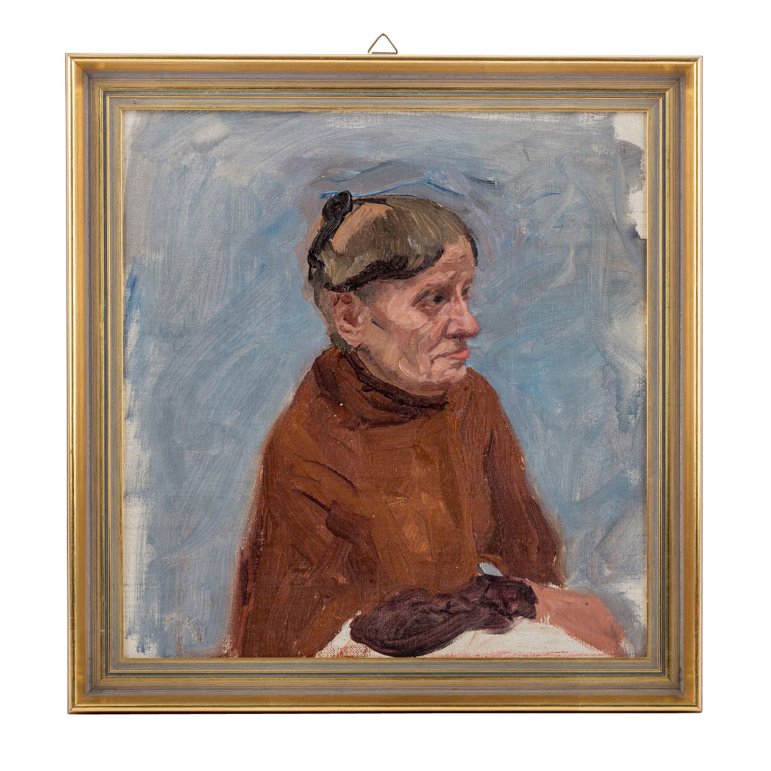 KALLMORGEN, Friedrich, ATTRIBUIERT (1856-1924), Studie "Portrait einer Dame", Brustbildnis einer älteren Frau mit brauntonigem Pullover, ins Profil gedreht vor hellblauem Hintergrund, unsigniert, u.li. undeutl. Ritzmonogramm, Öl/Leinwand auf Hartfaserplatte aufgezogen, HxB: ca. 26x25 cm (30x29 cm mit Rahmen). Restauriert. Mit Rahmen. PROVENIENZ: 1972 von Hans Knab, dem Enkel Kallmorgens, zum Geschenk erhalten.
