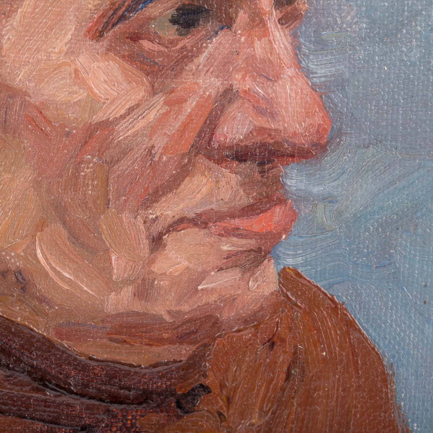 KALLMORGEN, Friedrich, ATTRIBUTED (1856-1924), Study "Portrait of a man", Portrait of a middle-aged gentleman with brown-toned pullover, turned in profile against a light blue background, unsigned, illegible scratch monogram, oil / canvas mounted on hardboard, HxW: ca. 26 x 25 cm (30 x 29 cm with frame). Restored. With frame. PROVENANCE: 1972 received as a gift from Hans Knab, the grandson of Kallmorgen.