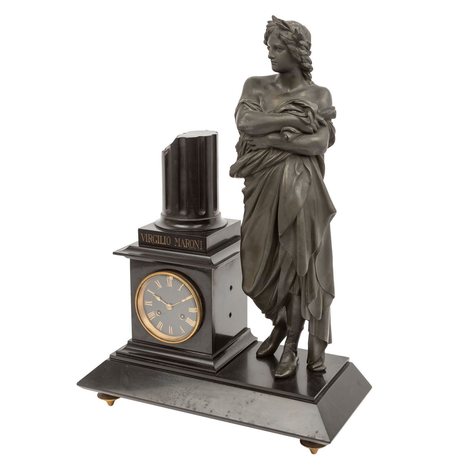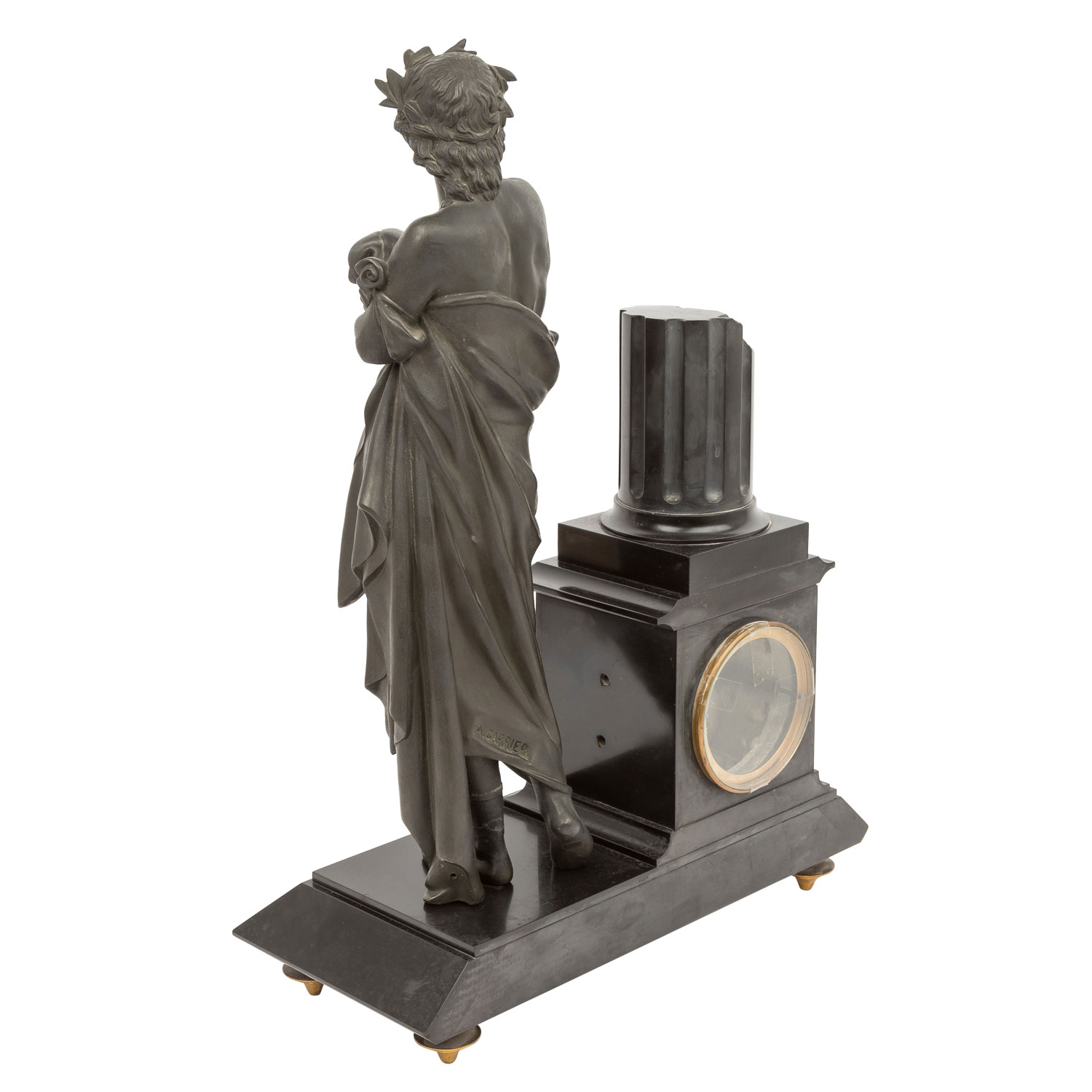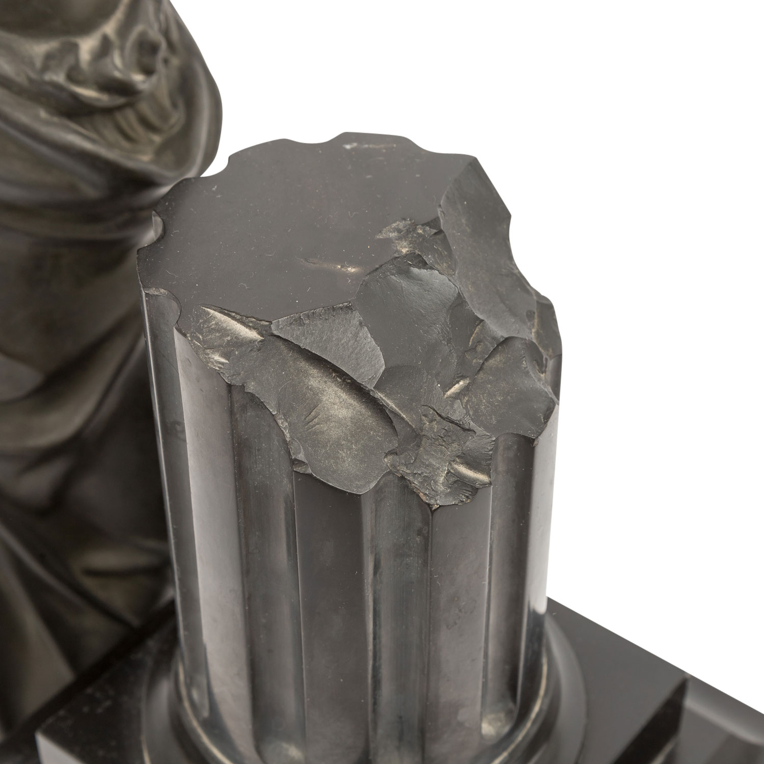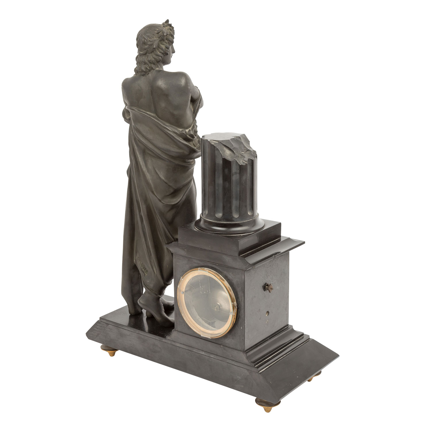 Frankreich, Ende 19. Anf. / 20. Jh., Korpus mit schwarzem Stein belegt, Uhrwerk in Form einer antiken Säulenruine, Daneben eine Metallgussfigur nach Albert-Ernest Carrier-Belleuse. HxBxT: 62/43/19,5 cm. Starke Alters- und Gebrauchsspuren, rest, Fehlteile, Werk im Kurztest funktionstüchtig, Statuette teilw. lose und mit Bruchstelle am Fuß.