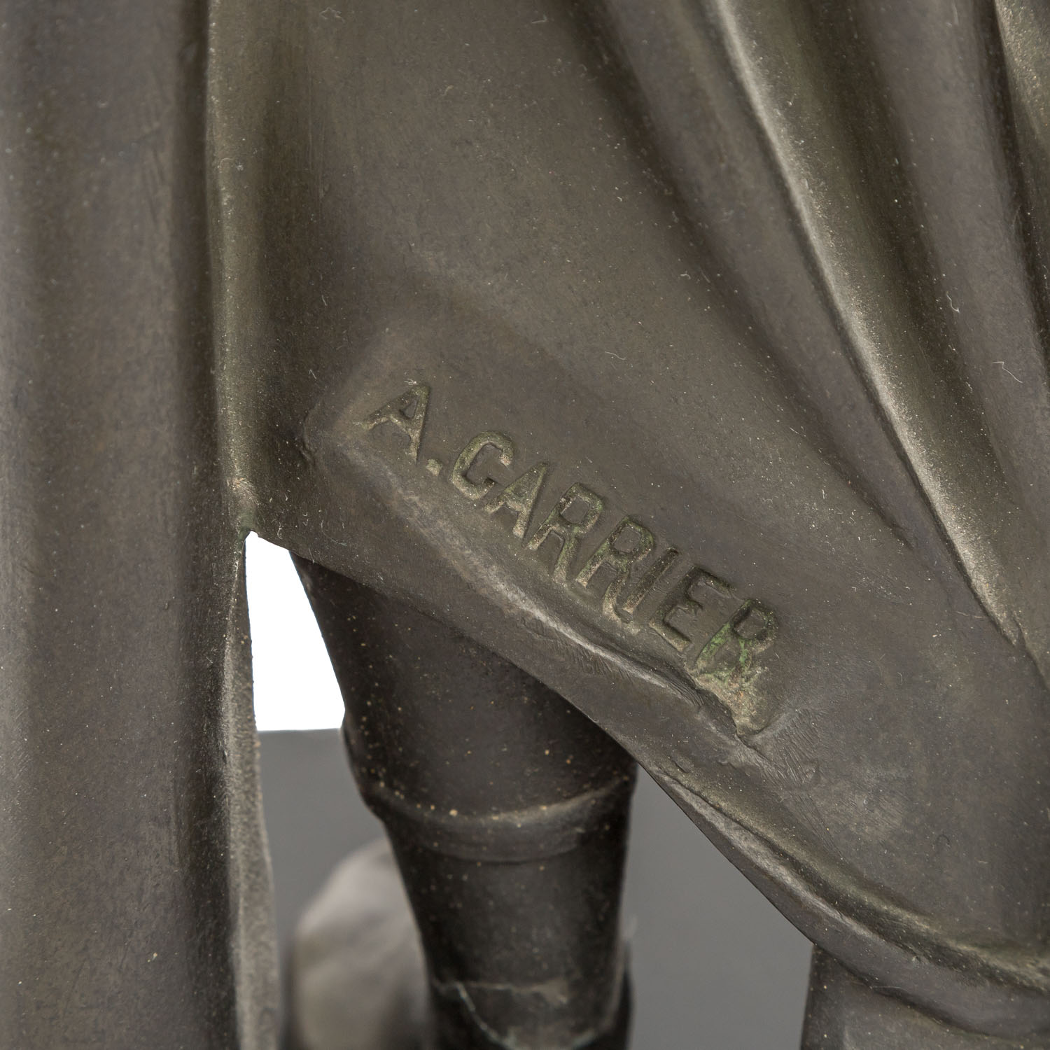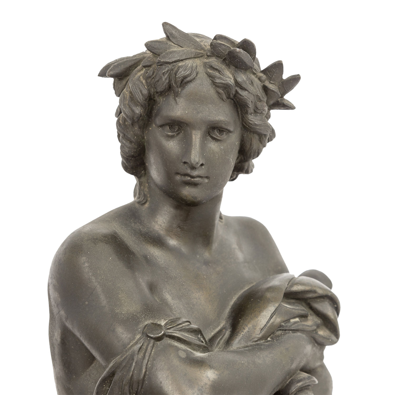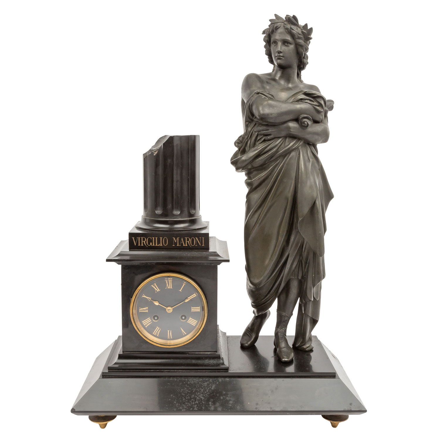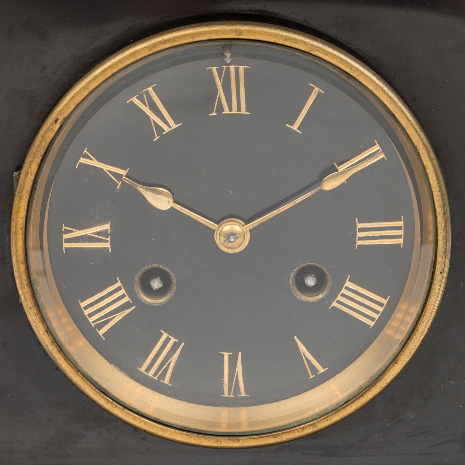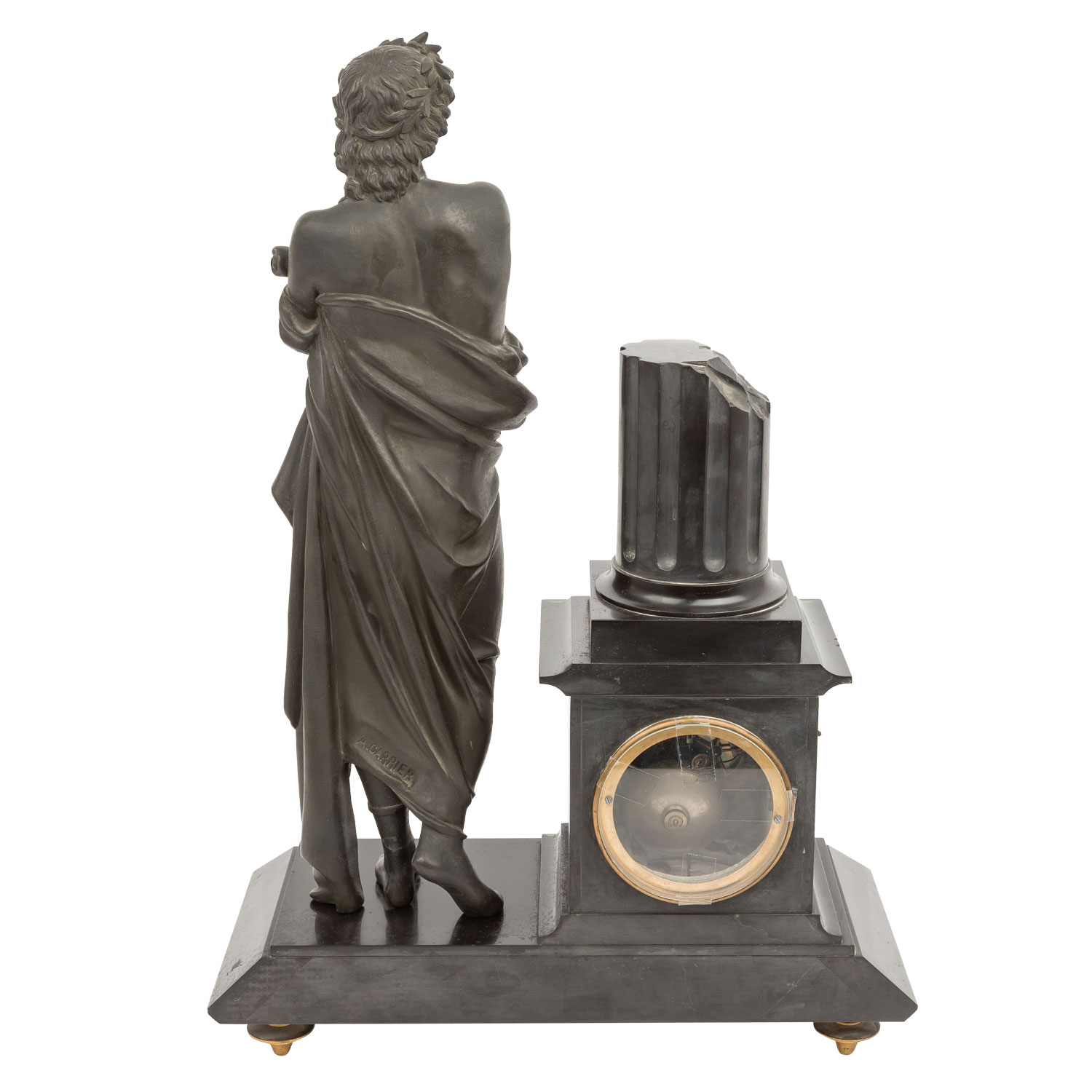 Frankreich, Ende 19. Anf. / 20. Jh., Korpus mit schwarzem Stein belegt, Uhrwerk in Form einer antiken Säulenruine, Daneben eine Metallgussfigur nach Albert-Ernest Carrier-Belleuse. HxBxT: 62/43/19,5 cm. Starke Alters- und Gebrauchsspuren, rest, Fehlteile, Werk im Kurztest funktionstüchtig, Statuette teilw. lose und mit Bruchstelle am Fuß.