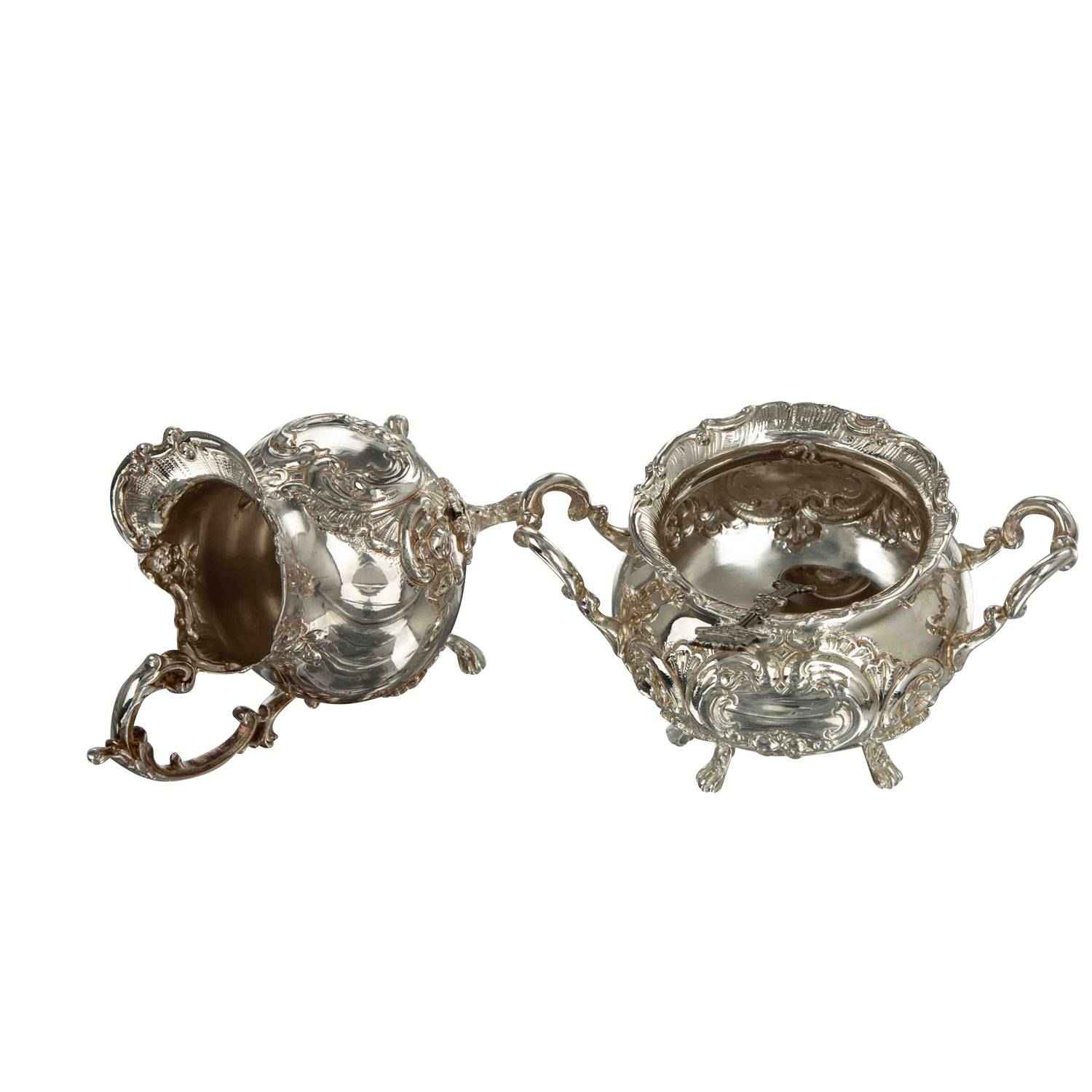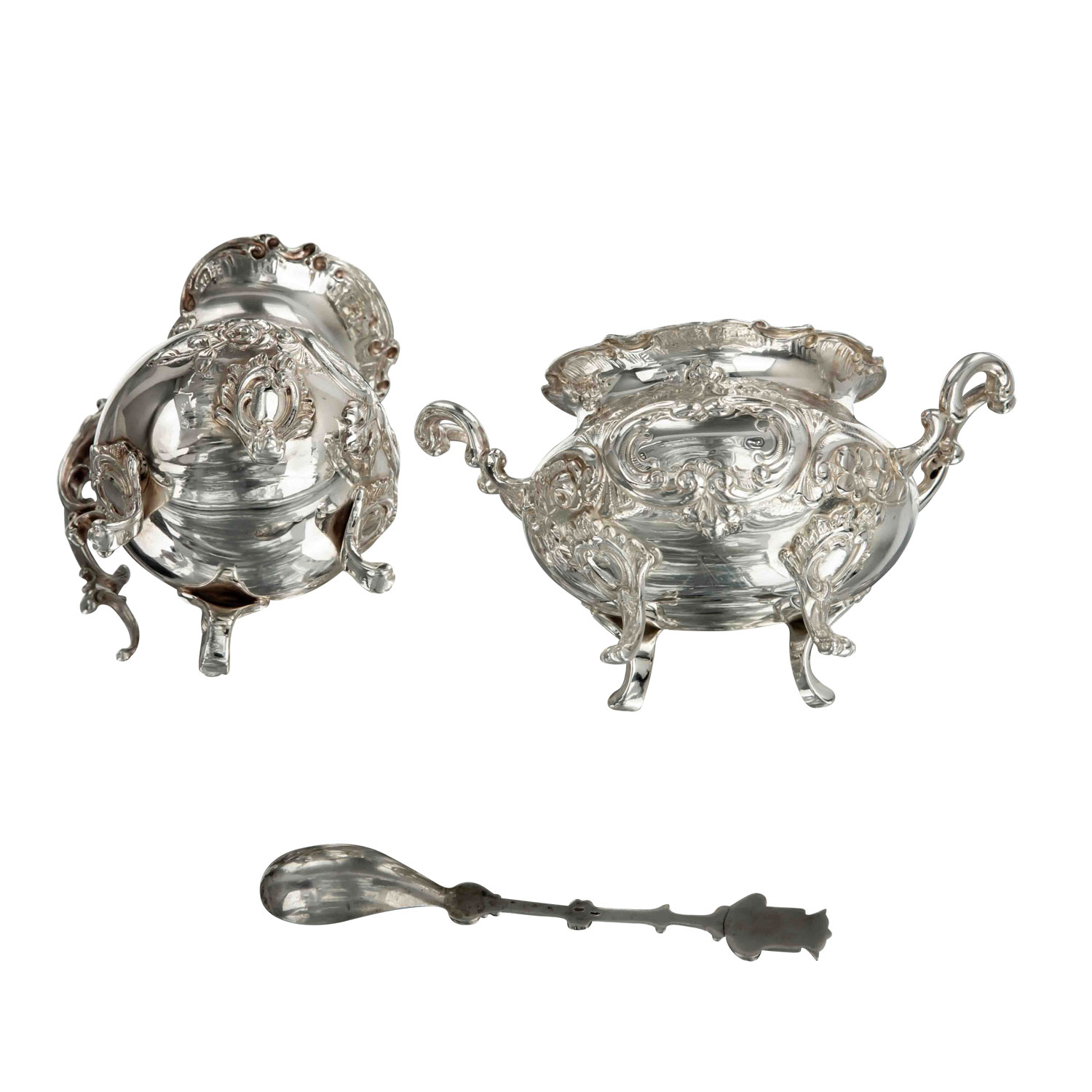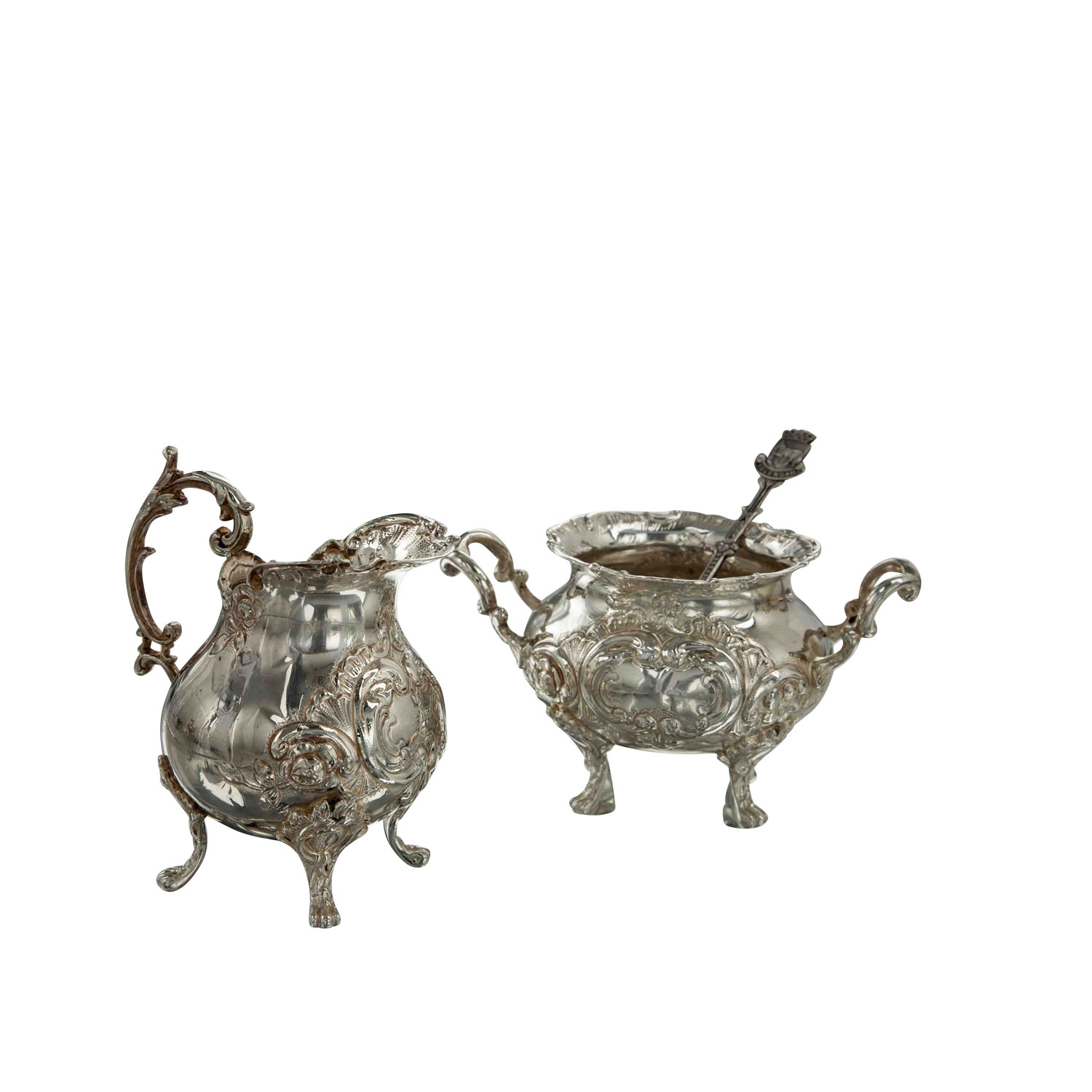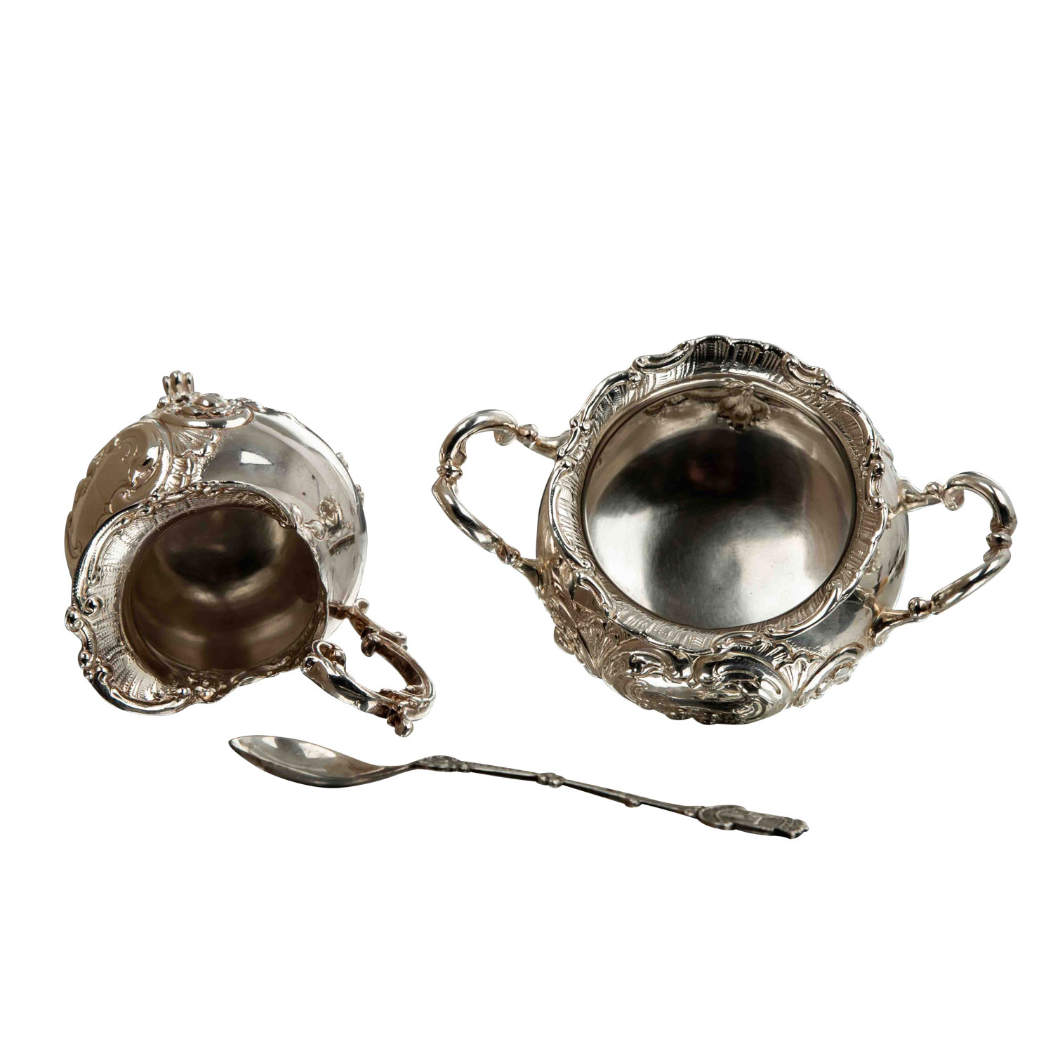 auf vier Tatzenfüßen, bauchige Wandung mit reichem Rocaillen- und Blumendekor, verspielte Handhabe mit Rocaillen, Sahnekännchen, H: ca. 9 cm, Zuckerschale, H: ca. 6 cm, Tablett ebenfalls mit reichen Rocaillen- und Blumendekor, LxB: ca. 24,5 cm, Marken: 800 Silber, MZ, Gw. ca. 285 g. Alters- und Gebrauchsspuren. Tlw. Kratzspuren. ZUSATZ: Zuckerlöffel, 835 Silber.