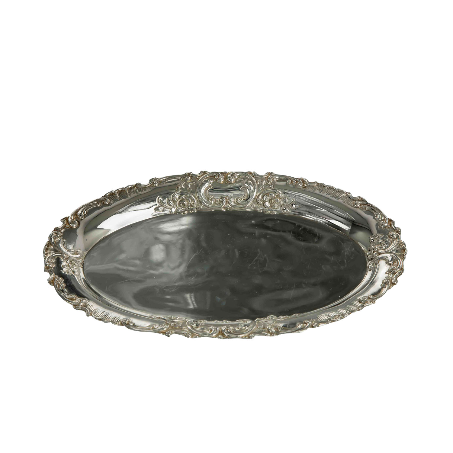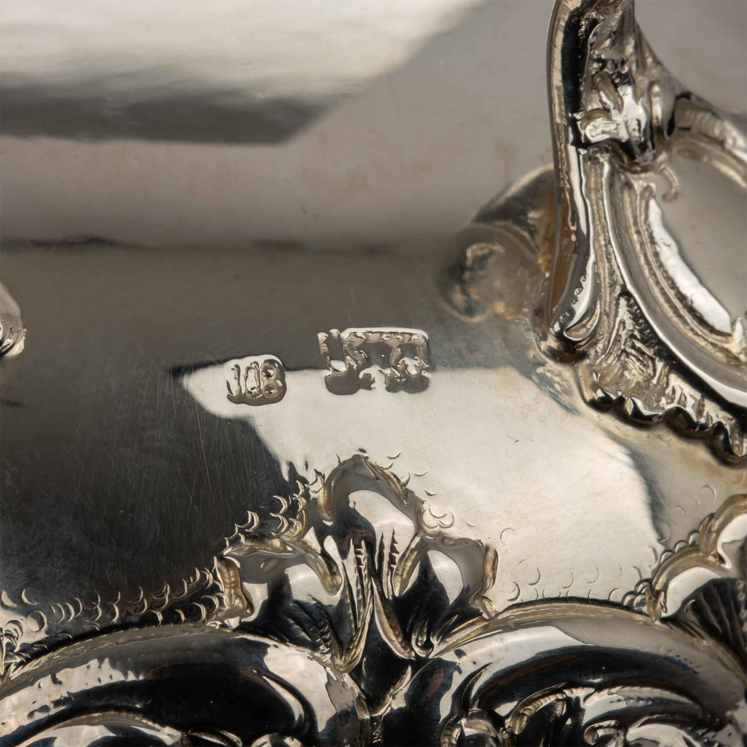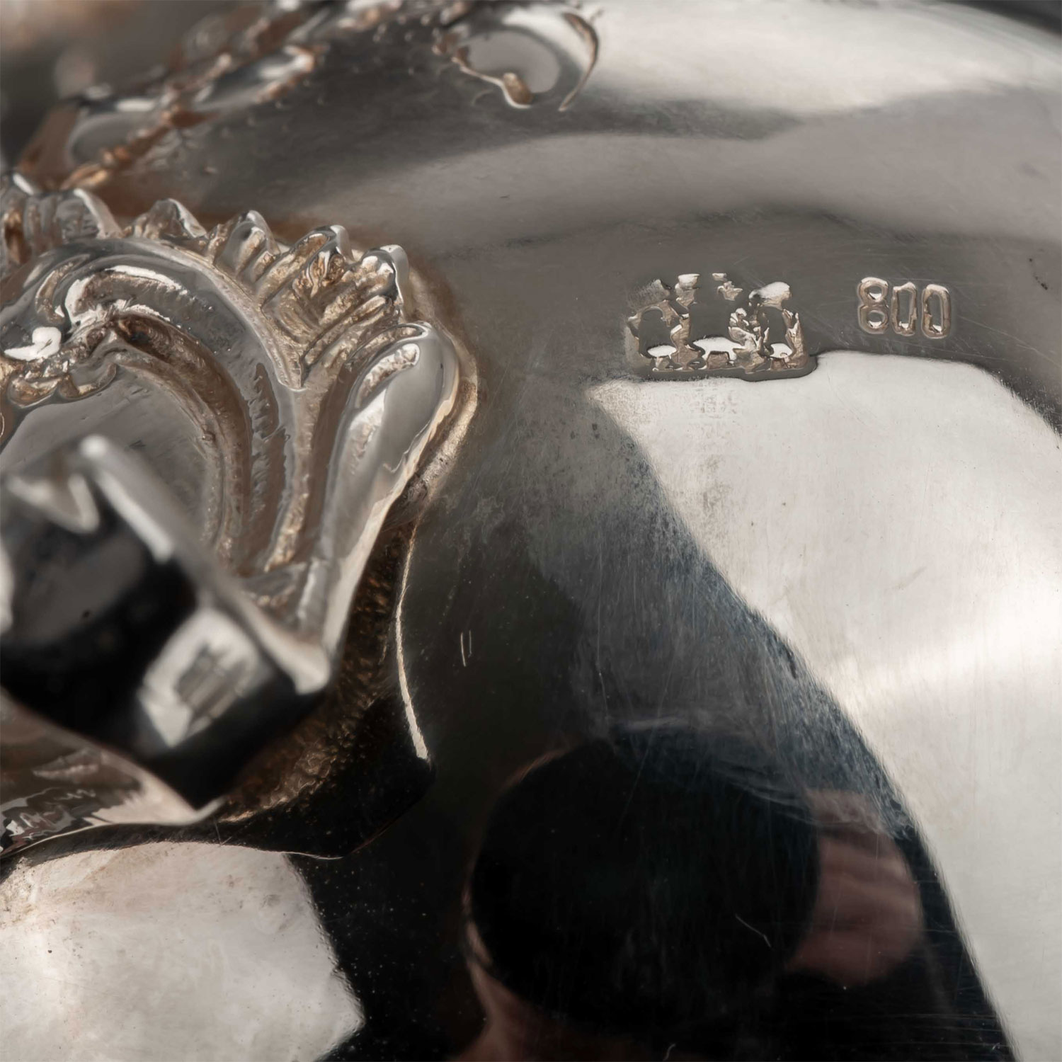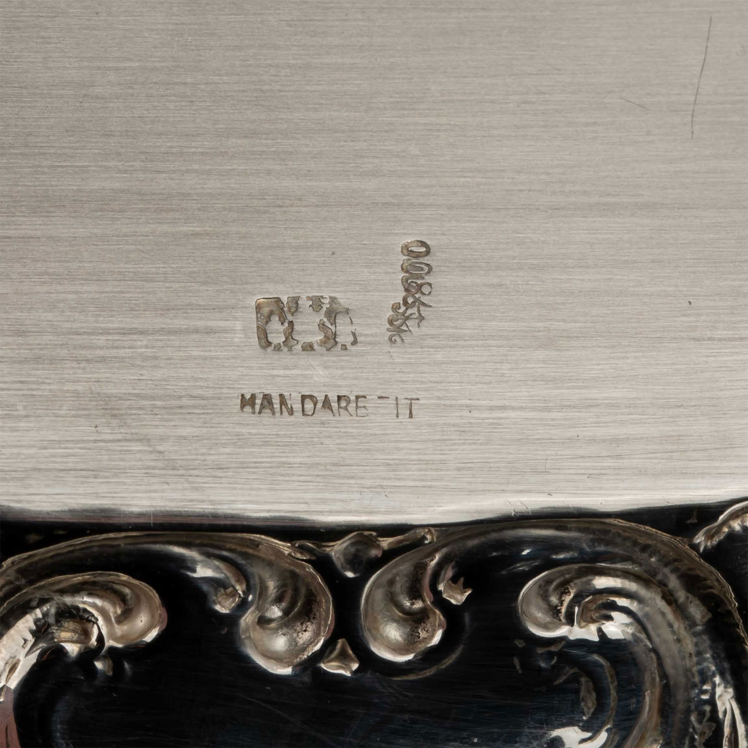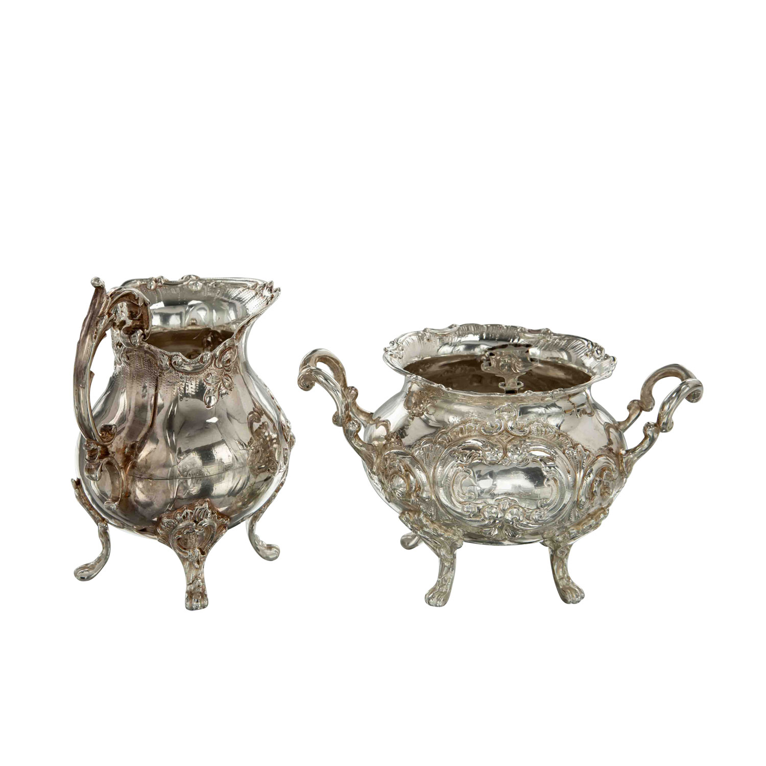 auf vier Tatzenfüßen, bauchige Wandung mit reichem Rocaillen- und Blumendekor, verspielte Handhabe mit Rocaillen, Sahnekännchen, H: ca. 9 cm, Zuckerschale, H: ca. 6 cm, Tablett ebenfalls mit reichen Rocaillen- und Blumendekor, LxB: ca. 24,5 cm, Marken: 800 Silber, MZ, Gw. ca. 285 g. Alters- und Gebrauchsspuren. Tlw. Kratzspuren. ZUSATZ: Zuckerlöffel, 835 Silber.