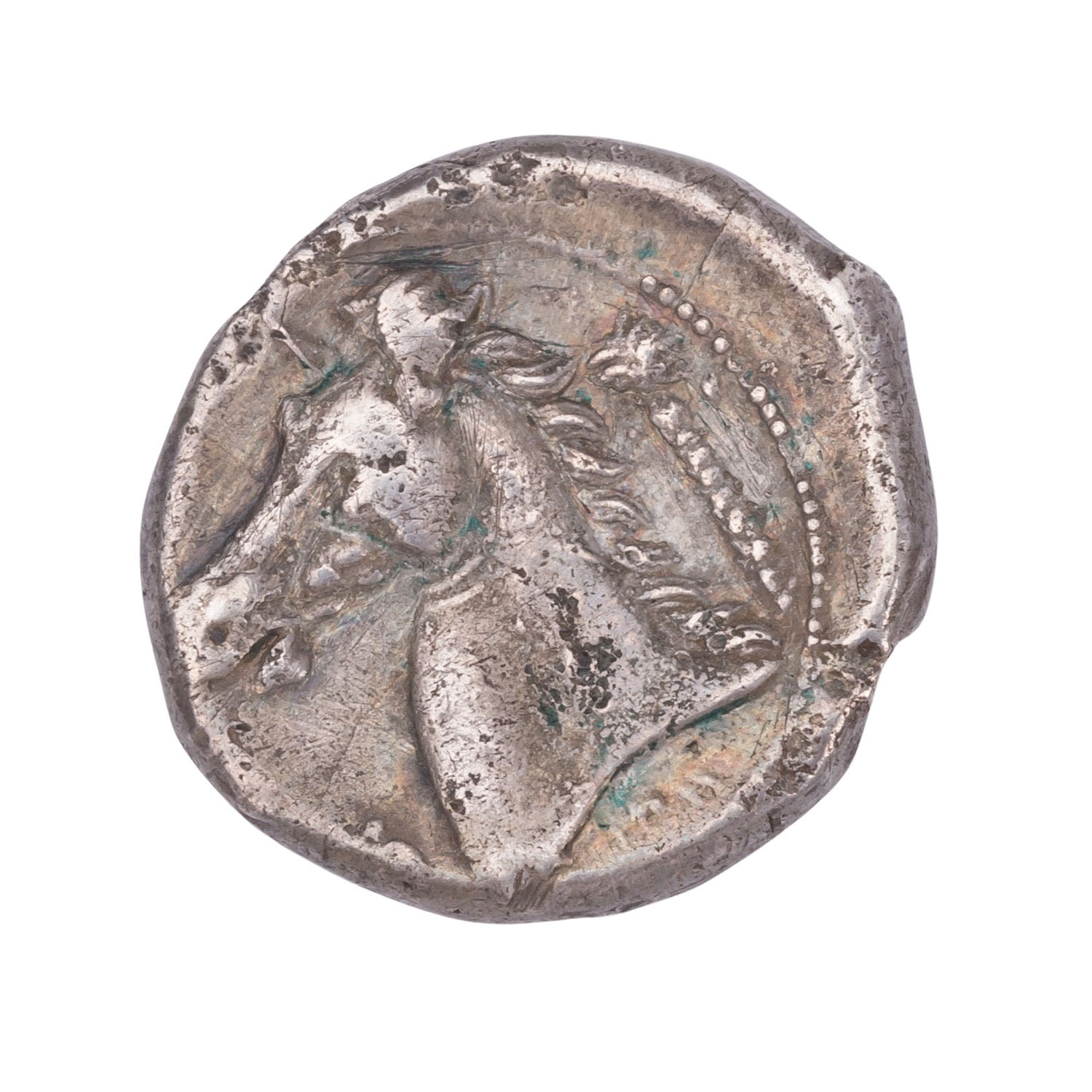 Av: Herakleskopf mit Löwenskalp n.r. , Rv: Pferdeprotome n.l., Palme, ss, starke Kratzer, Grünspan, Tönung, berieben, deutliche Bearbeitungsspuren am Rand, 15,6g Ag rau.