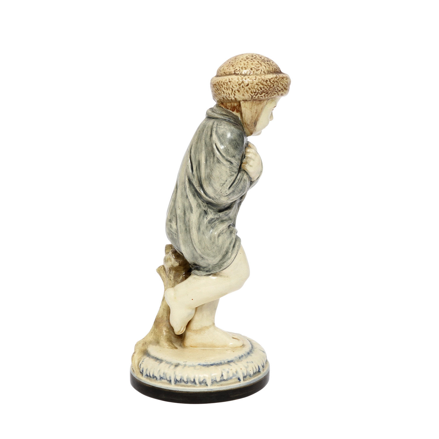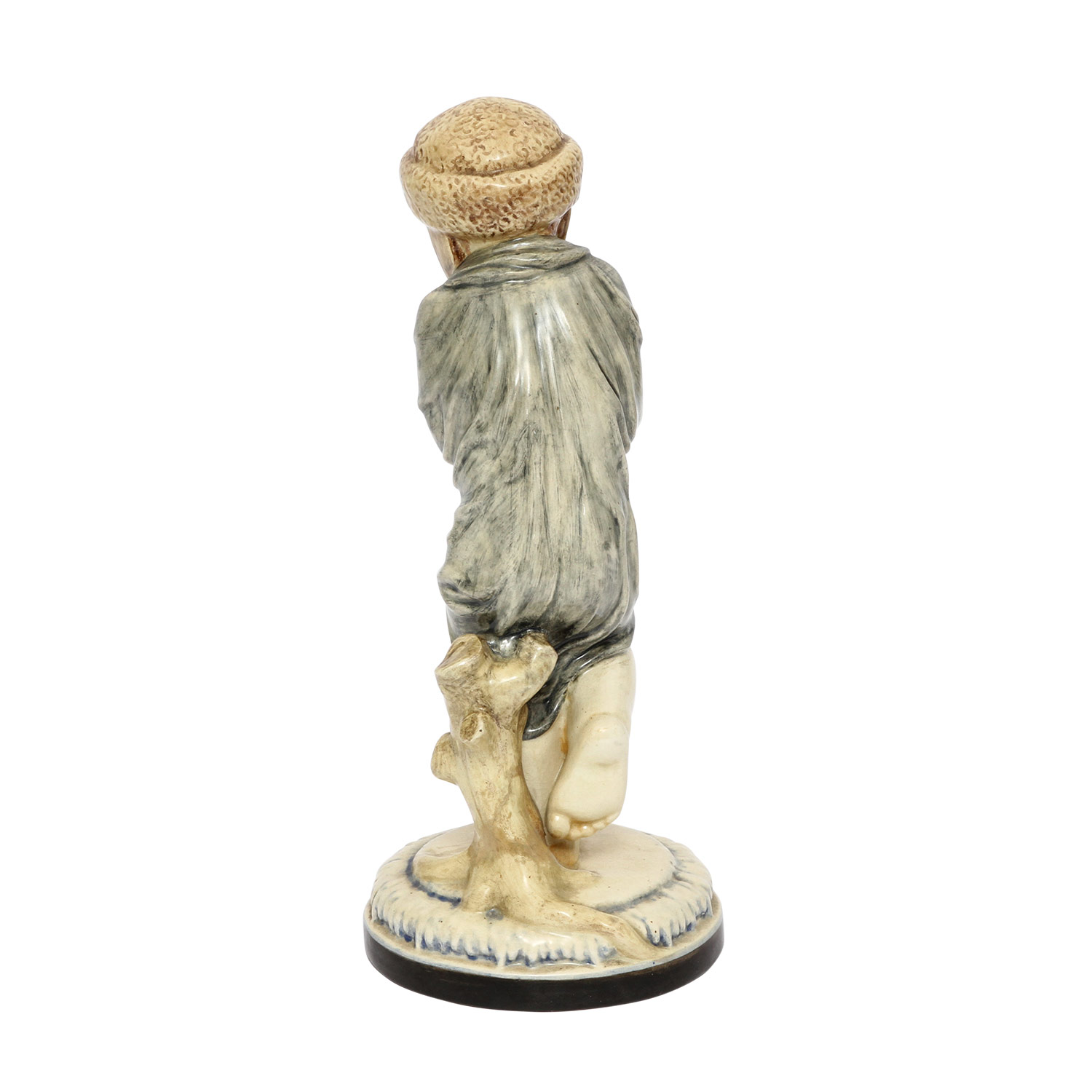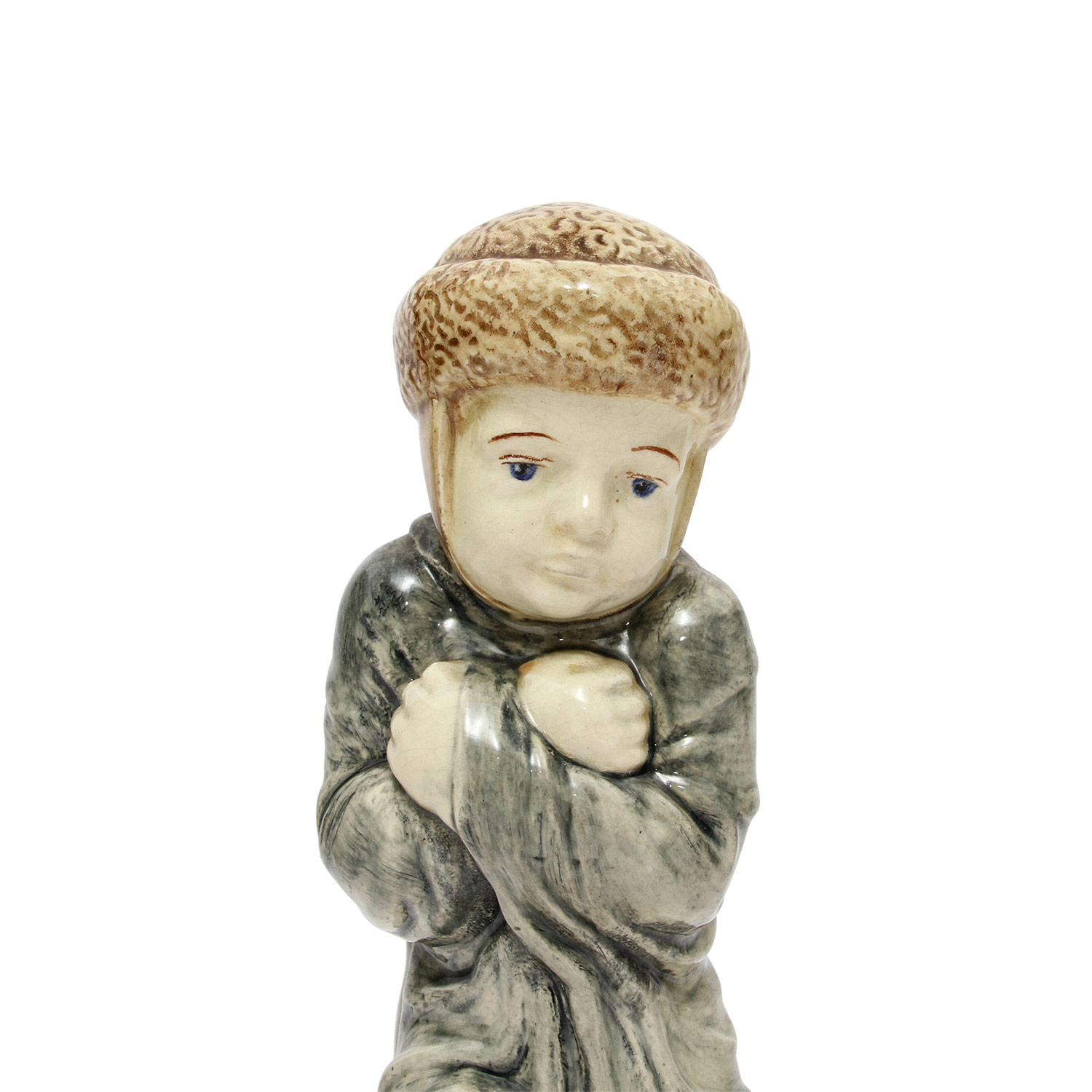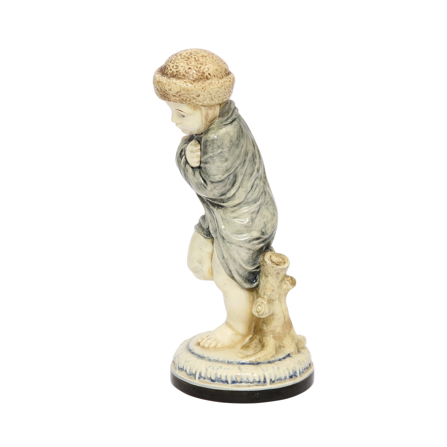 Keramikfigur "Allegorie des Winters", 20. Jh. Auf schneebedecktem Rundsockel barfuß stehende Knabenfigur mit Mütze, sich fröstelnd einen Mantel umlegend, Craquelé-Glasur, leicht schraffierte, naturalistische Farbigkeit, us. schwarze Stempelmarke mit Schwan und unleserl. Buchstaben "KK"?, restauriert, best., Altersspuren, H 29,5 cm.