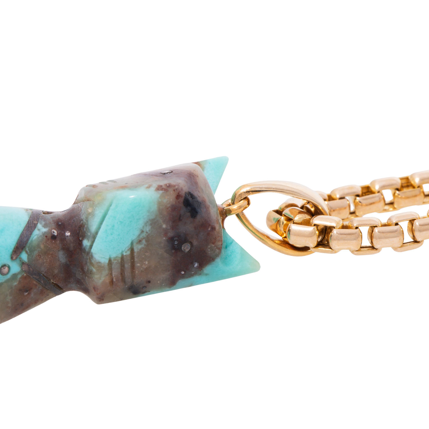 geschnitten, Augen und Halsband aus silbernen Einlagen, Anhängerschlaufe aus GG, L: 5,5 cm, 22,4 g, L: 45 cm, 2. H. 20. Jh., leichte Tragespuren.