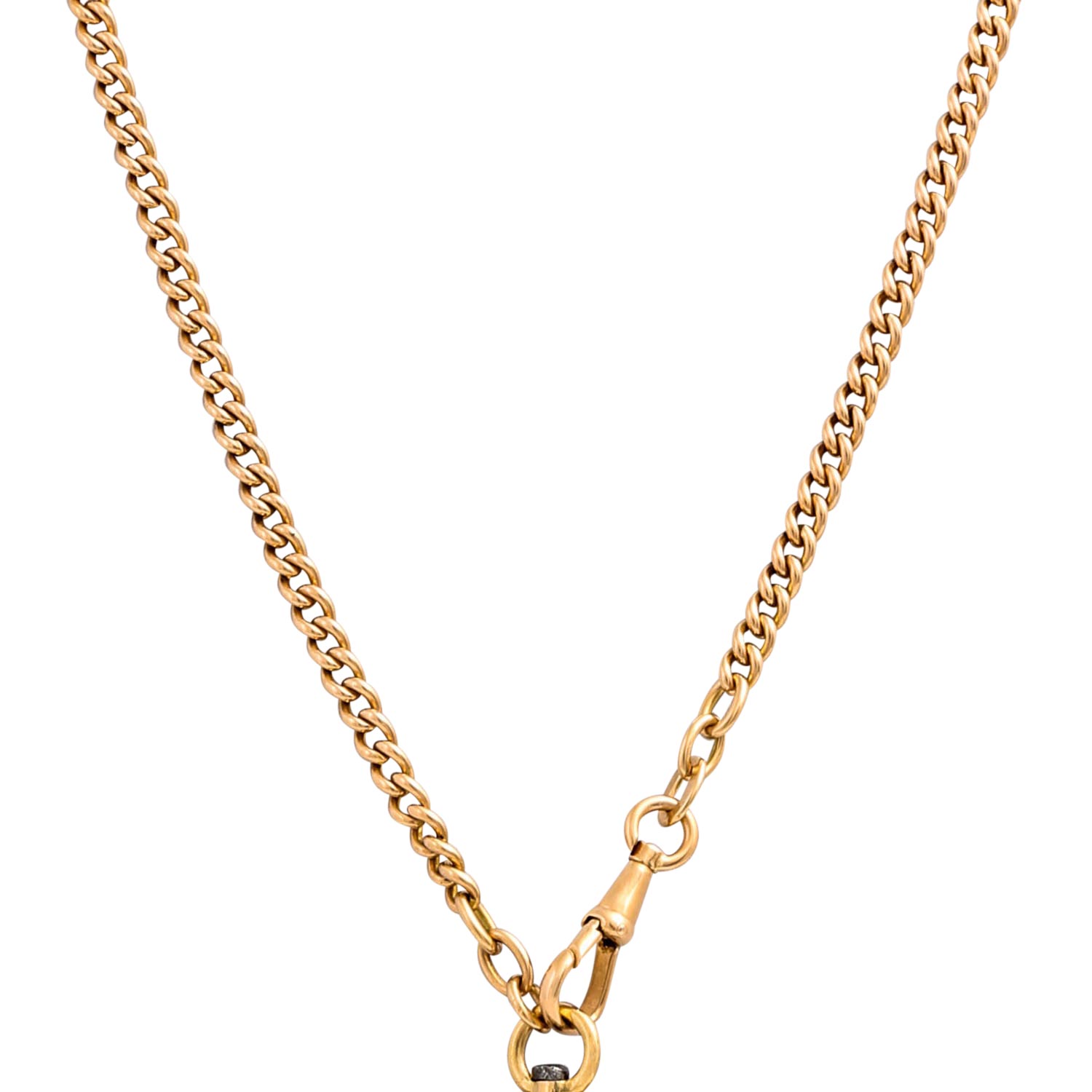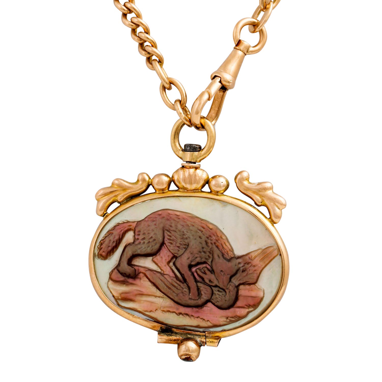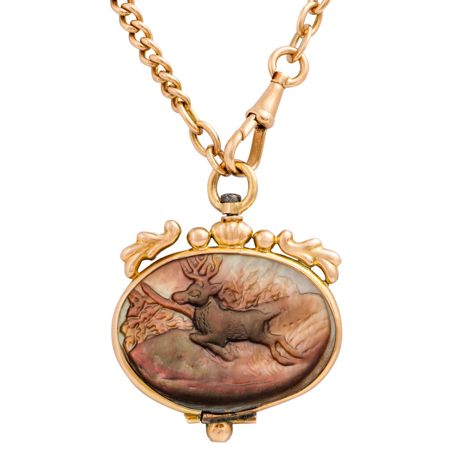 Kette und Anhänger aus Perlmutt mit geschnitzter Jagdszene, gefasst in RG 14K, 23,6 gr, Kettenlänge ca. 44 cm, 1. Hälfte 20. Jh., leichte Tragespuren.