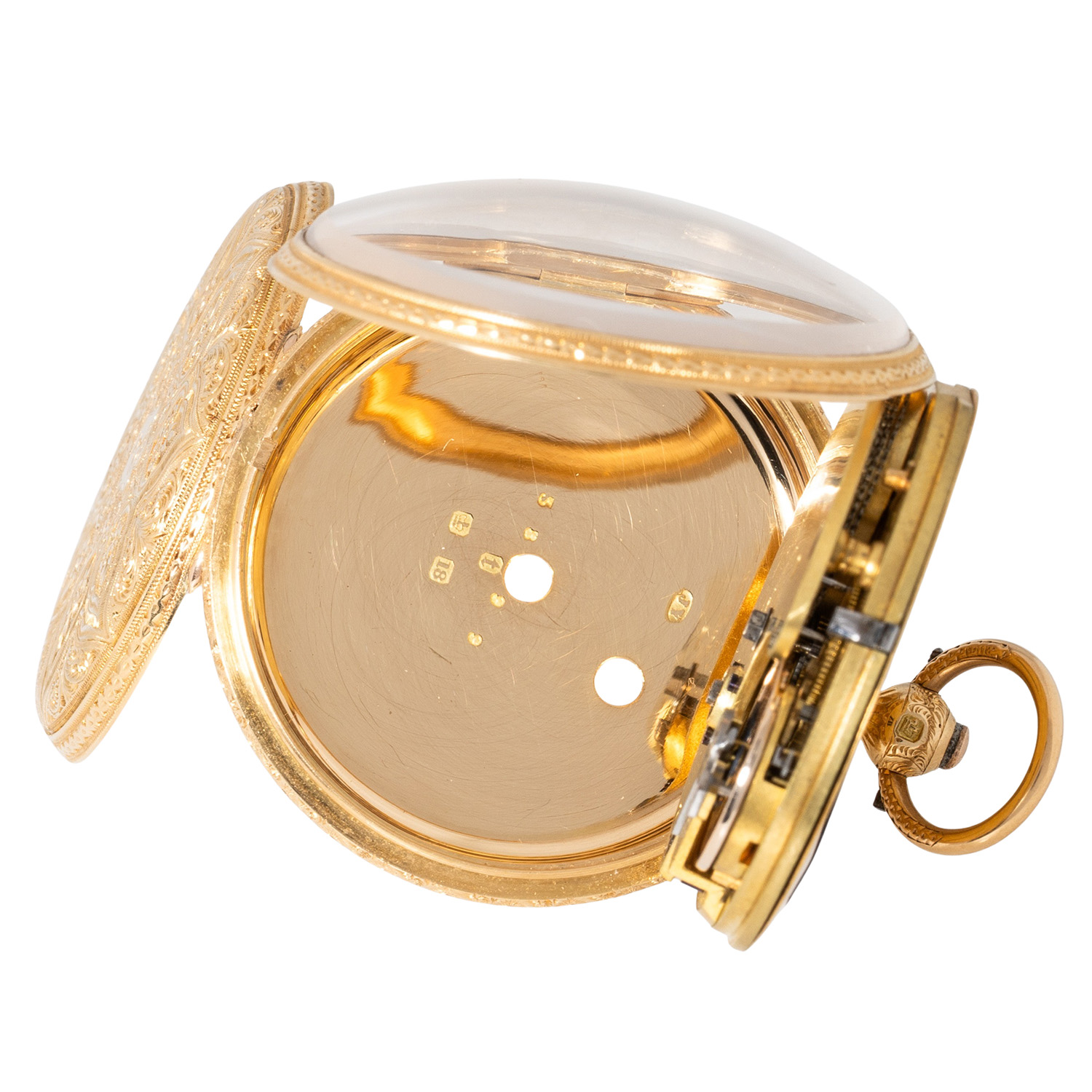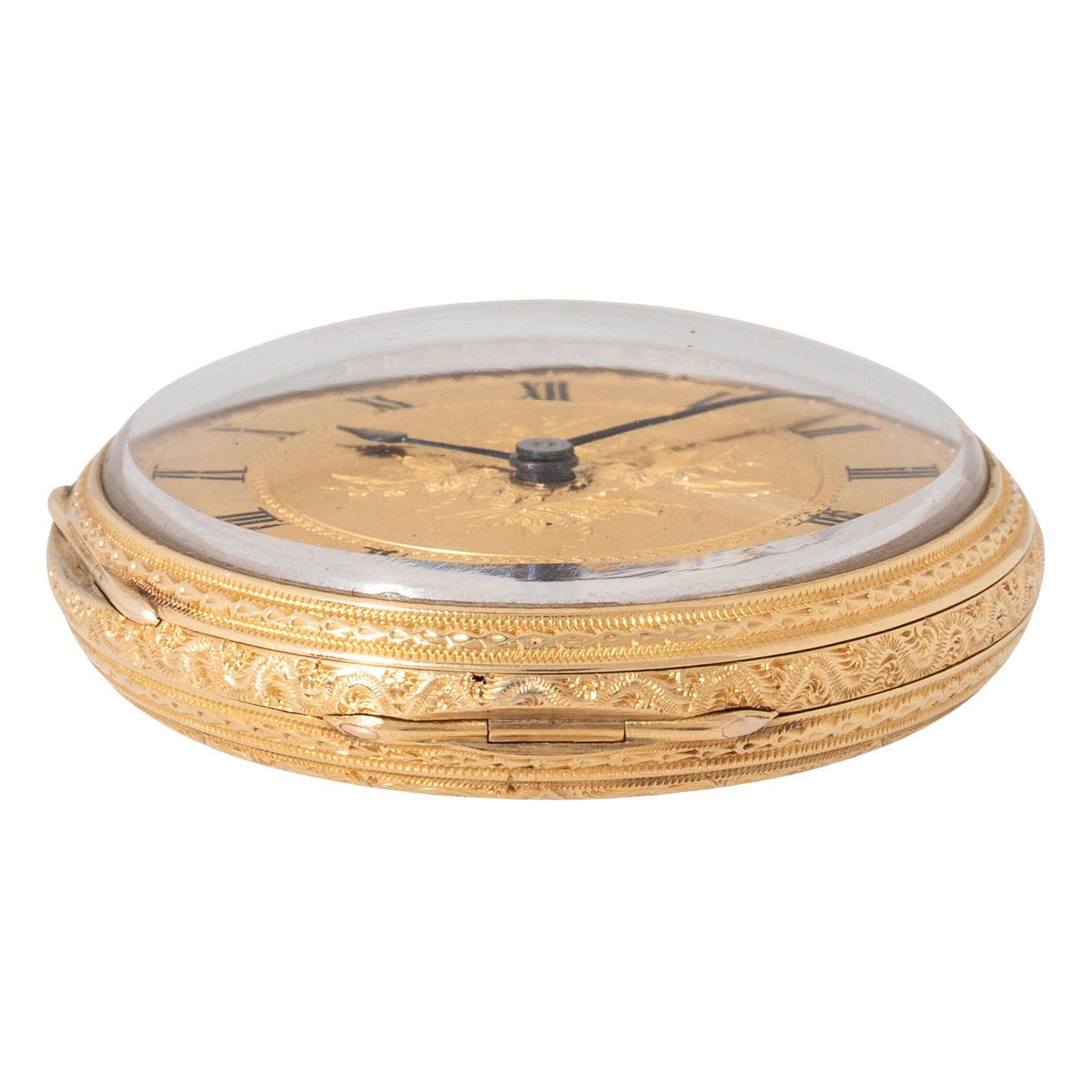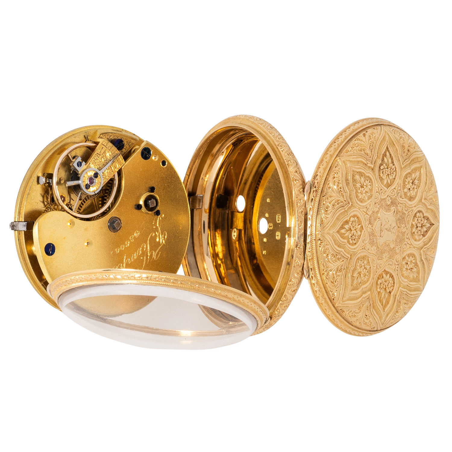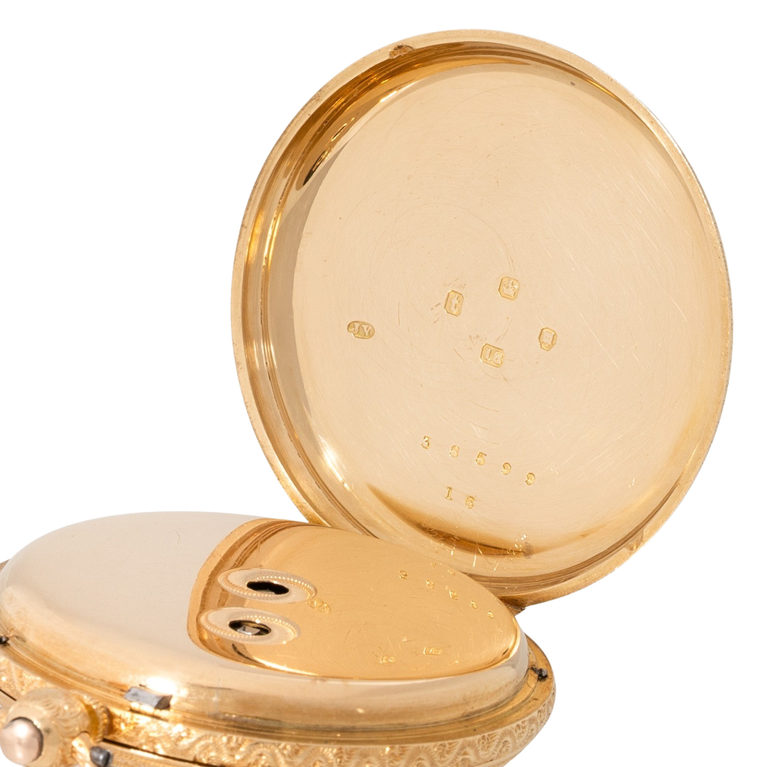 Dekorativ verziertes 18K Gelbgold-Gehäuse, Gehäusenummer 3899. Mechanisches Werk mit Schlüsselaufzug (Schlüssel nicht anbei) in funktionsfähigem Zustand, handgravierter Unruhkloben und Feinregulierung. Floral graviertes 18K Gelbgold-Zifferblatt mit römischen Zahlen und Poire-Zeigern. Guter Zustand, leichte Gebrauchsspuren. Durchmesser ca. 40 mm gemessen ohne Krone.