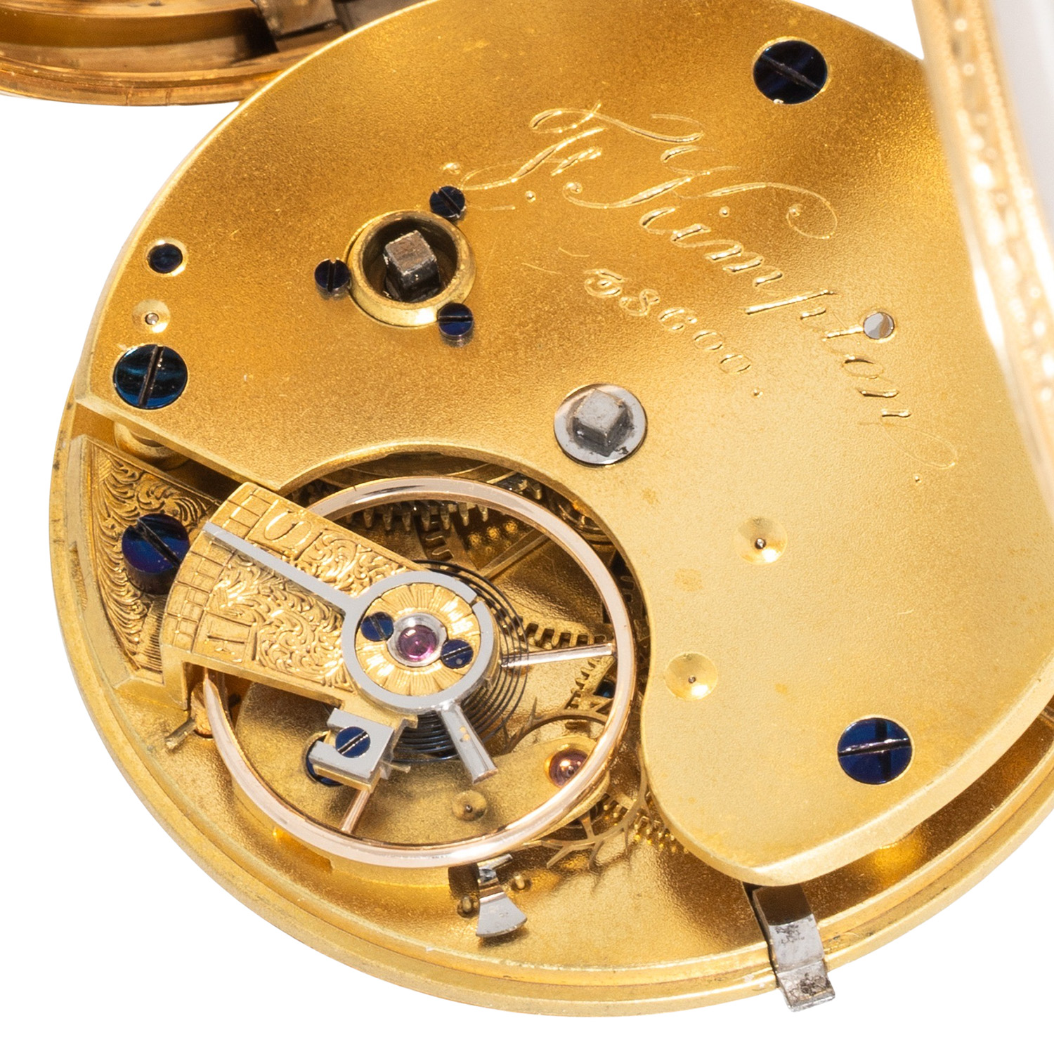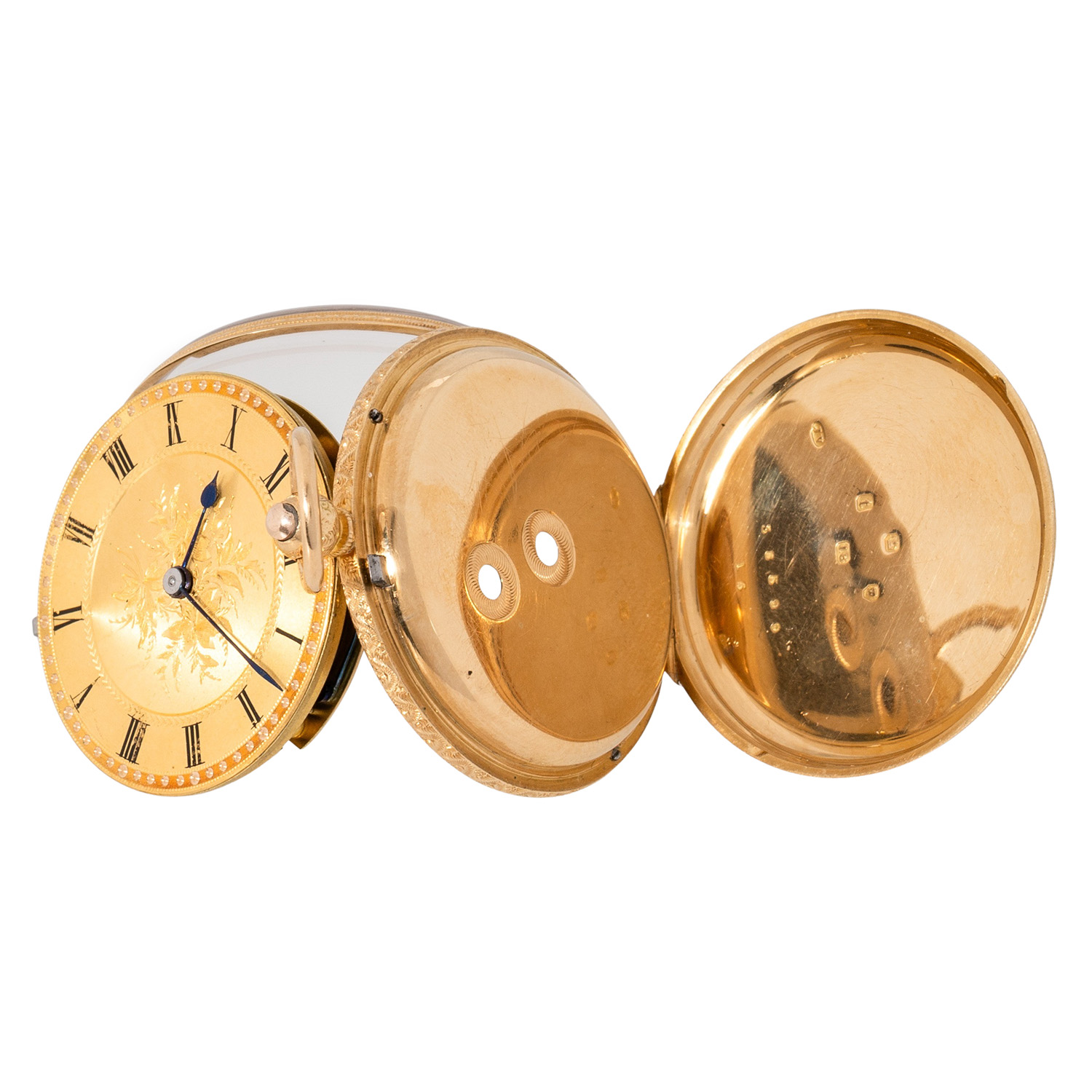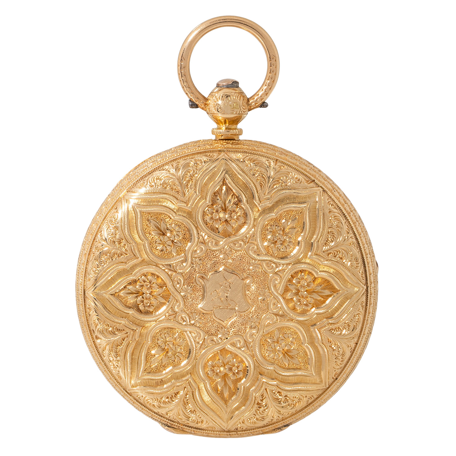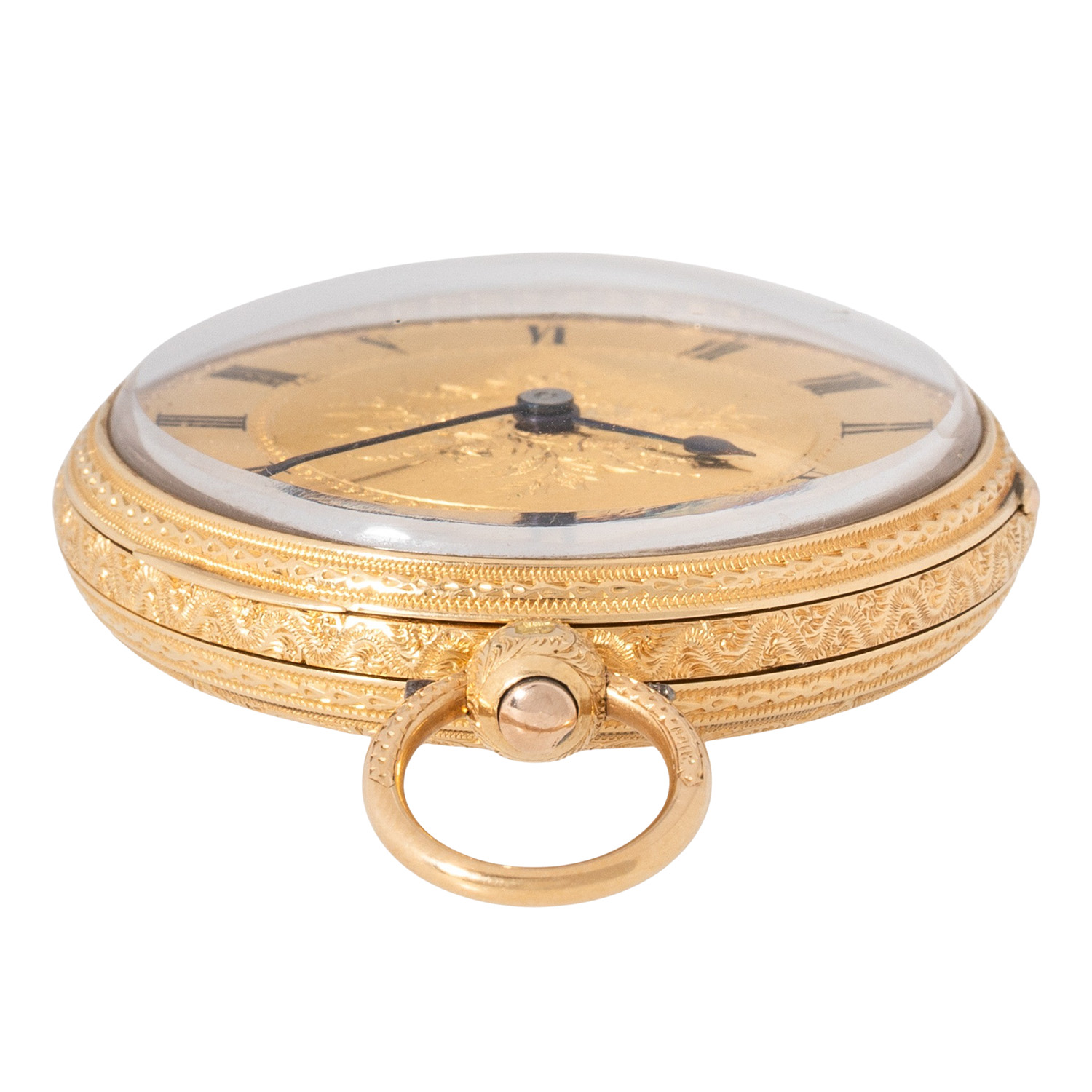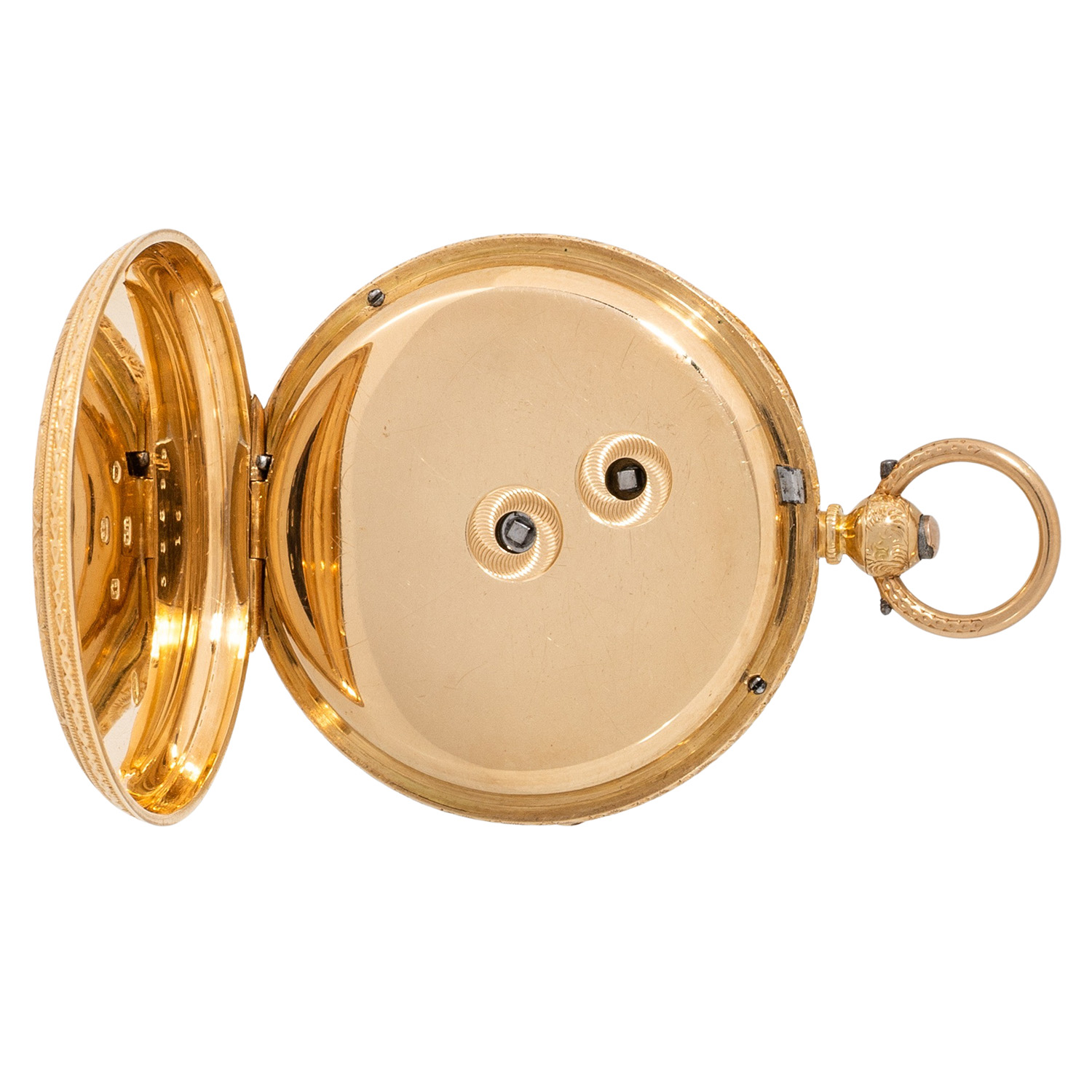 Dekorativ verziertes 18K Gelbgold-Gehäuse, Gehäusenummer 3899. Mechanisches Werk mit Schlüsselaufzug (Schlüssel nicht anbei) in funktionsfähigem Zustand, handgravierter Unruhkloben und Feinregulierung. Floral graviertes 18K Gelbgold-Zifferblatt mit römischen Zahlen und Poire-Zeigern. Guter Zustand, leichte Gebrauchsspuren. Durchmesser ca. 40 mm gemessen ohne Krone.