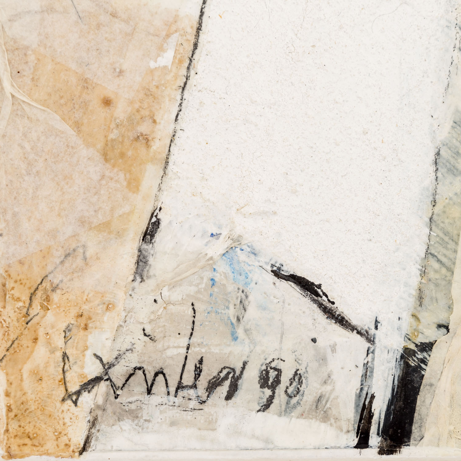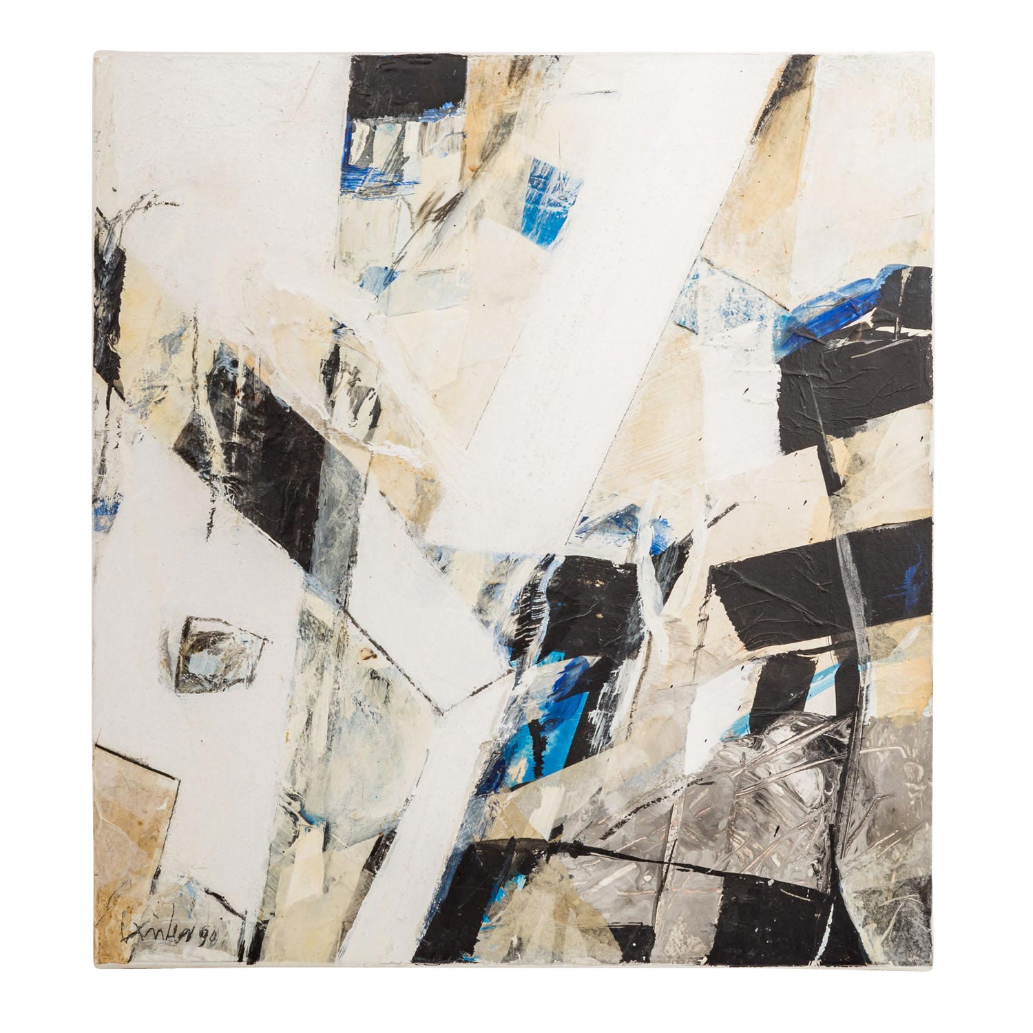 KINTER, KLAUS (b. 1937), "Abstract composition", signed and dated (19) 90, mixed media collage / paper on wood, HxW: approx. 56x51 cm. Slight signs of age.