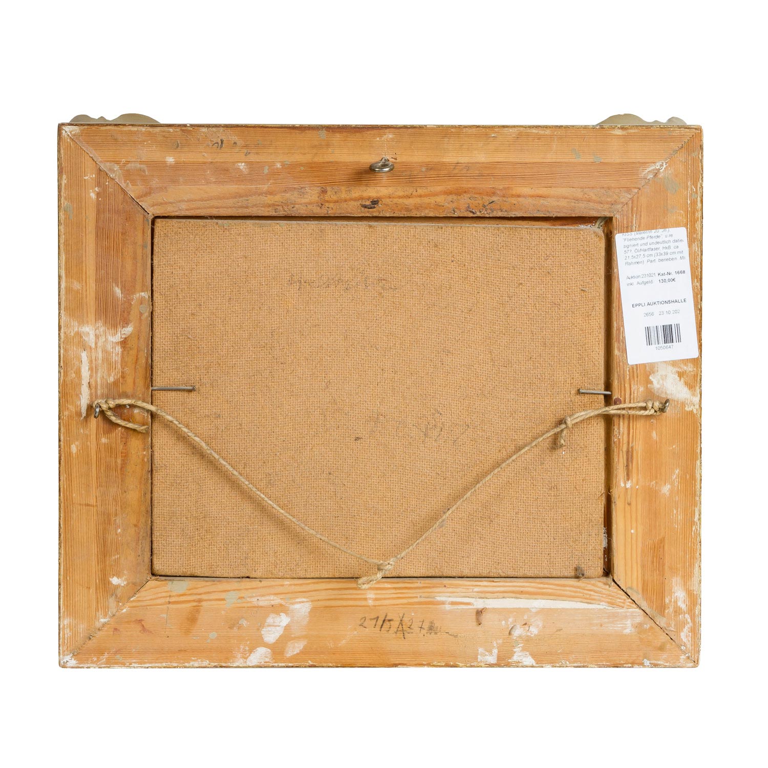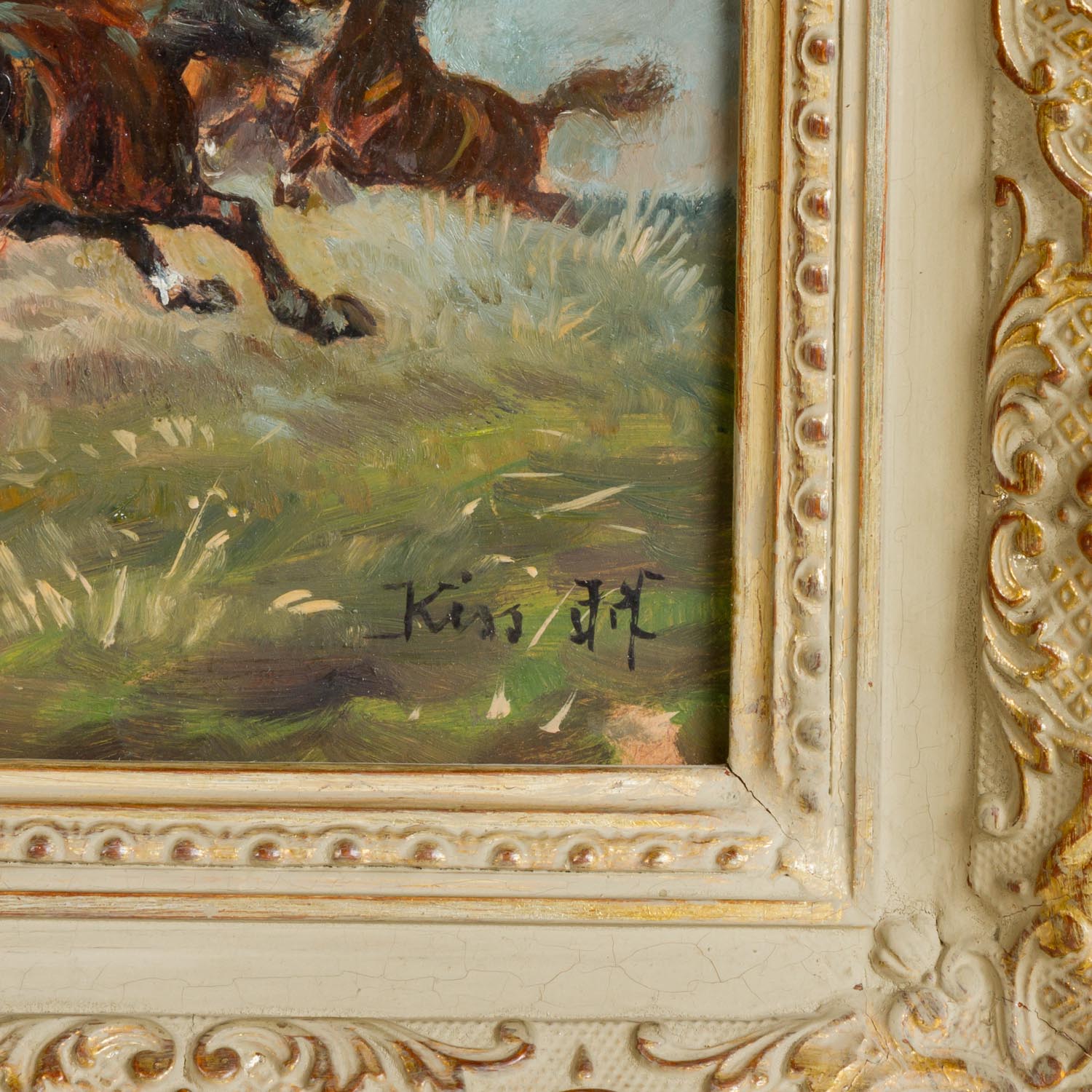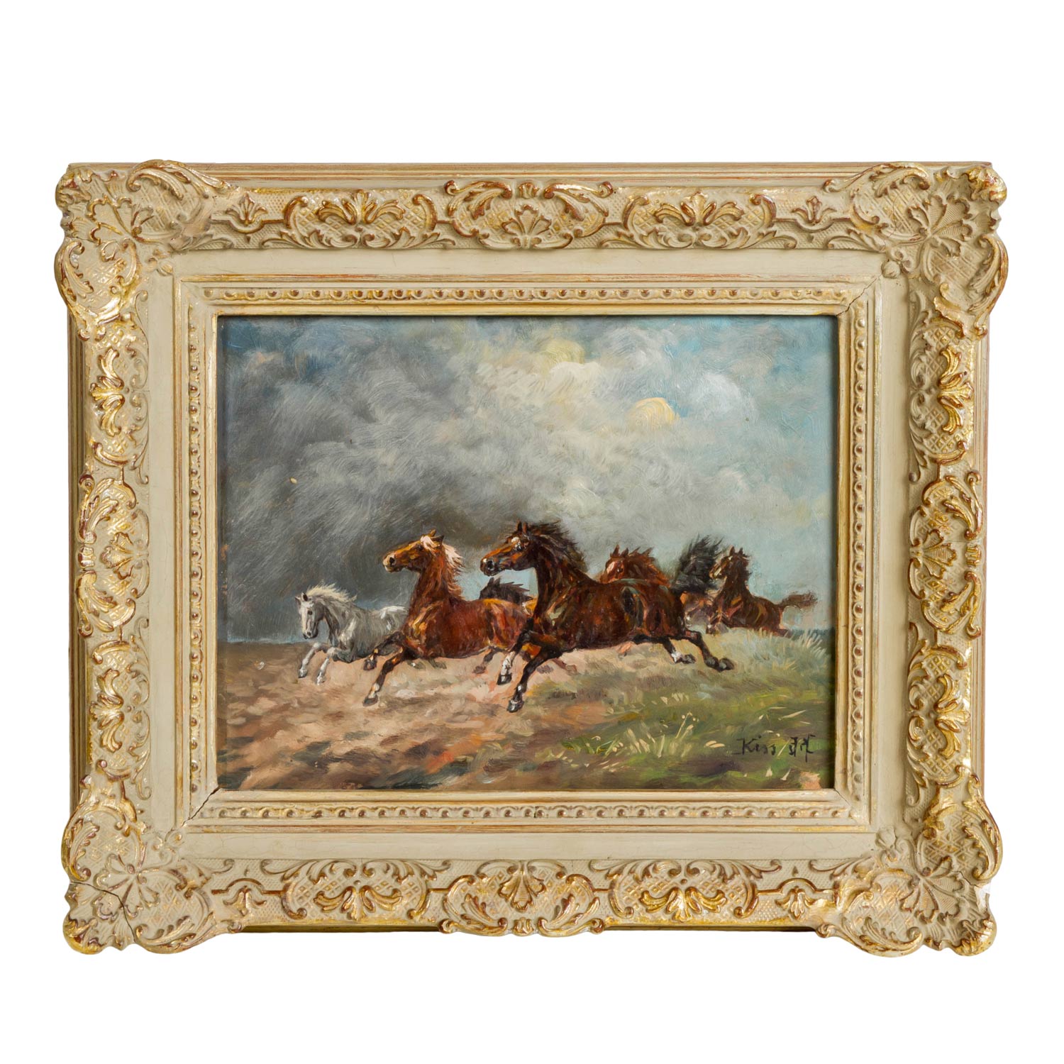 | KISS (painter 20th century), 'Fleeing Horses', below right signed and indistinctly dated 57 ?, oil / hard fiber, HxW: approx. 21.5x27.5 cm (33x39 cm with frame). Part rubbed. With frame. Signs of age.