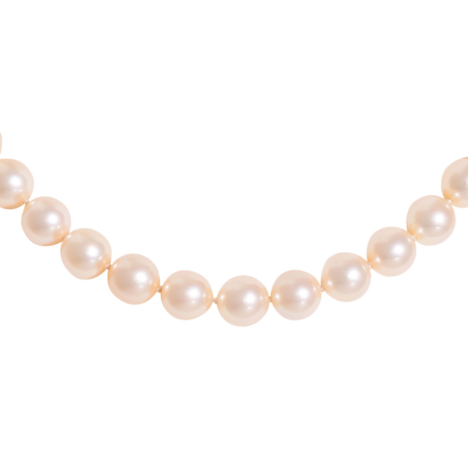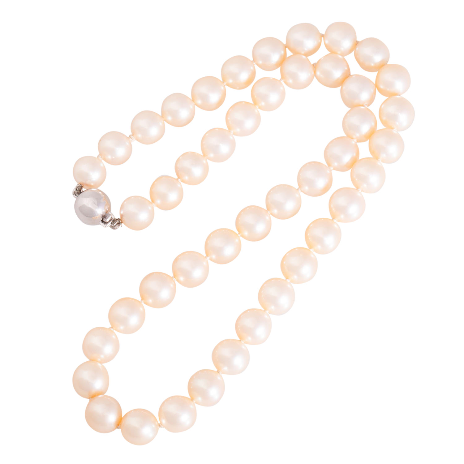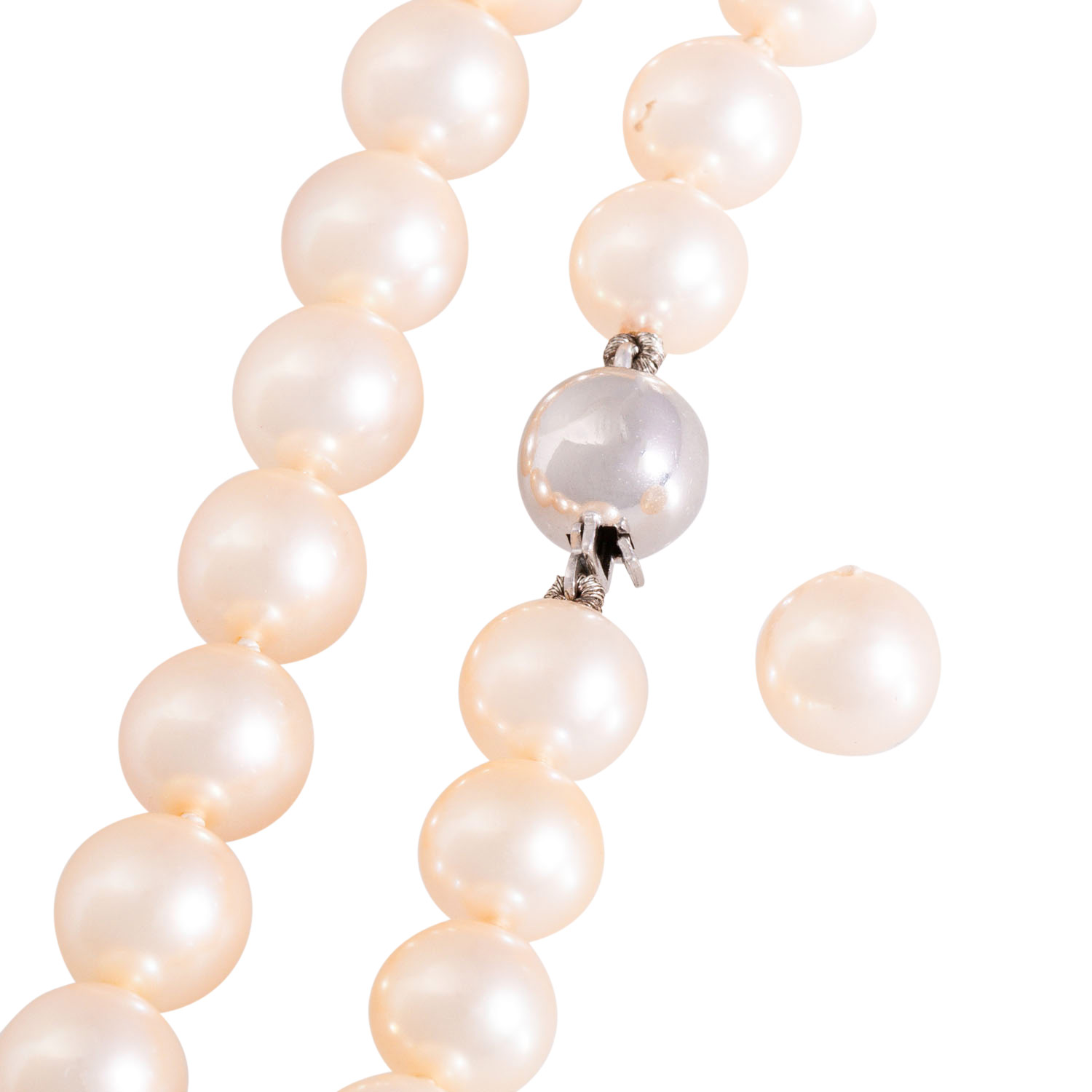 Zuchtperlen 7,5 mm mit schönem Lüster, L: 37,5 cm, anbei 1 lose Perle zur Verlängerung, Schließe aus WG 18K, Ende 20. Jh., guter Erhalt, mit Etui.