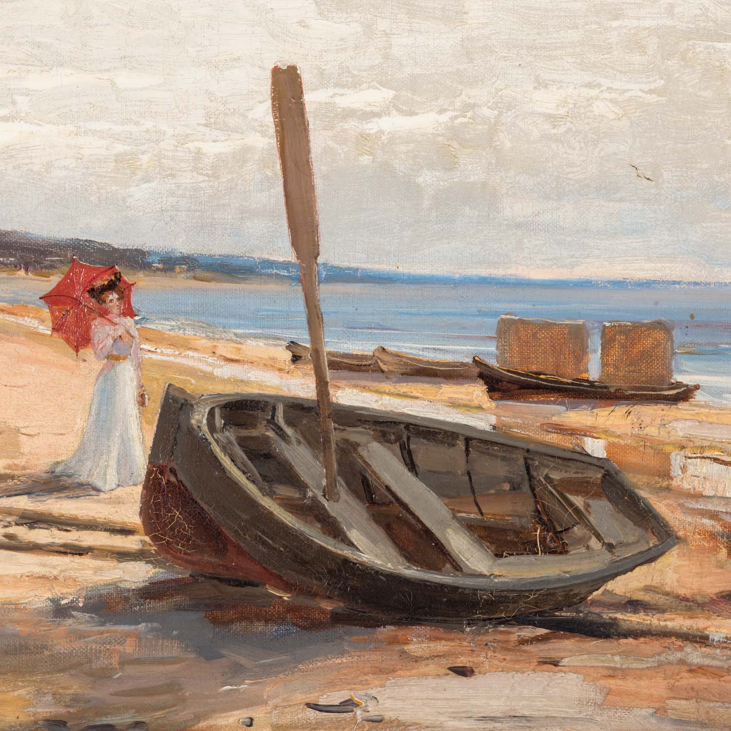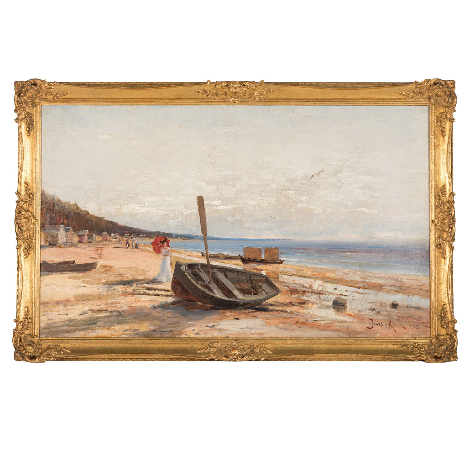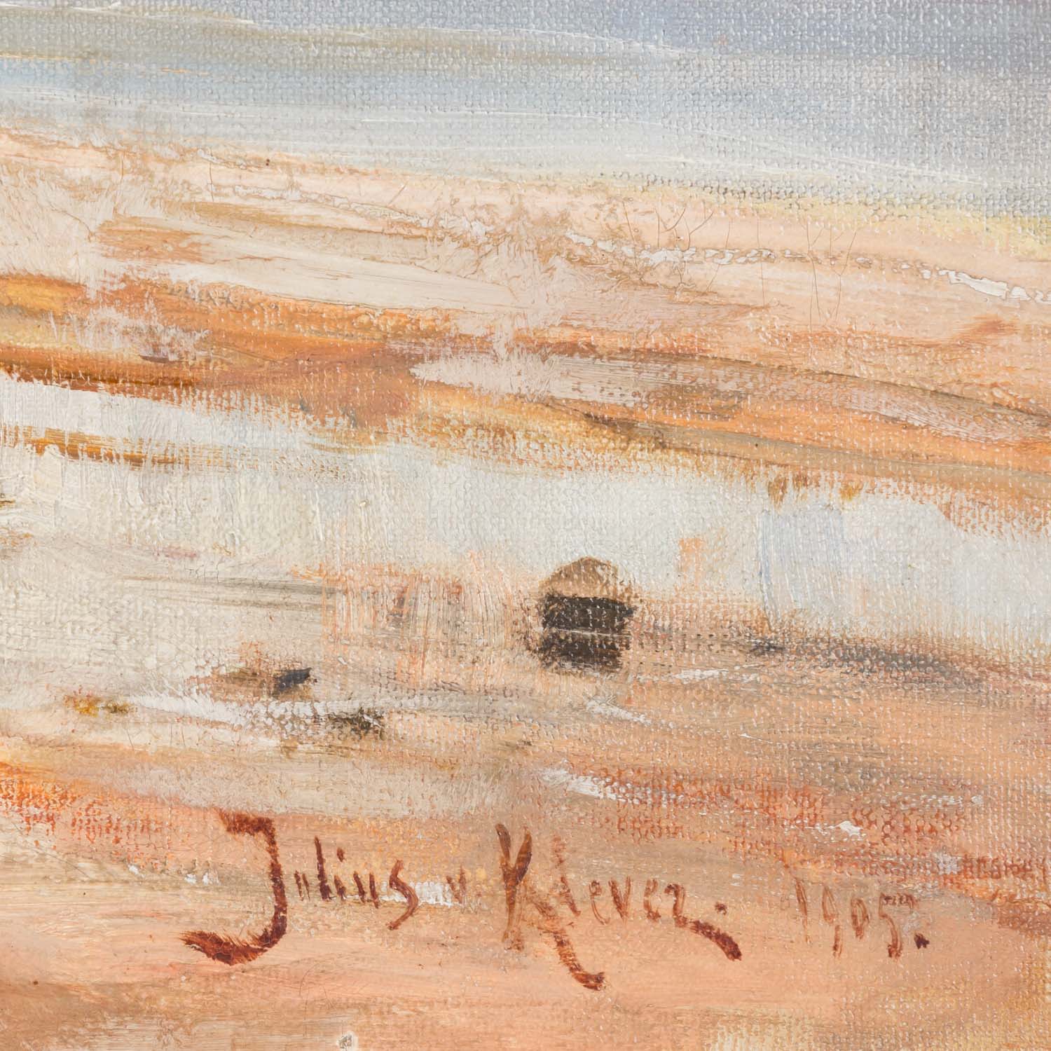 im Vordergrund eine flanierende Dame mit rotem Sonnenschirm, im Hintergrund Strandhäuschen vor Waldrain, u.re. signiert und datiert 'Julius v. Klever 1905', Öl/Leinwand, HxB: ca. 60x100 cm (70x110 cm mit Rahmen). Alters- und Beriebspuren, restauriert. Mit Rahmen. VERSO am Keilrahmen Stempel: L. A. Schröter & Co., Kunstmaterialien... Berlin.