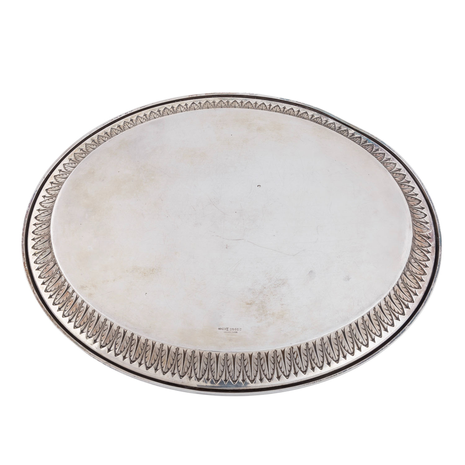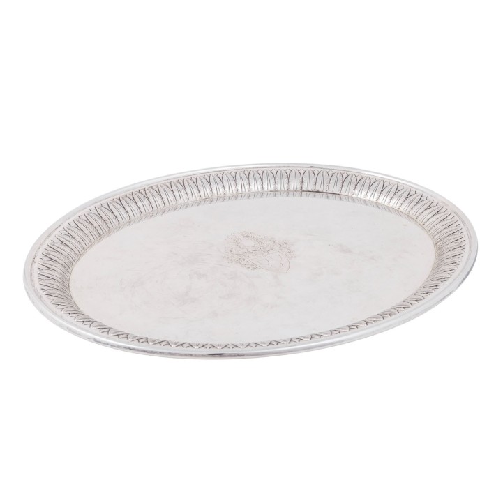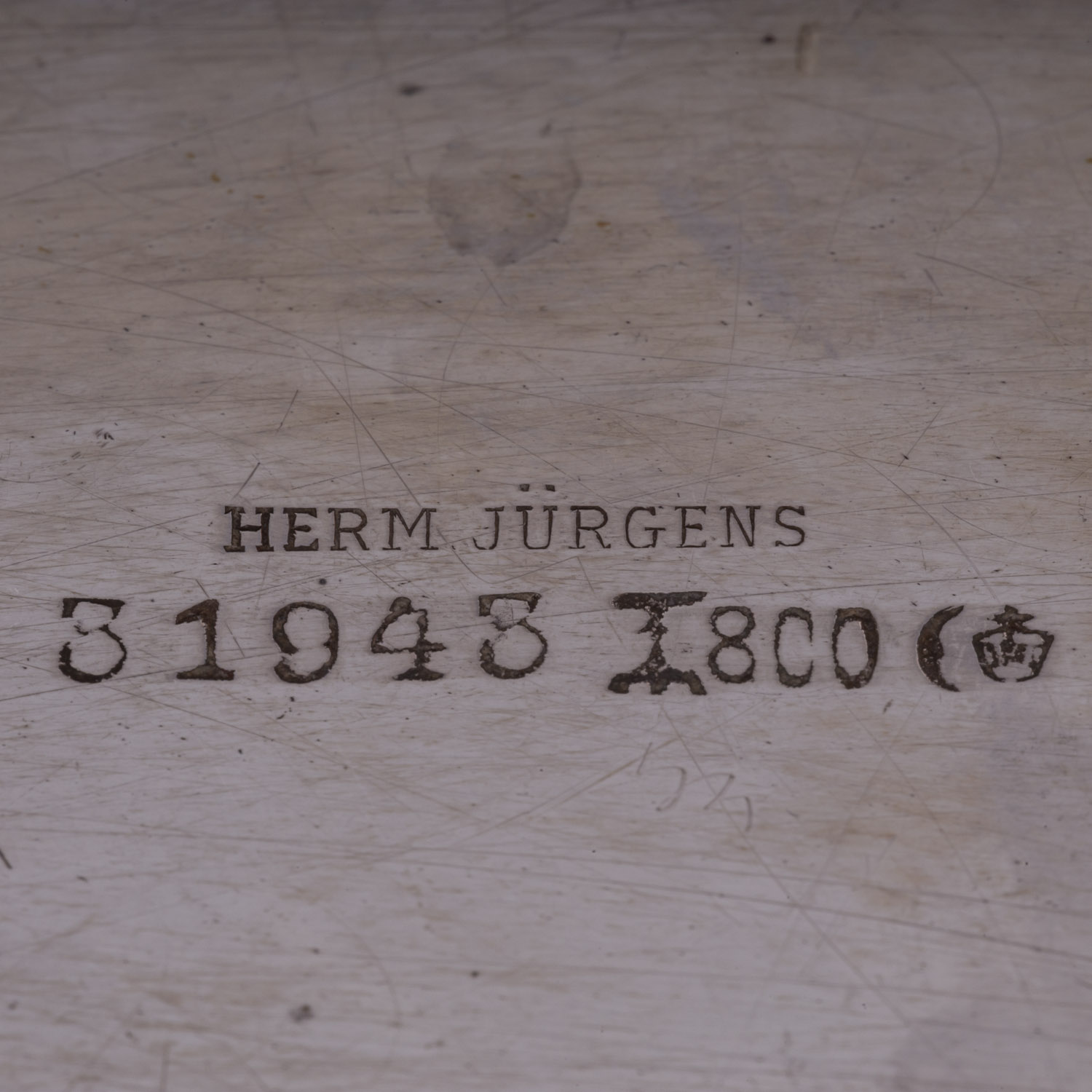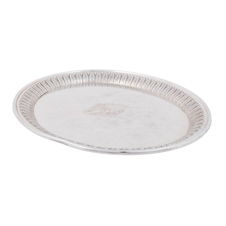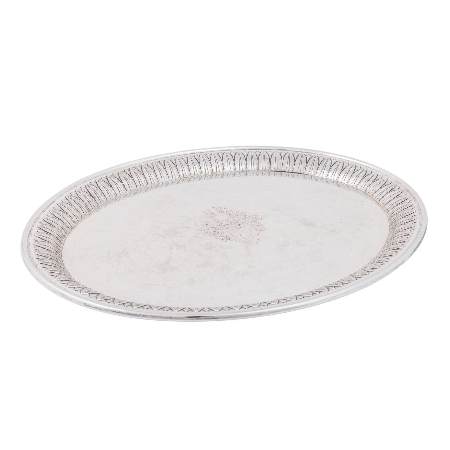 ovale Form, glatter Spiegel, in der Mitte ein graviertes Wappenschild, gewölbte Fahne mit einem reliefierten Palmettenfries, LxB: ca. 42x33,5 cm, Marken: Halbmond, Krone, 800, MZ, Vertriebsstempel 'Herm. Jürgens', Mod. Nr. 31943, Gw. ca.673 g. Alters- und Gebrauchsspuren. Tlw. Kratzspuren und gedellt.