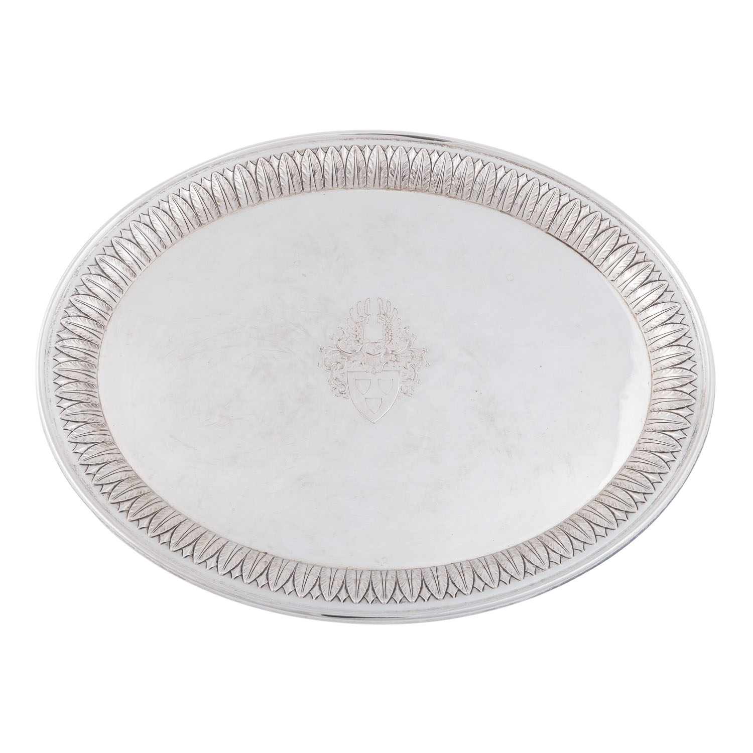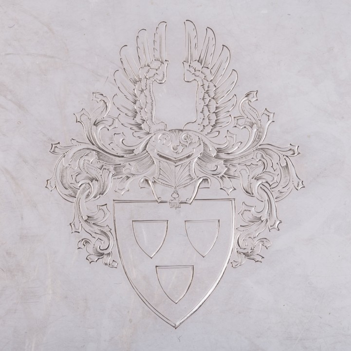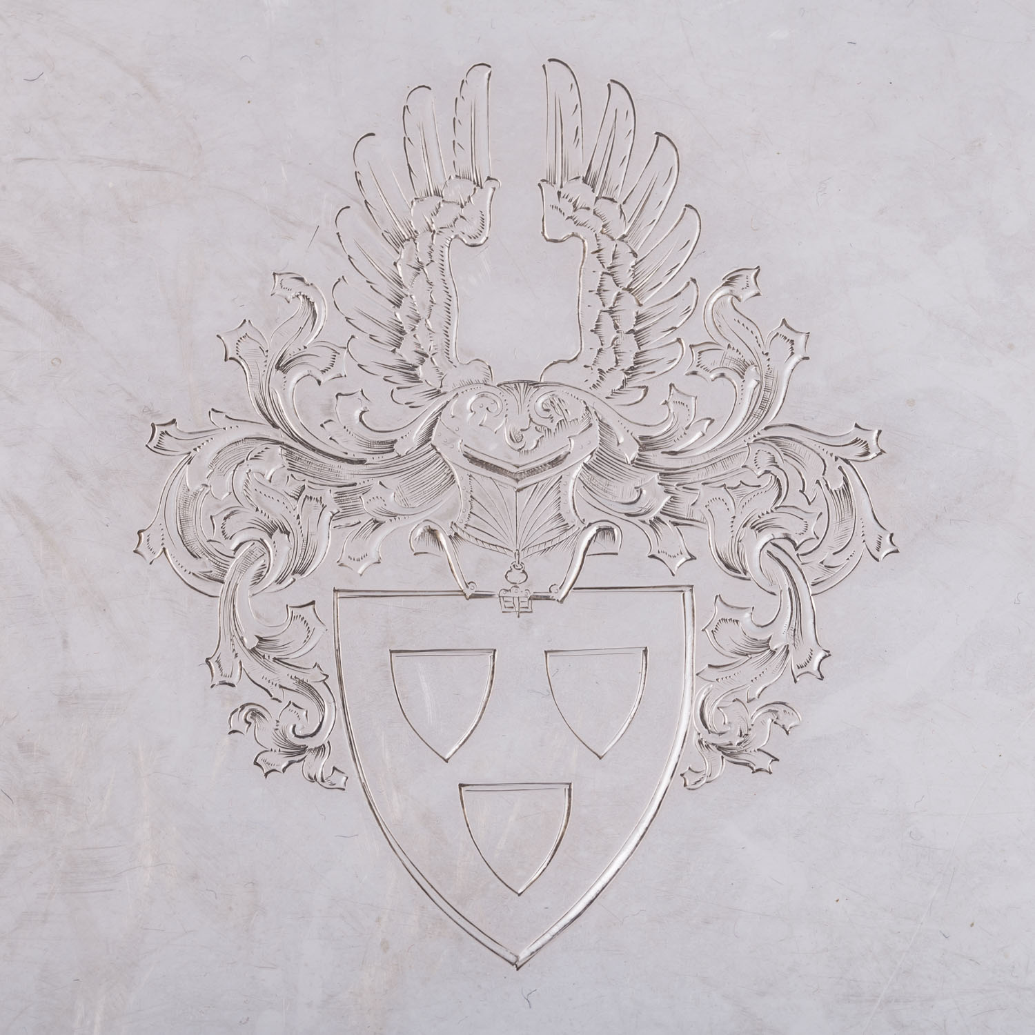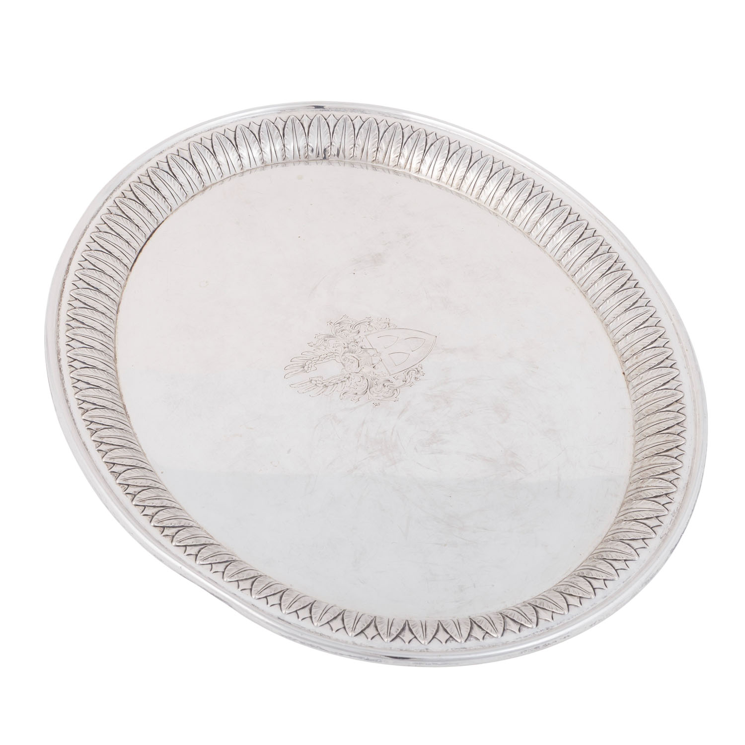 ovale Form, glatter Spiegel, in der Mitte ein graviertes Wappenschild, gewölbte Fahne mit einem reliefierten Palmettenfries, LxB: ca. 42x33,5 cm, Marken: Halbmond, Krone, 800, MZ, Vertriebsstempel 'Herm. Jürgens', Mod. Nr. 31943, Gw. ca.673 g. Alters- und Gebrauchsspuren. Tlw. Kratzspuren und gedellt.