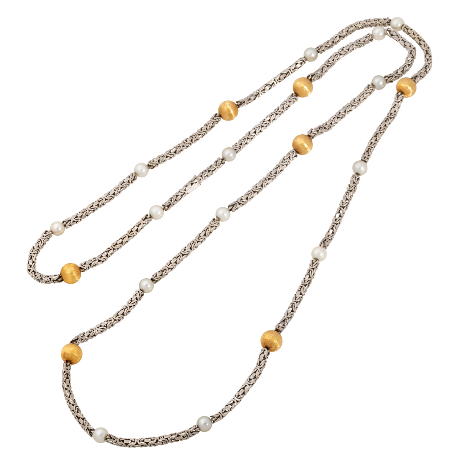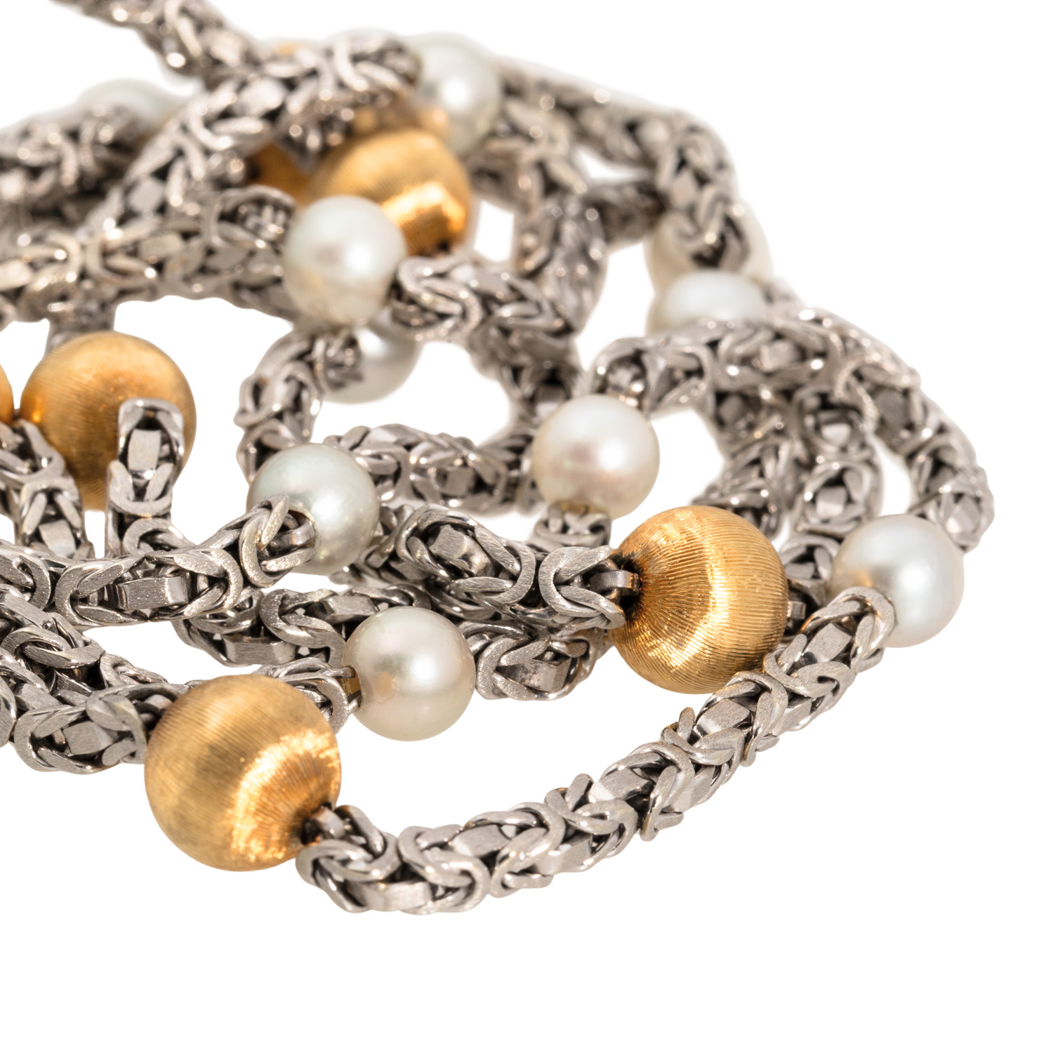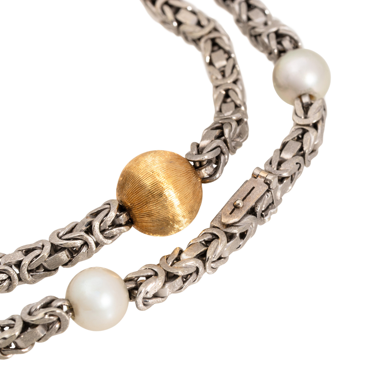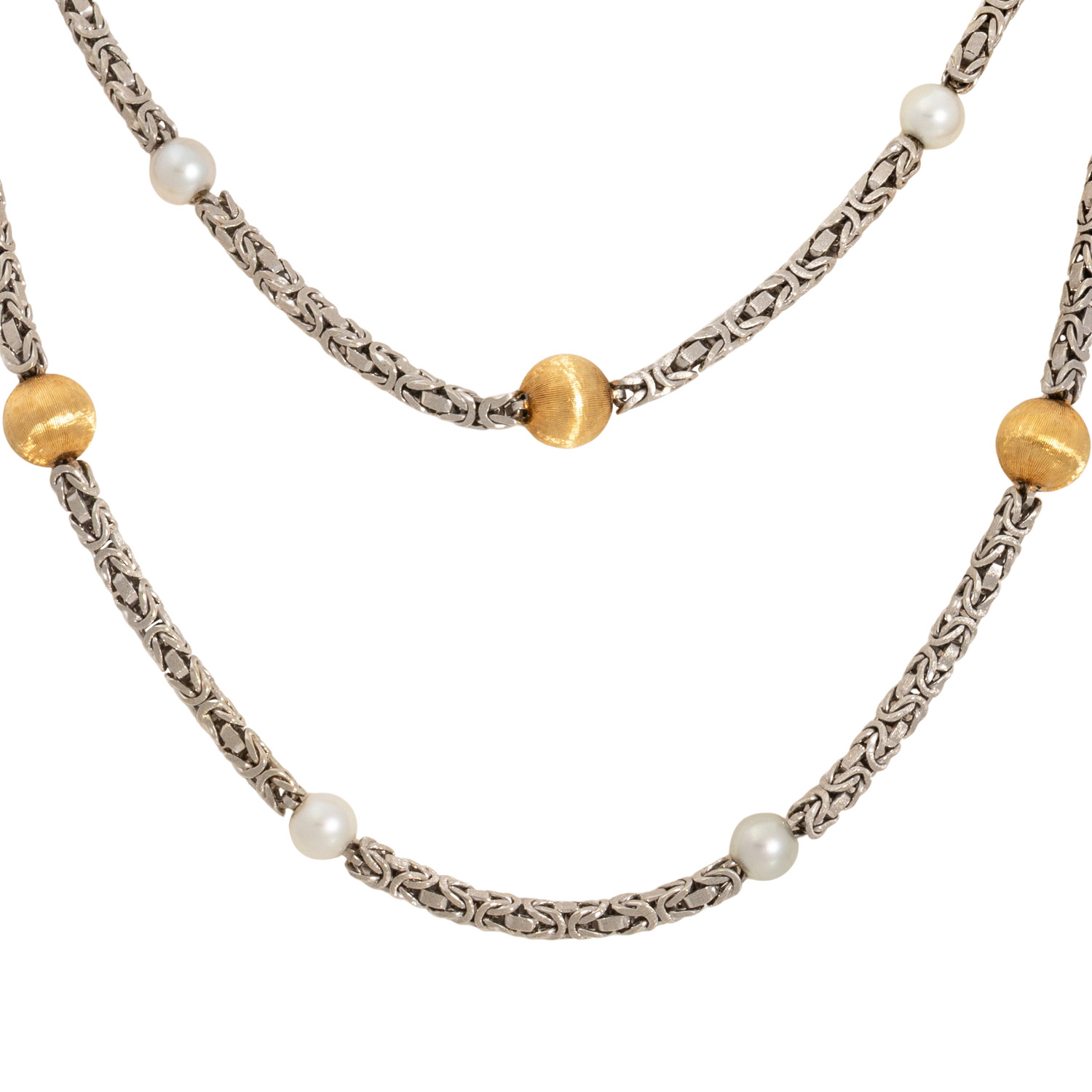 GG 18K, D: 10 mm, 14 lichtgraue Zuchtperlen, D: 7 mm, guter Lüster, WG 18K, 108,4 g, L: 106 cm, B (Kette): 3,5 mm, Kastenschloß mit Sicherungsacht, Ende 20. Jh., minimale Tragespuren.